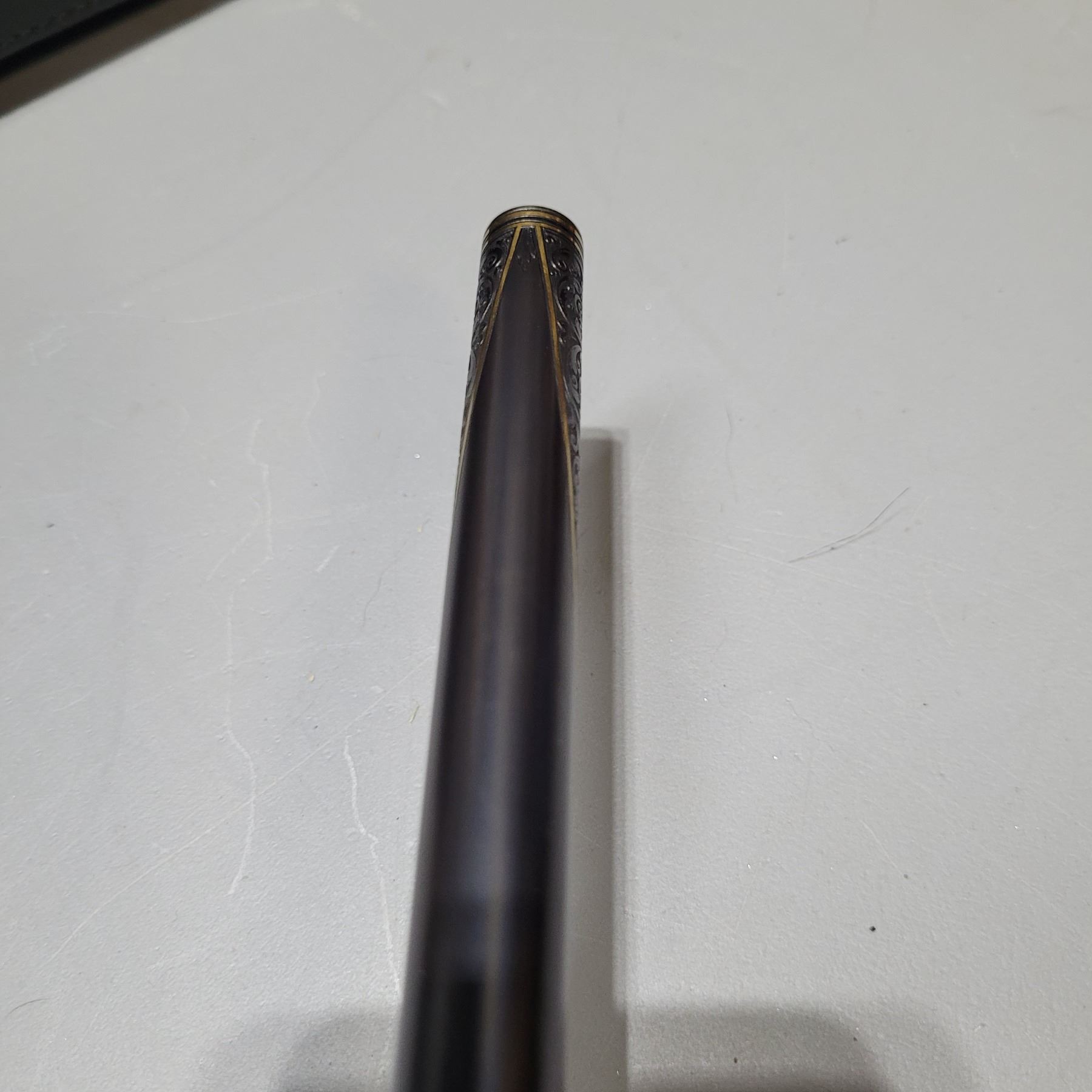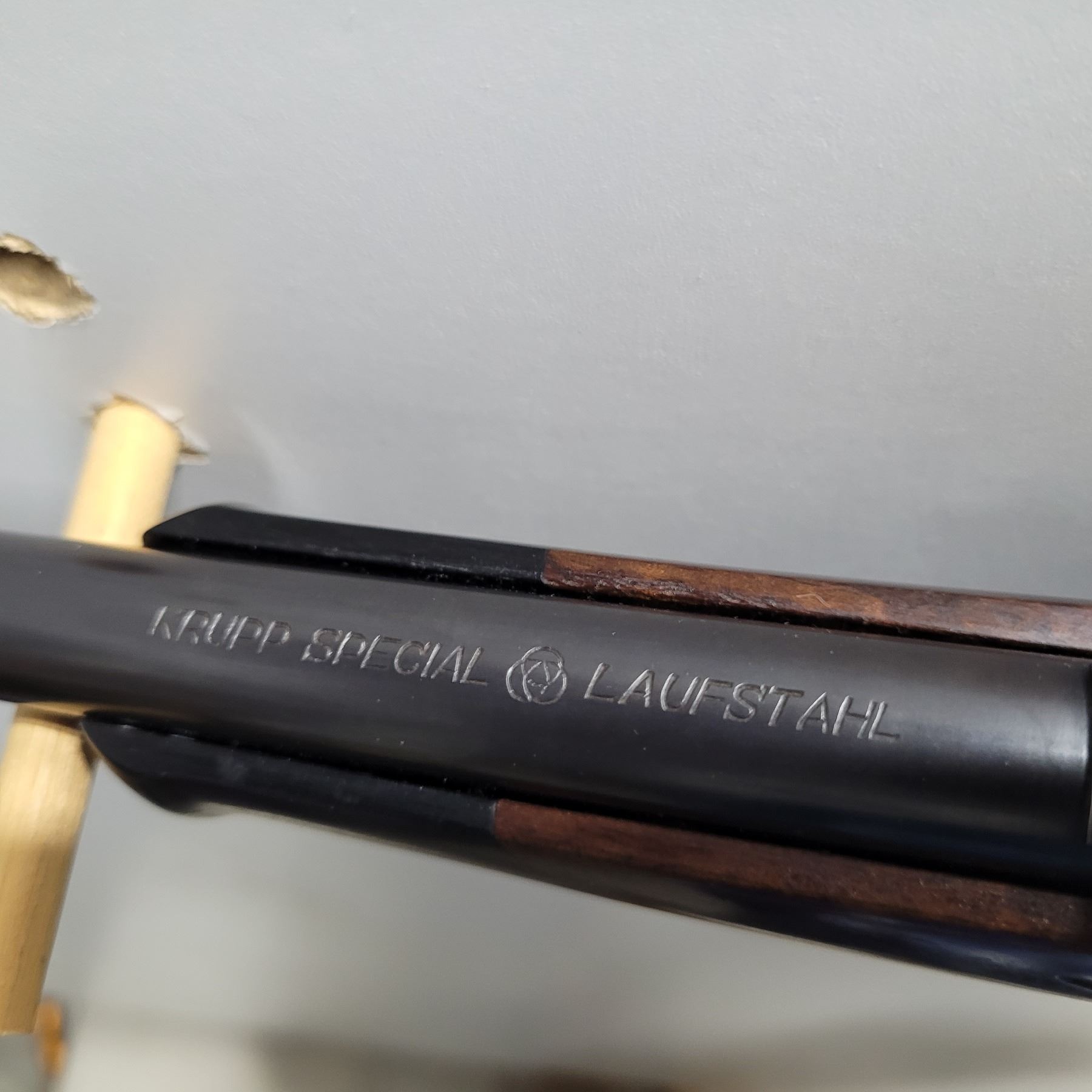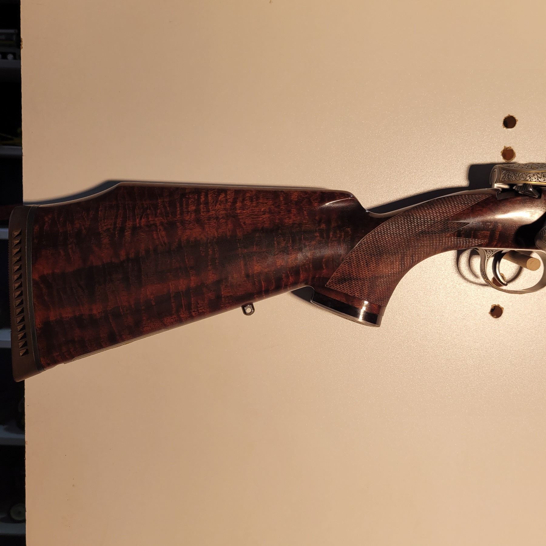 The rifle is a Heym Model SR 20N in 30-06 caliber made in Germany. The Barrel is 24" and appears to be in excellent condition. The stock is made of dark fiddleback and very dense walnut (Possibly European). The rifle has an ebony tip which has a very fine crack in it. It has wrap around checkering on the forearm and 2 panels on the grip. The stock has an oil finish. There is minor marks and safe kisses in the stock. The barrel has been rust blued and has front and rear ramp sights that have been scroll engraved with gold highlights. The exterior of the action, and bolt shroud and scope rings and bases have 100% engraved coverage. The surface of the trigger guard and floorplate have approx. 95% engraved coverage with a gold Whitetail Deer and fleur-de-lis inlays. The grip cap also has 100% engraved coverage with H H gold inlay. There also is an engraved cartridge box installed in the buttstock.
