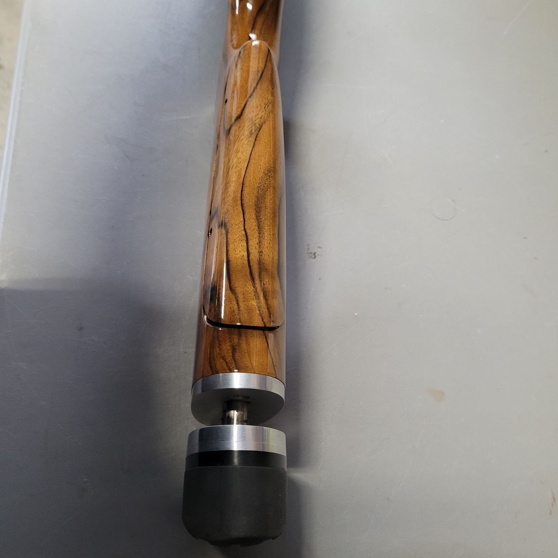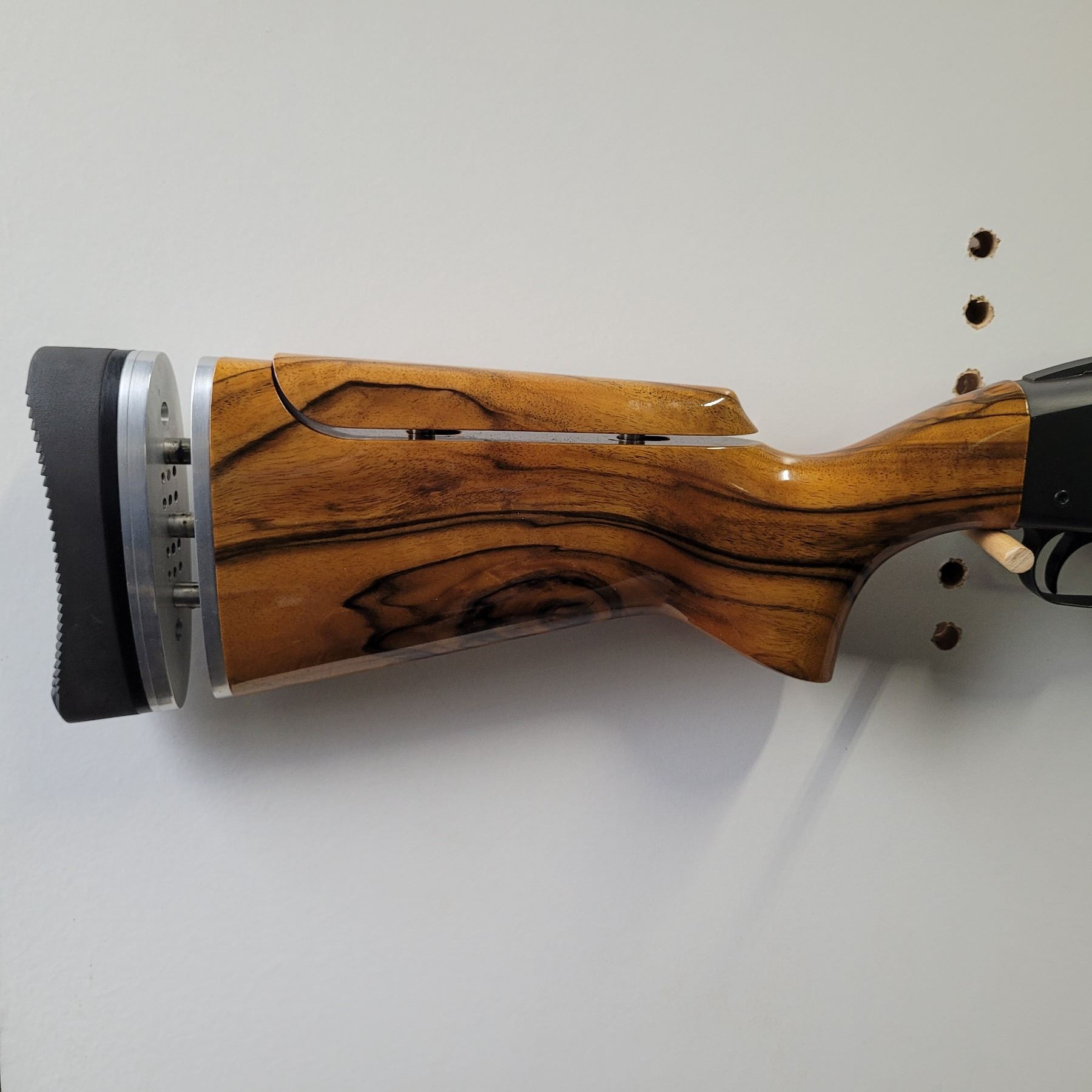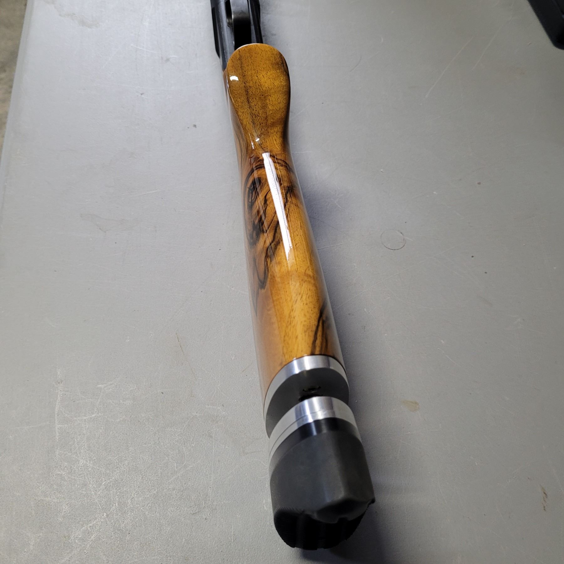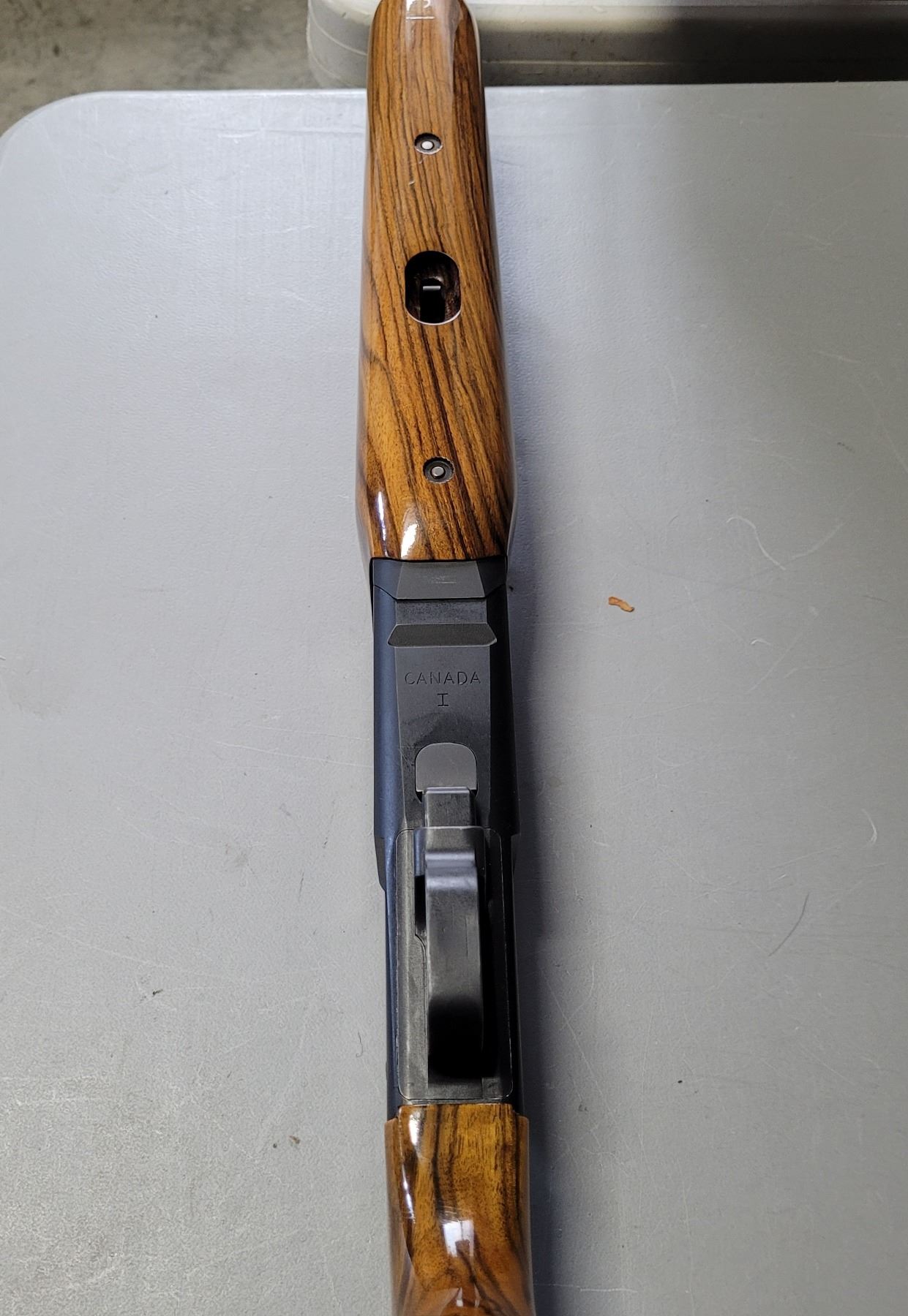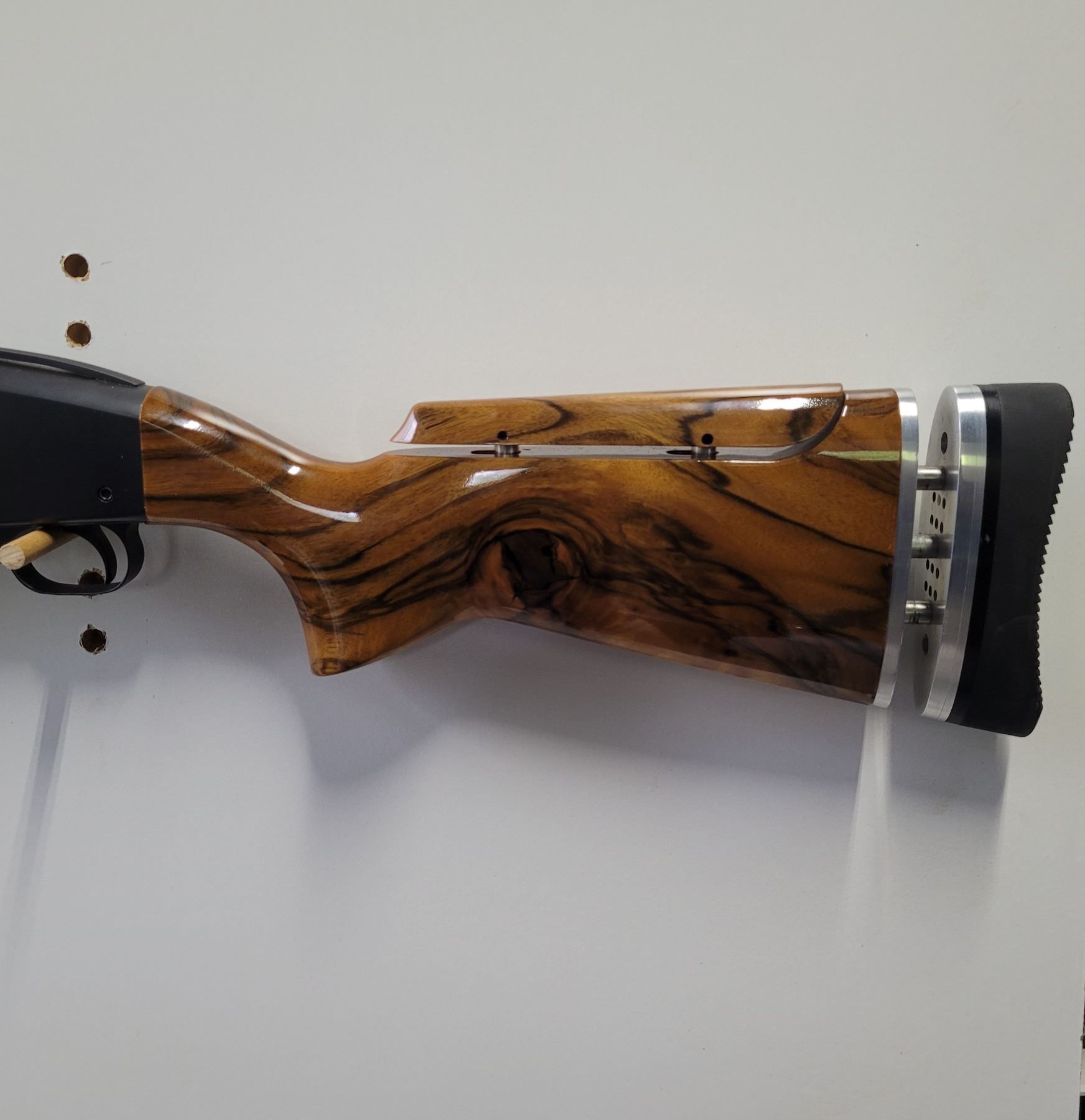 The stock has an adjustable comb, with a recoil reducing system. Stock has extra fancy wood, possibly French walnut. Stock is in very good condition with a small dent on the forearm, see photo.