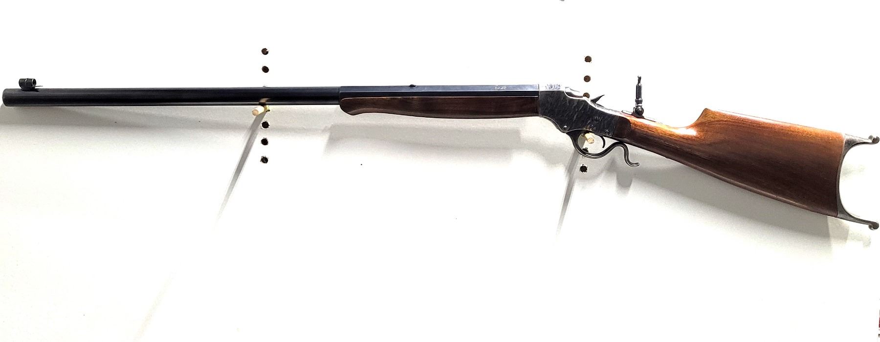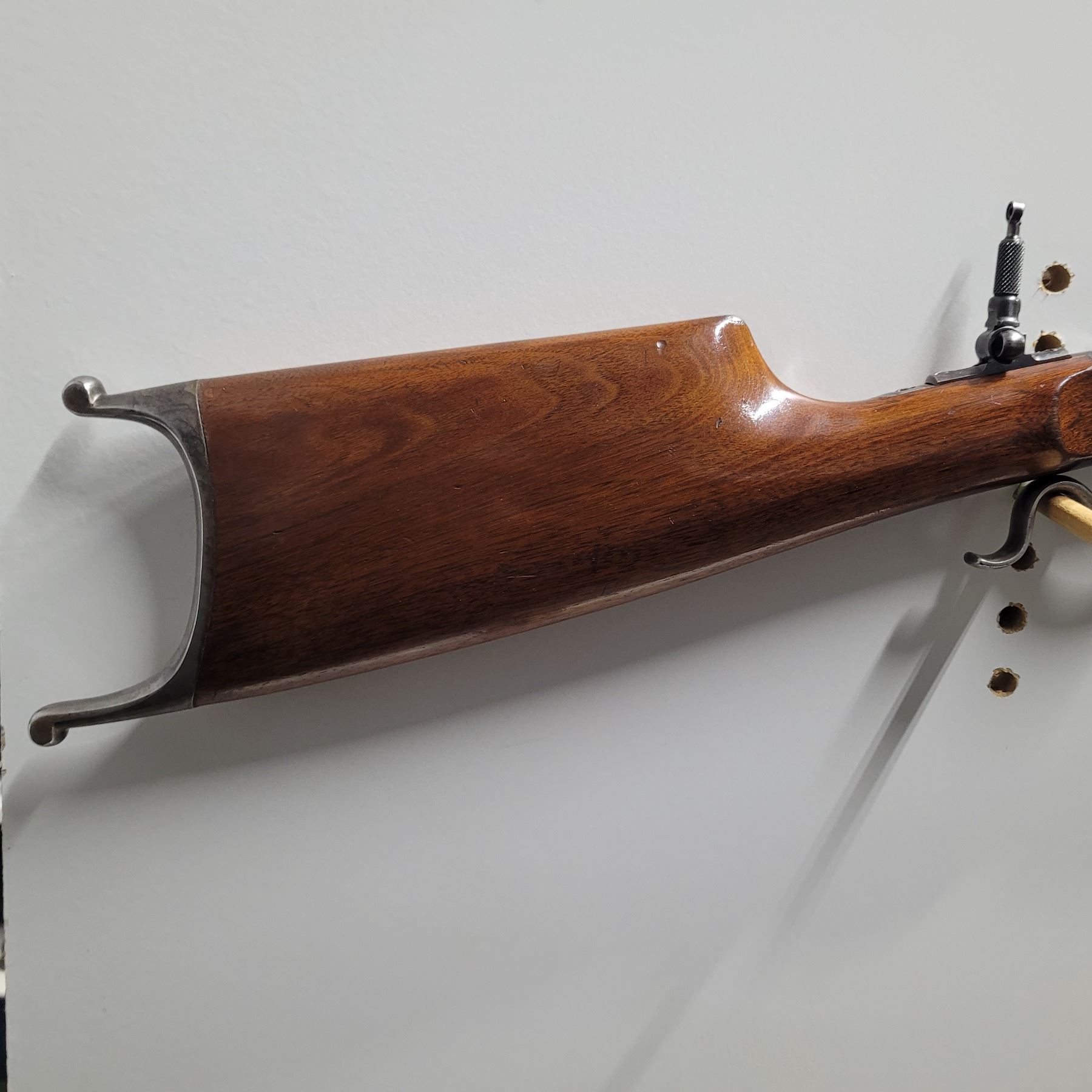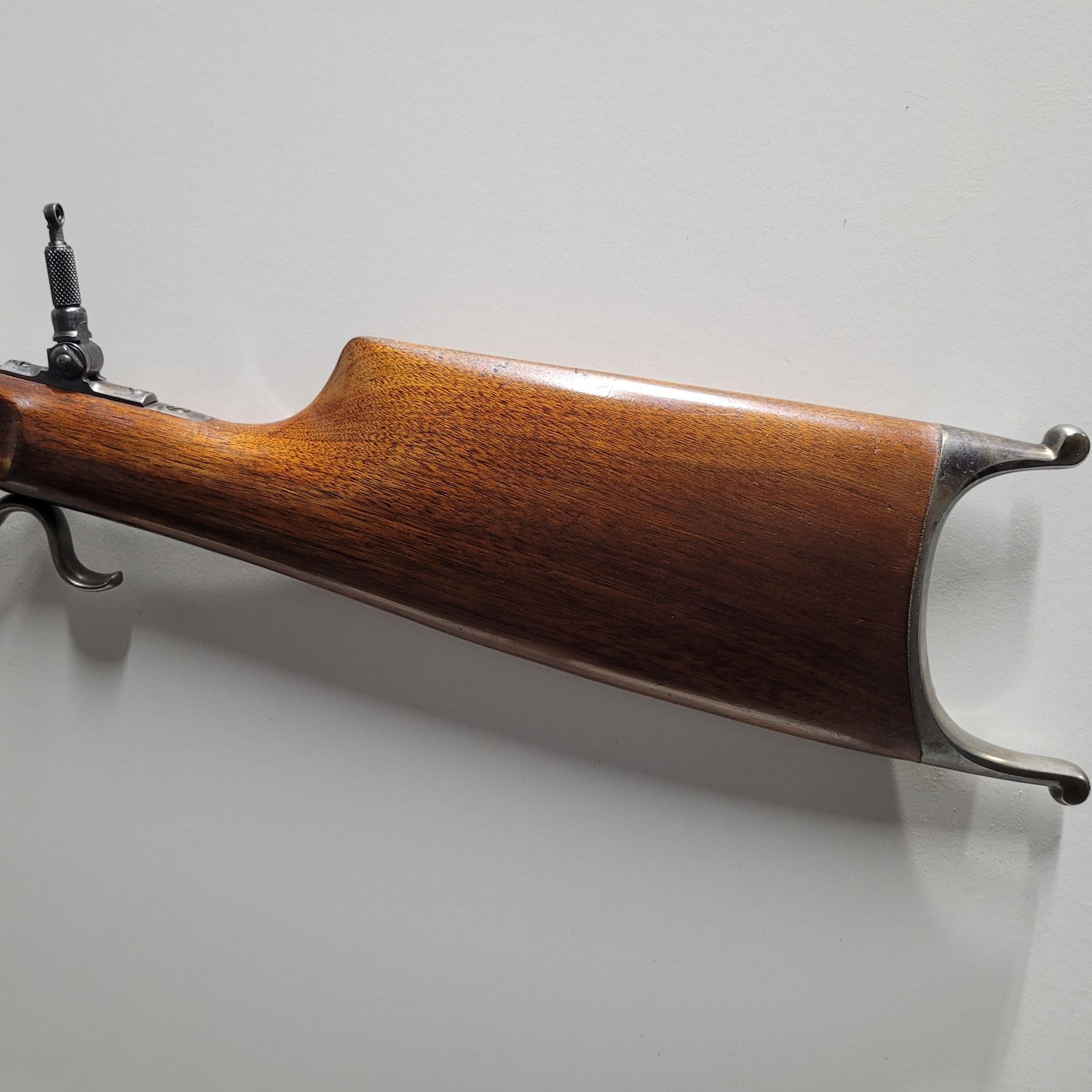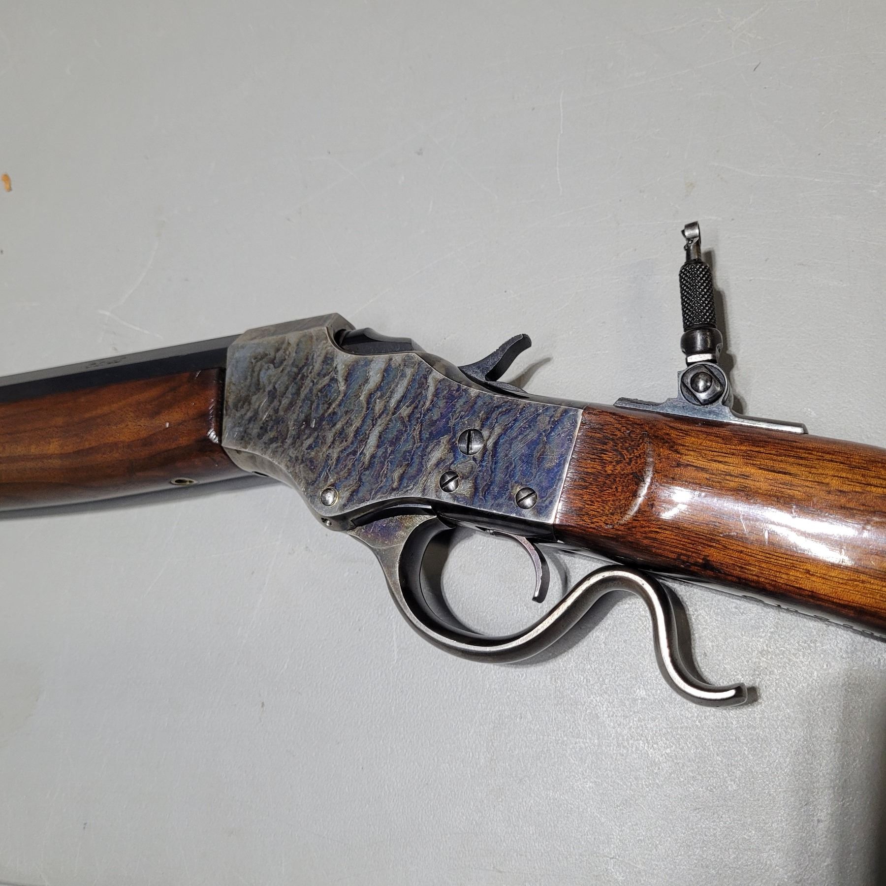 Used Stevens 45 Range 44 1/2 Single Shot Rifle in 32-40 Caliber. This rifle has an half octagon half round 30" barrel with an excellent bore. The bluing is excellent with minor wear at the muzzle. The case colours are vibrant on the receiver. The colours on the schuetzen buttplate and lever are worn on some areas. The stock is in very good condition with some minor dents and scratches. It has a globe front sight and a rear tang sight. The rear sight was replaced with a blank. Overall a beautiful rifle.