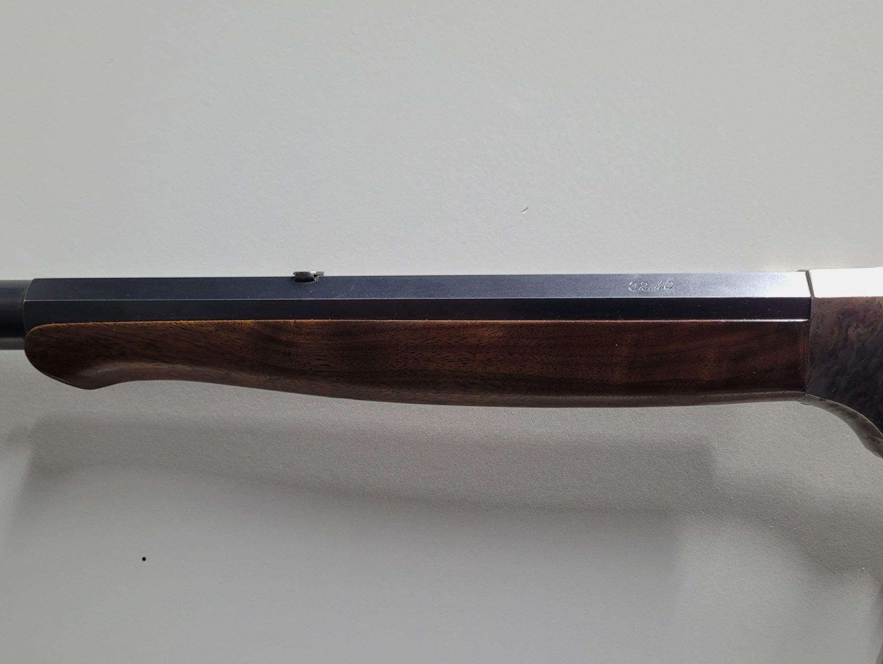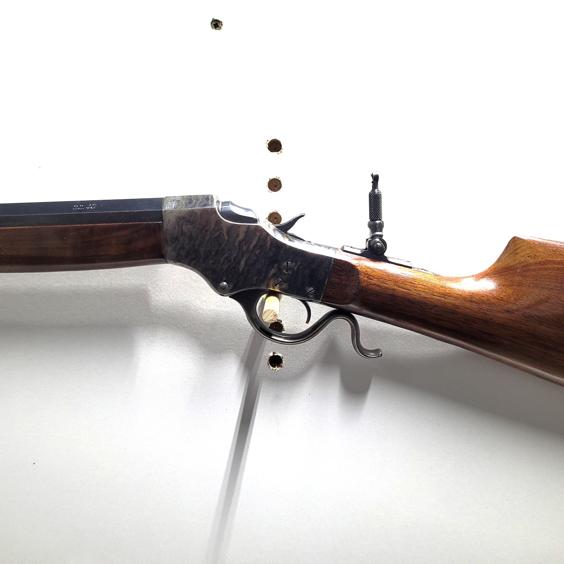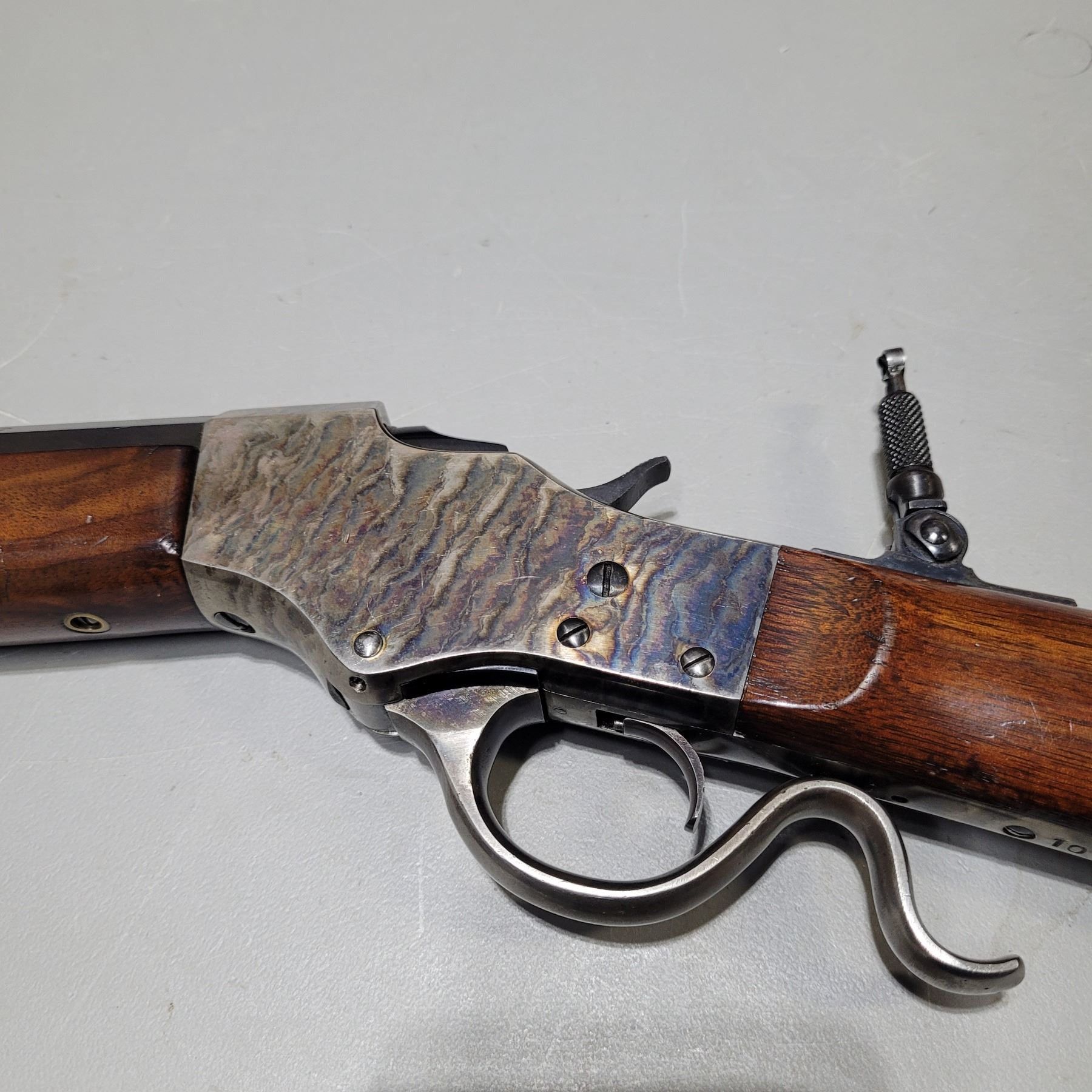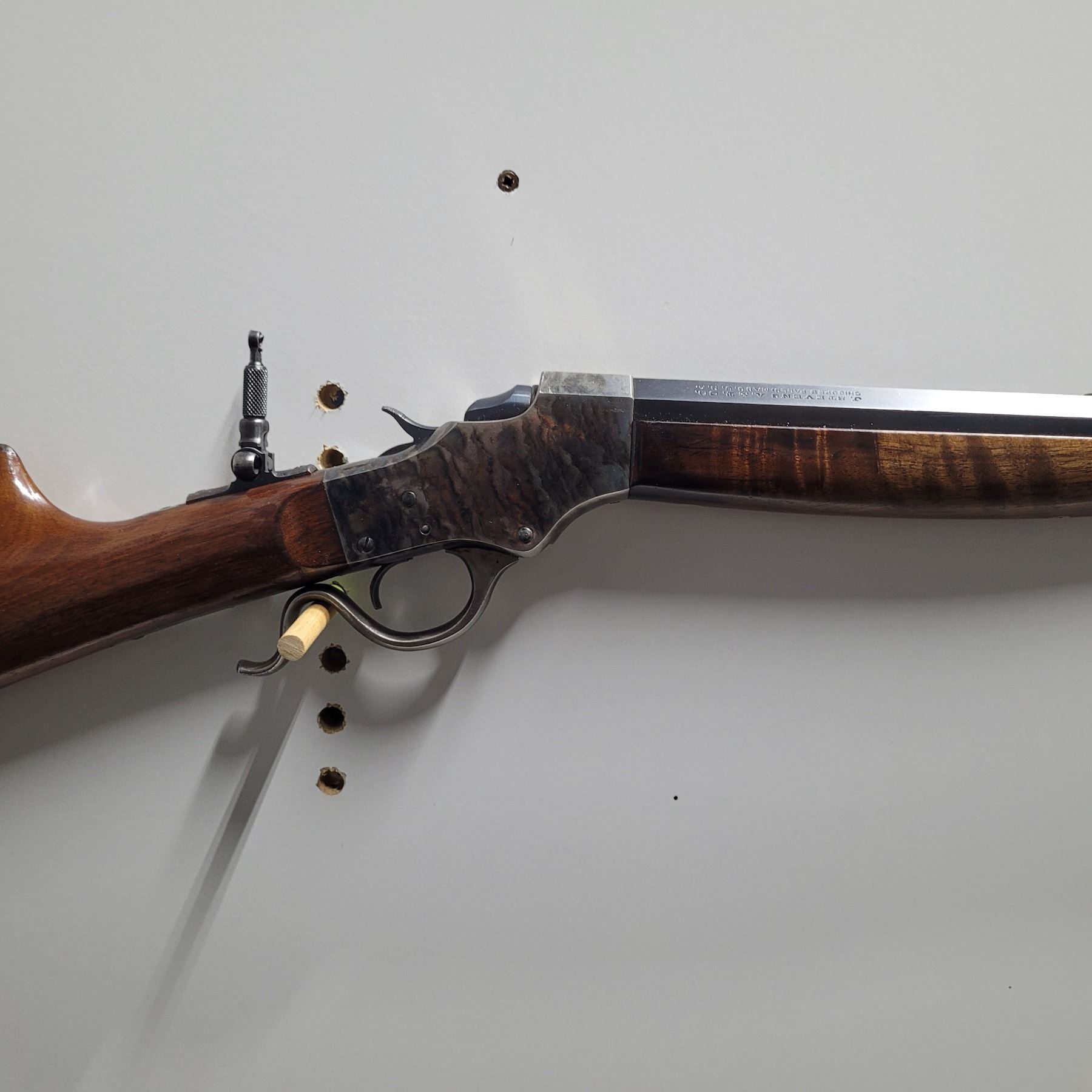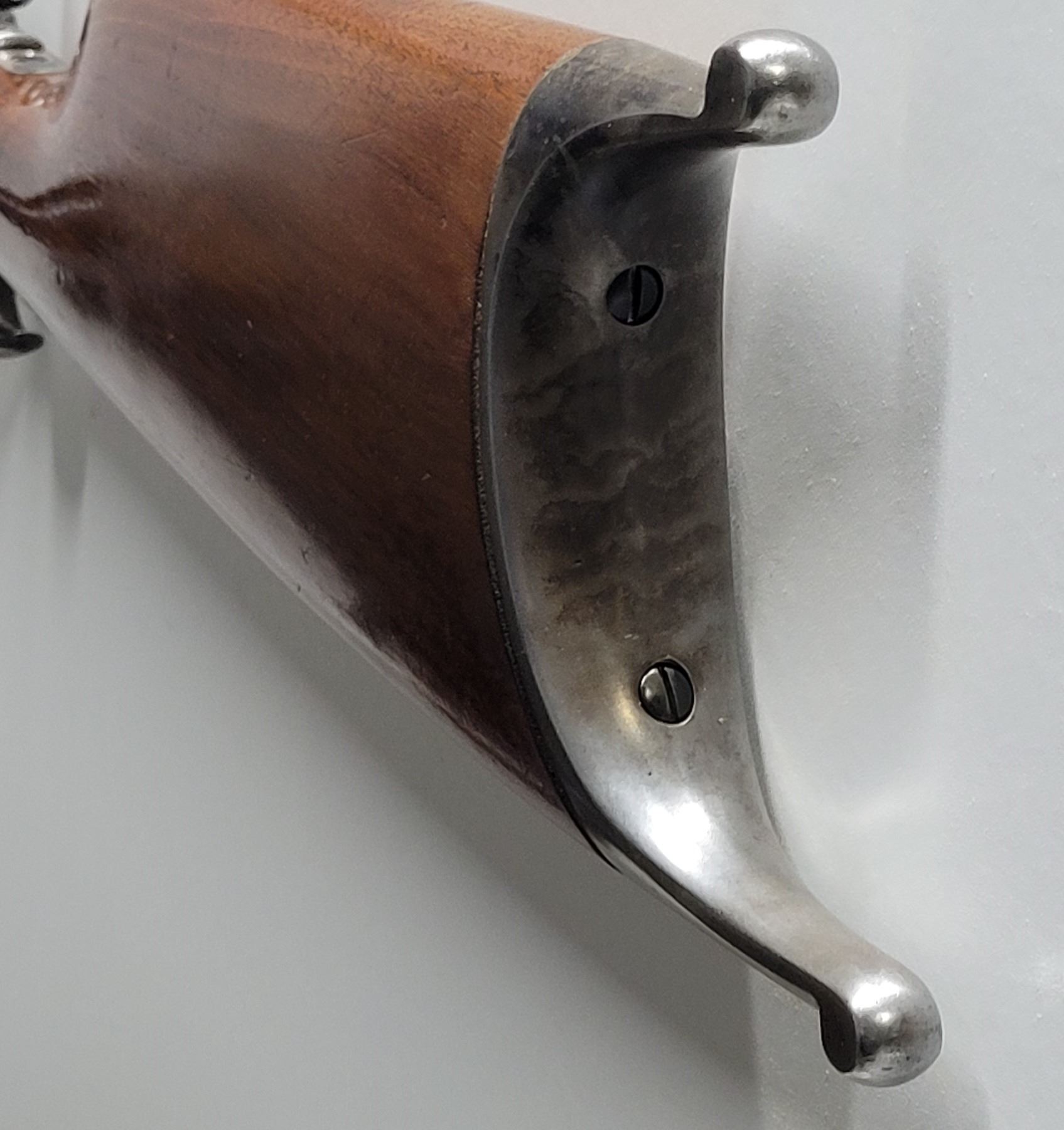 Used Stevens 45 Range 44 1/2 Single Shot Rifle in 32-40 Caliber. This rifle has an half octagon half round 30" barrel with an excellent bore. The bluing is excellent with minor wear at the muzzle. The case colours are vibrant on the receiver. The colours on the schuetzen buttplate and lever are worn on some areas. The stock is in very good condition with some minor dents and scratches. It has a globe front sight and a rear tang sight. The rear sight was replaced with a blank. Overall a beautiful rifle.