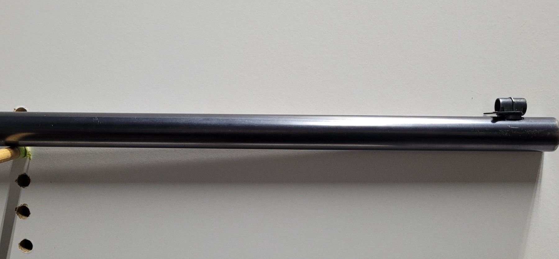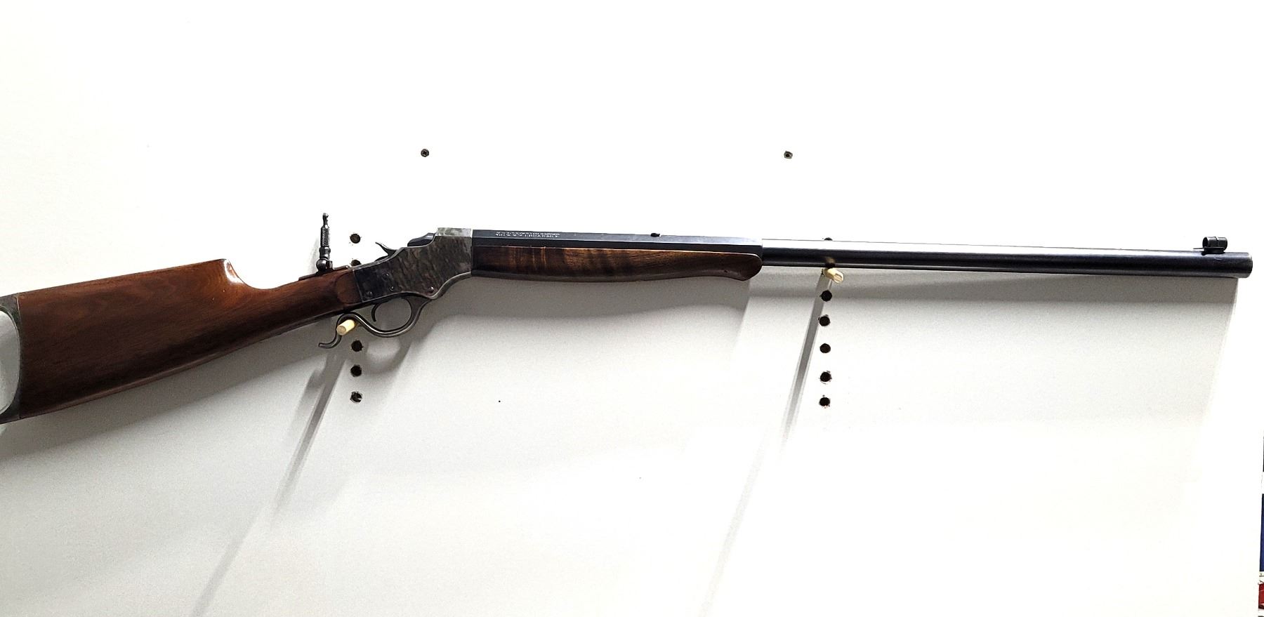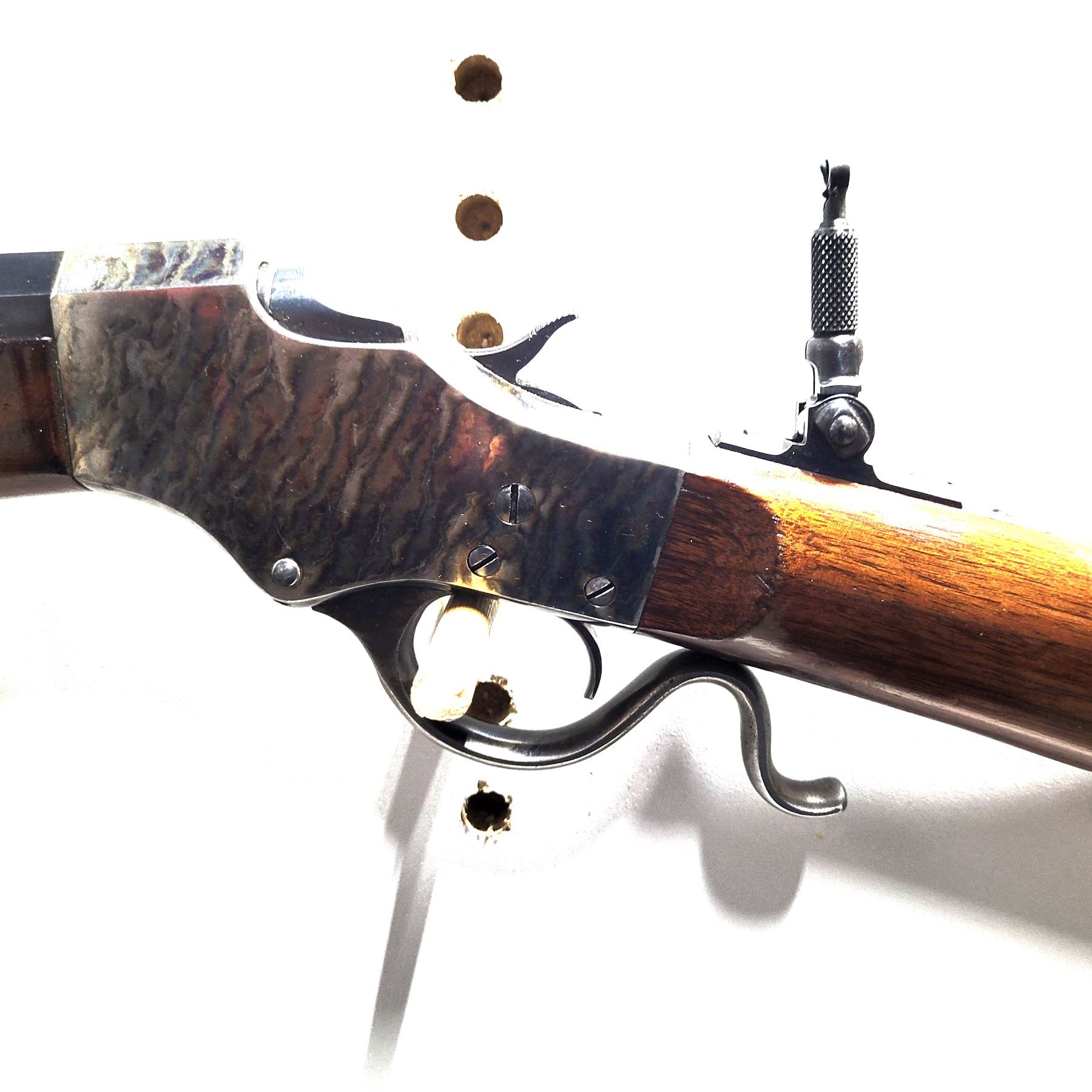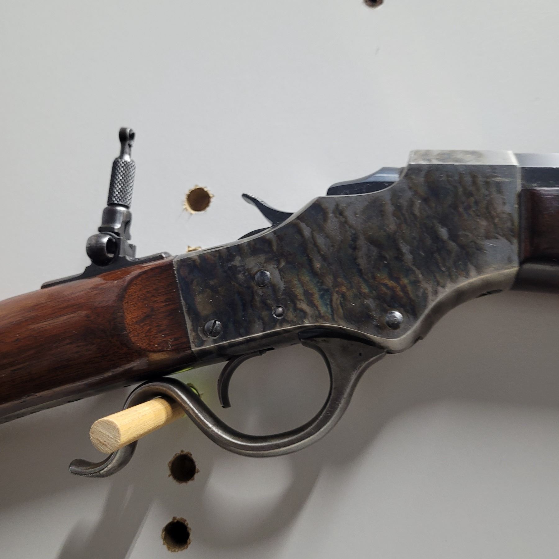 Used Stevens 45 Range 44 1/2 Single Shot Rifle in 32-40 Caliber. This rifle has an half octagon half round 30" barrel with an excellent bore. The bluing is excellent with minor wear at the muzzle. The case colours are vibrant on the receiver. The colours on the schuetzen buttplate and lever are worn on some areas. The stock is in very good condition with some minor dents and scratches. It has a globe front sight and a rear tang sight. The rear sight was replaced with a blank. Overall a beautiful rifle.
