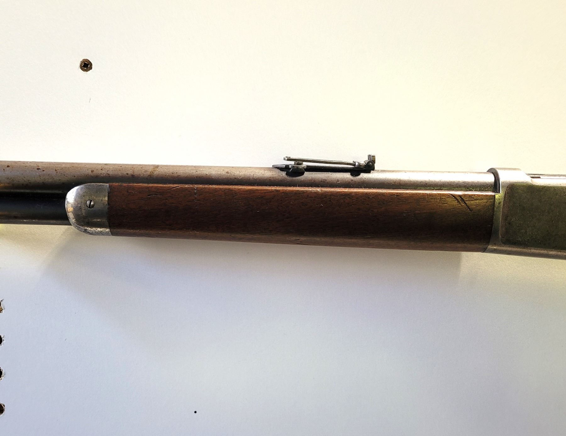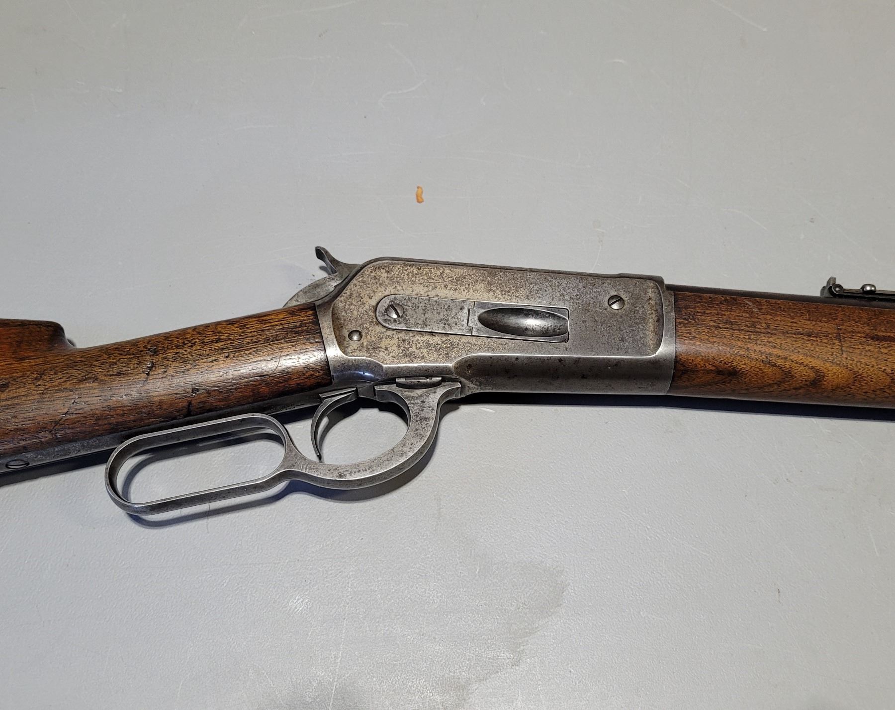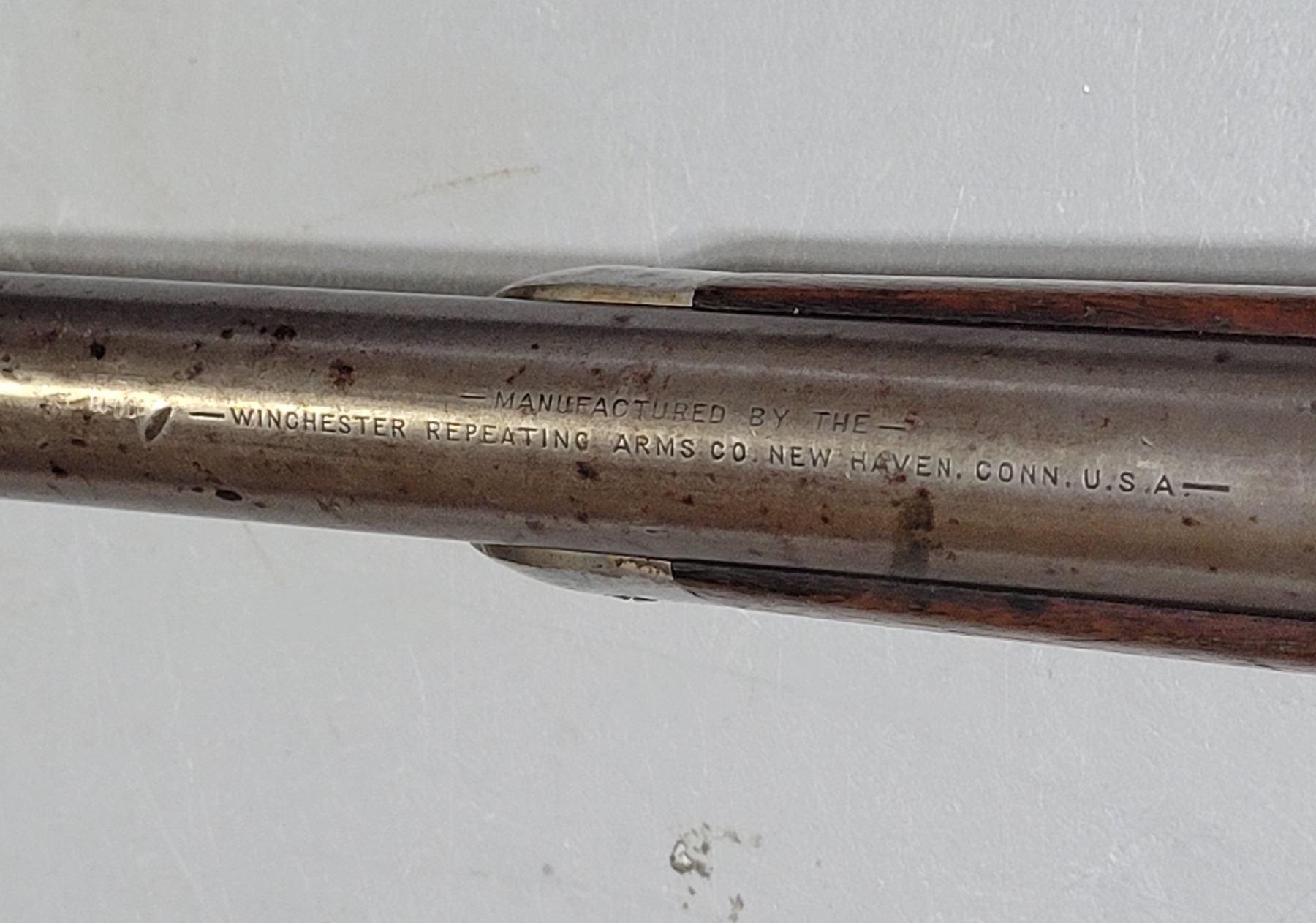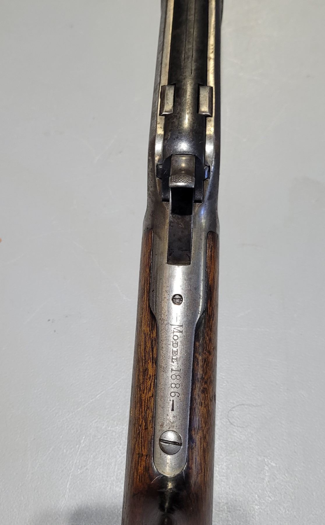 Used Winchester Model 1886 Rifle in 45-70. Serial #82789. This is an original 1886 with a 30" round barrel and full length magazine. Has a strong half and full cock hammer positions. The bore is dark with some frosting and prominent rifling. This should be a good shooter. The bluing has faded to a grey patina. Mechanically its in good condition. The stocks are have NO cracks, but do have dents and scratches. See Photos. Has the standard front sight with an 1886 marked rear ladder sight. Looks to be a good honest 1886.