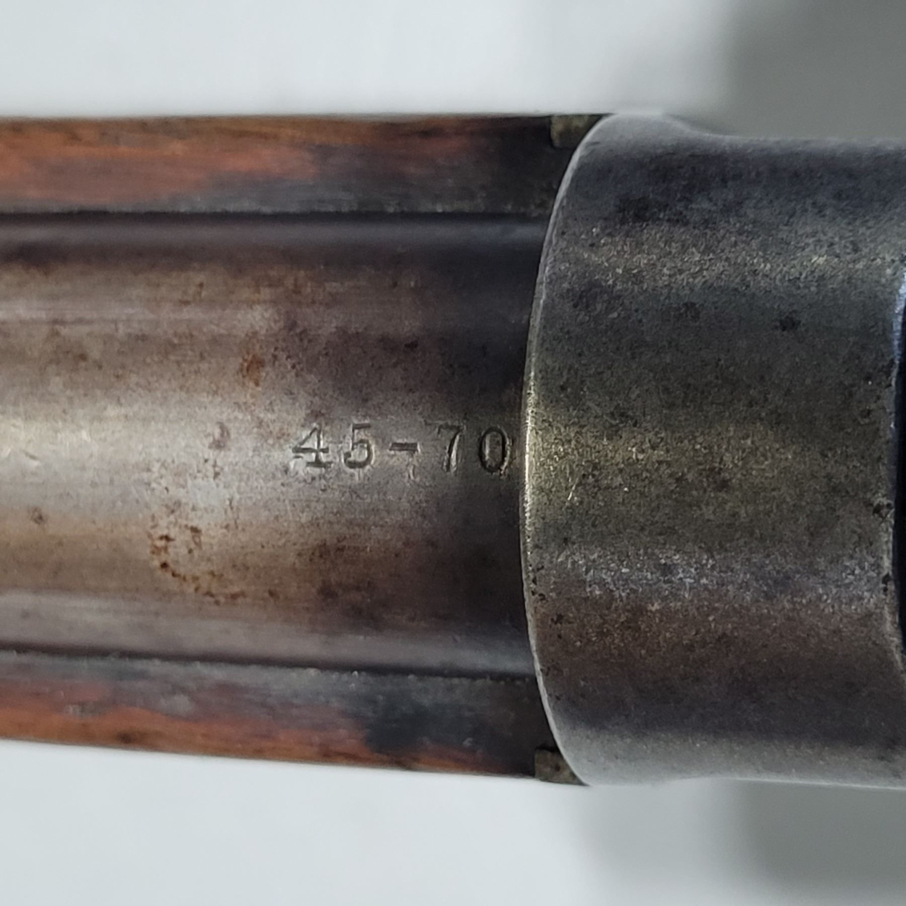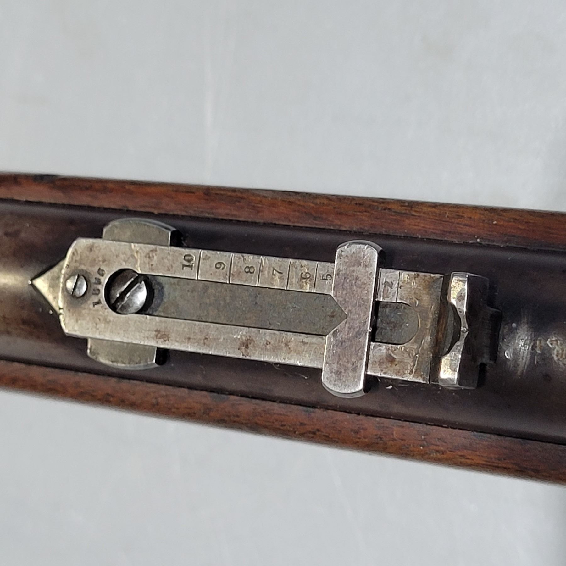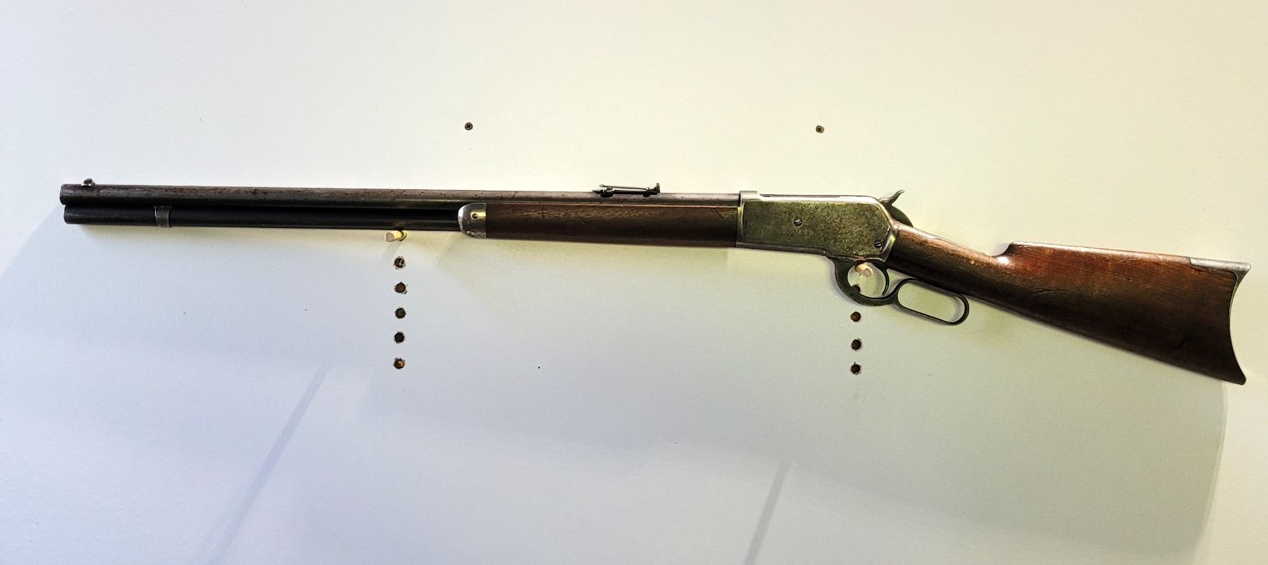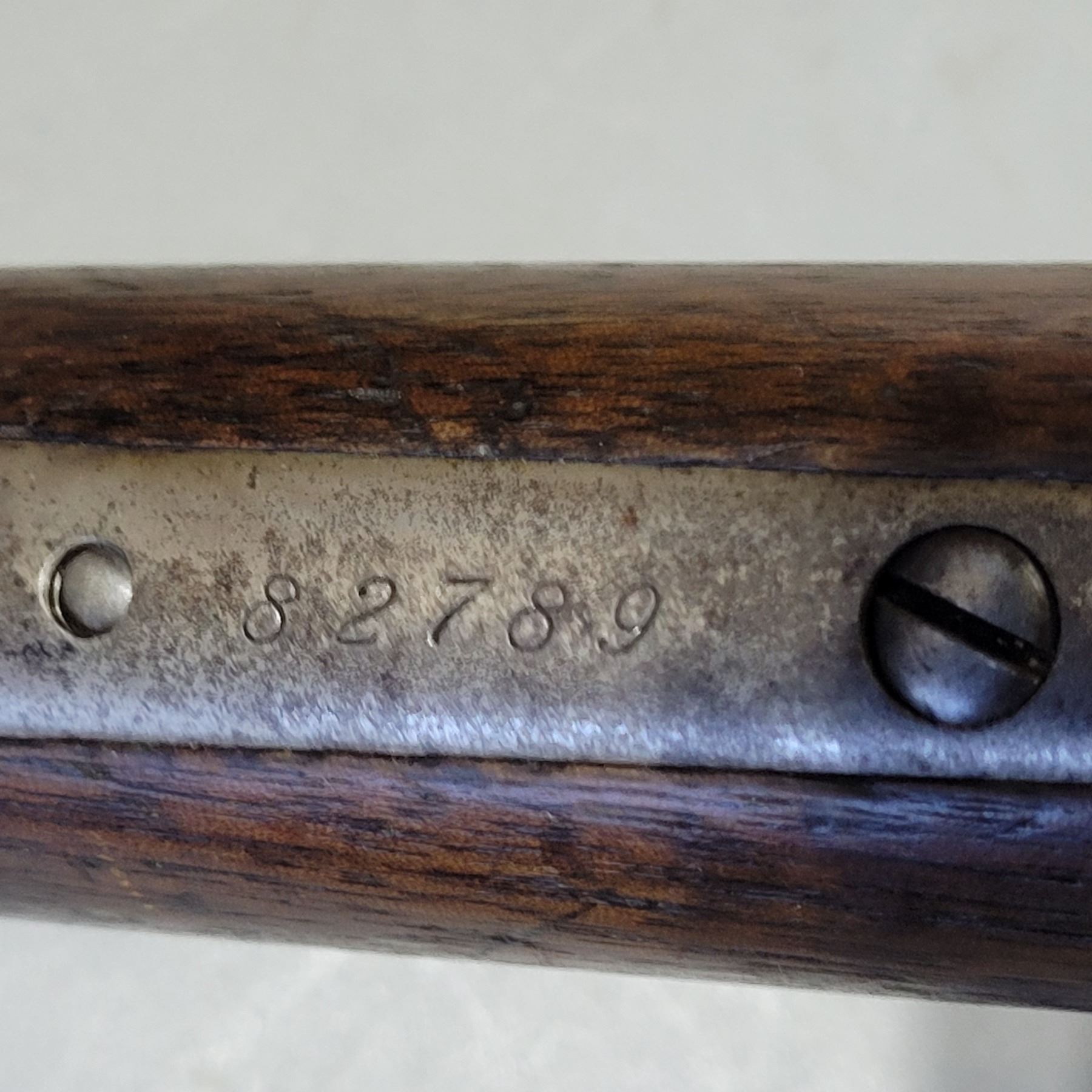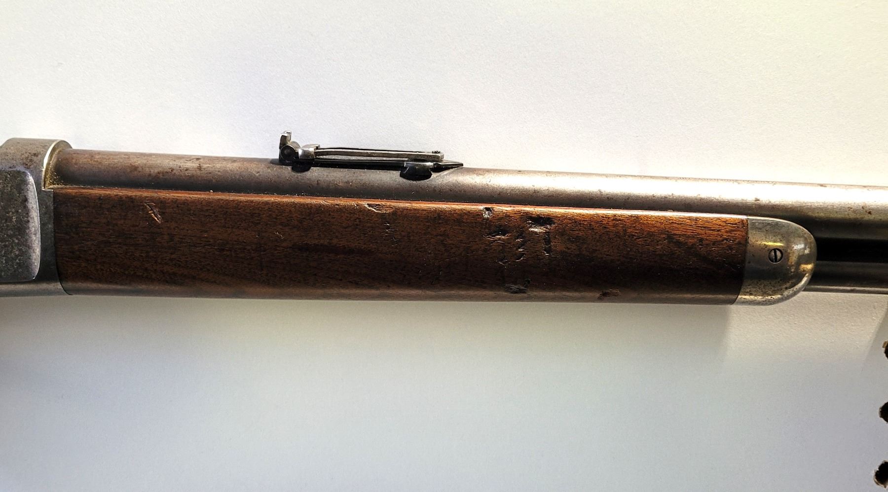 Used Winchester Model 1886 Rifle in 45-70. Serial #82789. This is an original 1886 with a 30" round barrel and full length magazine. Has a strong half and full cock hammer positions. The bore is dark with some frosting and prominent rifling. This should be a good shooter. The bluing has faded to a grey patina. Mechanically its in good condition. The stocks are have NO cracks, but do have dents and scratches. See Photos. Has the standard front sight with an 1886 marked rear ladder sight. Looks to be a good honest 1886.