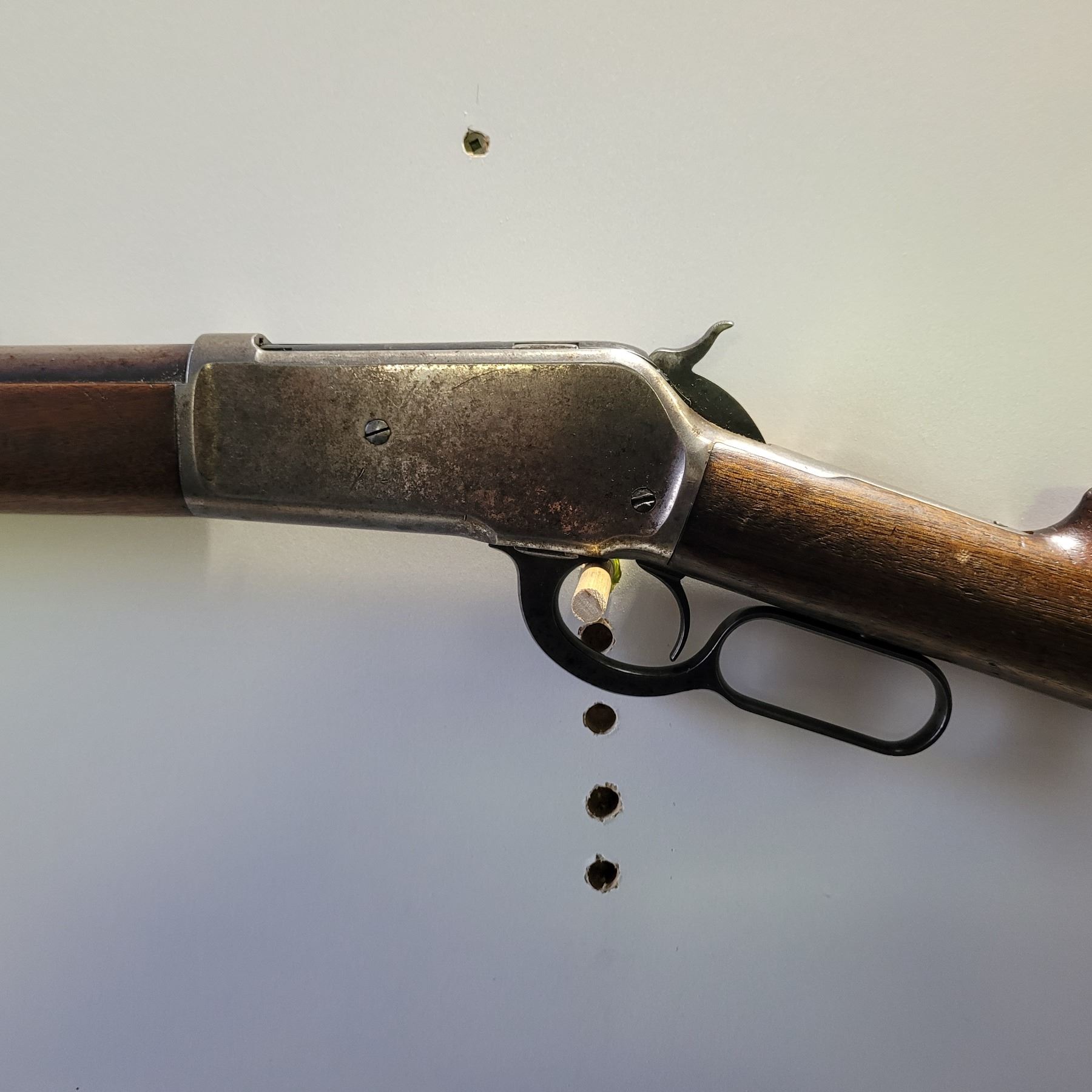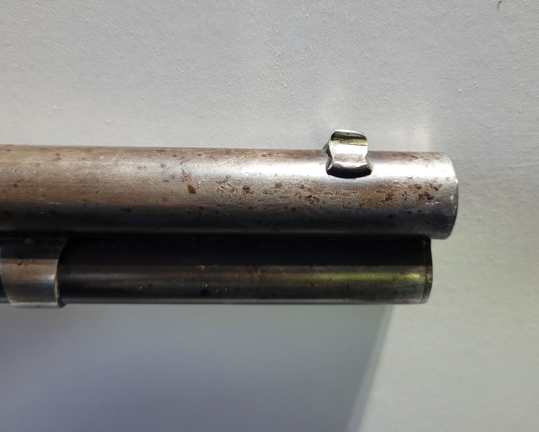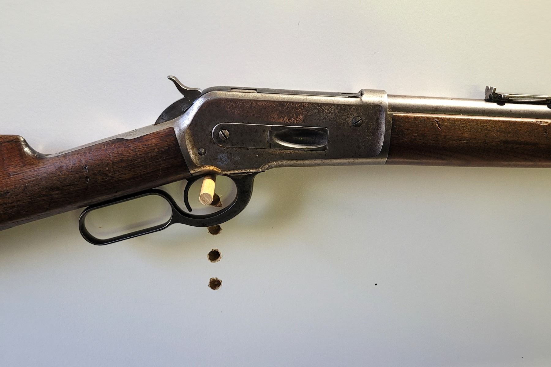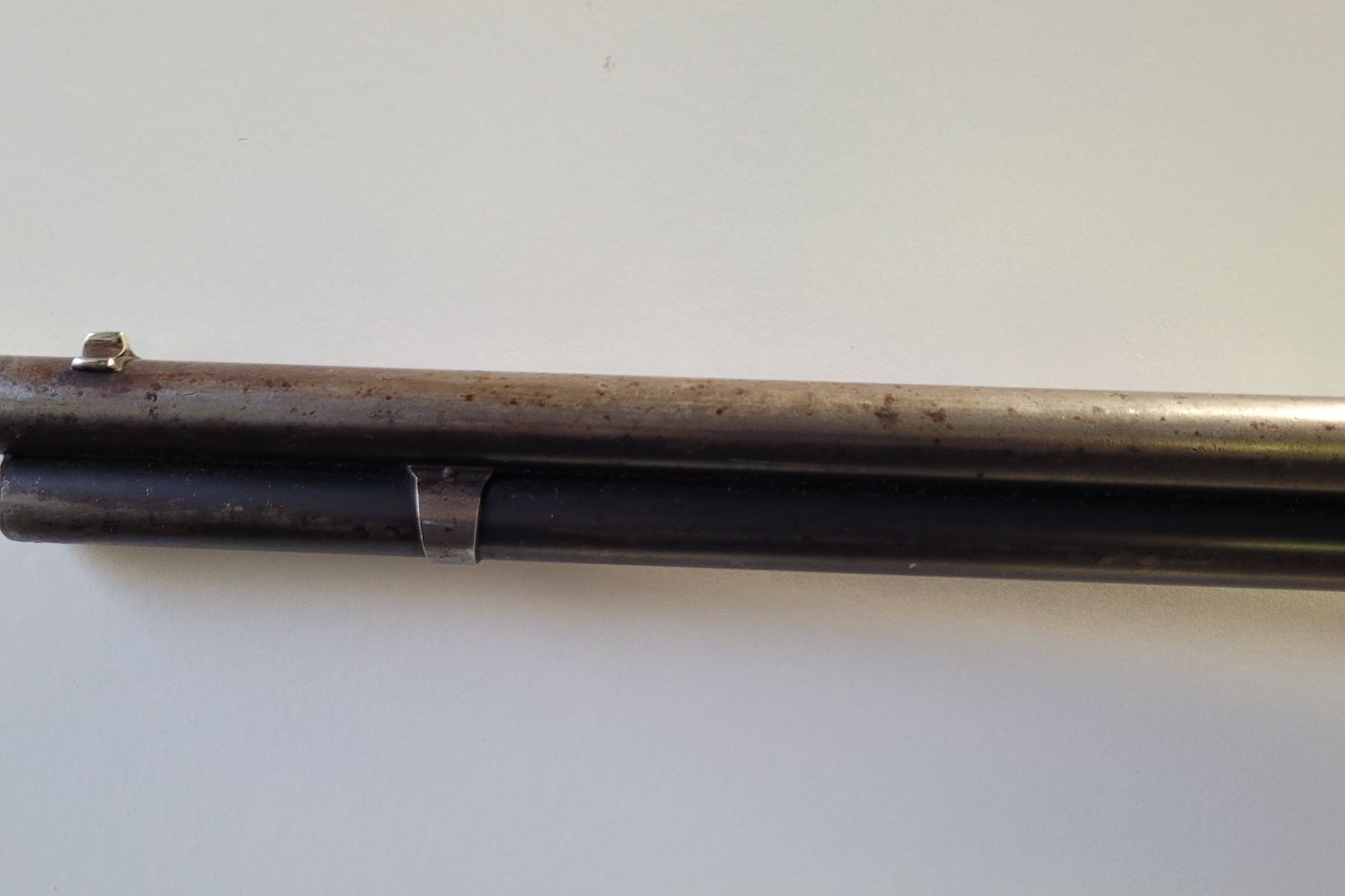 Used Winchester Model 1886 Rifle in 45-70. Serial #82789. This is an original 1886 with a 30" round barrel and full length magazine. Has a strong half and full cock hammer positions. The bore is dark with some frosting and prominent rifling. This should be a good shooter. The bluing has faded to a grey patina. Mechanically its in good condition. The stocks are have NO cracks, but do have dents and scratches. See Photos. Has the standard front sight with an 1886 marked rear ladder sight. Looks to be a good honest 1886.