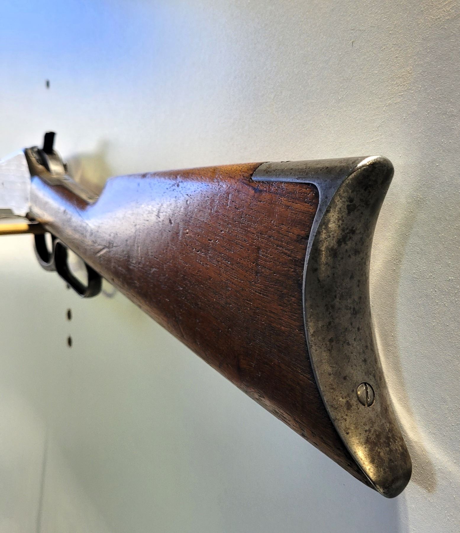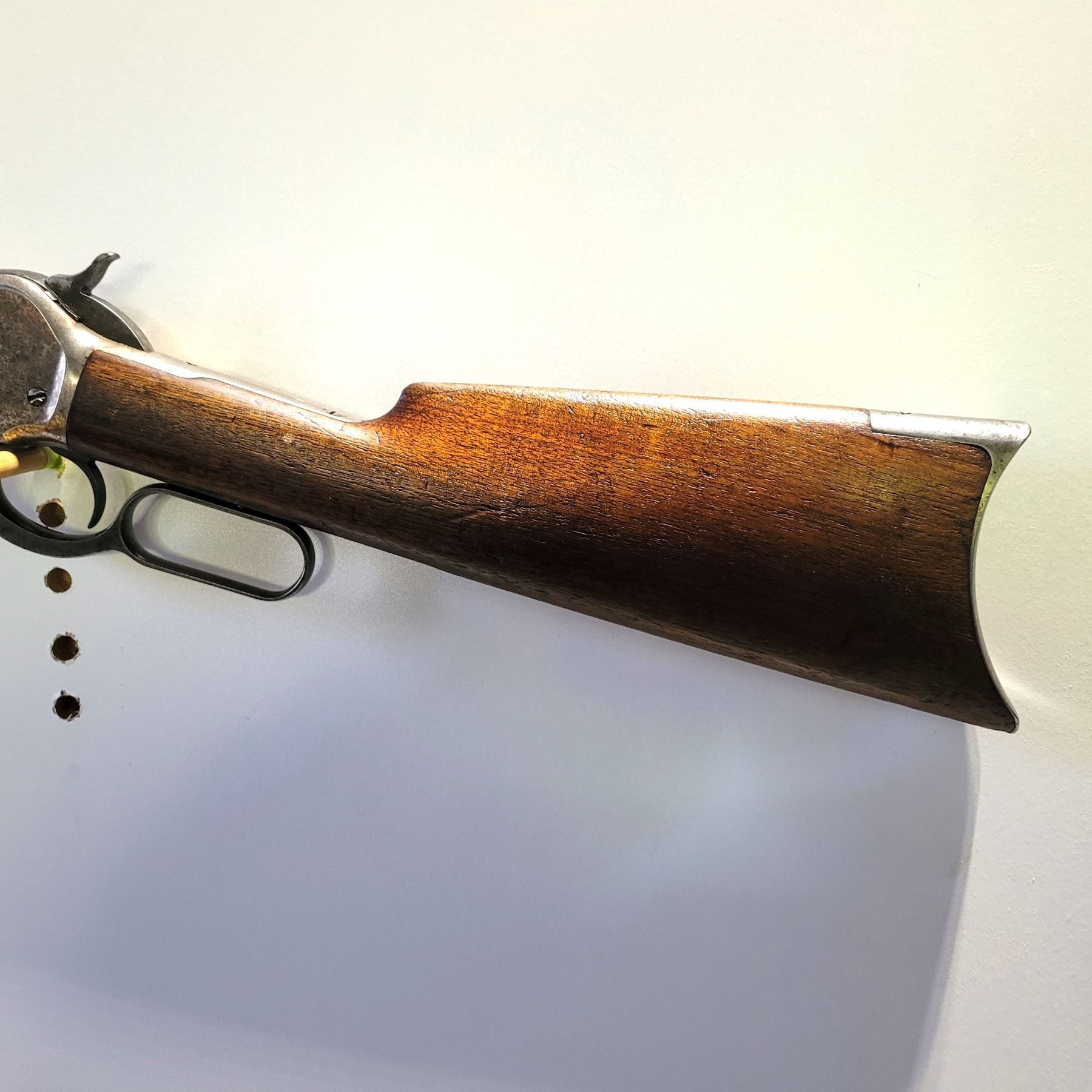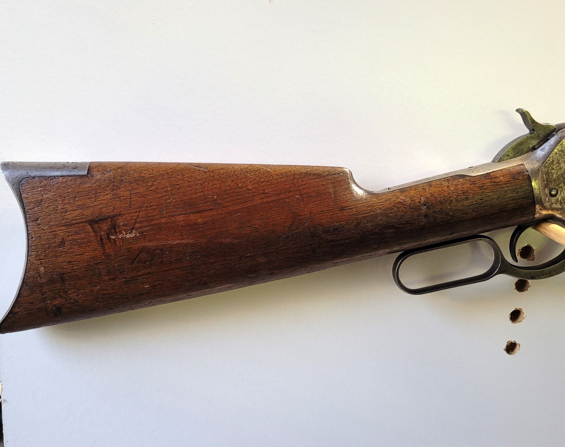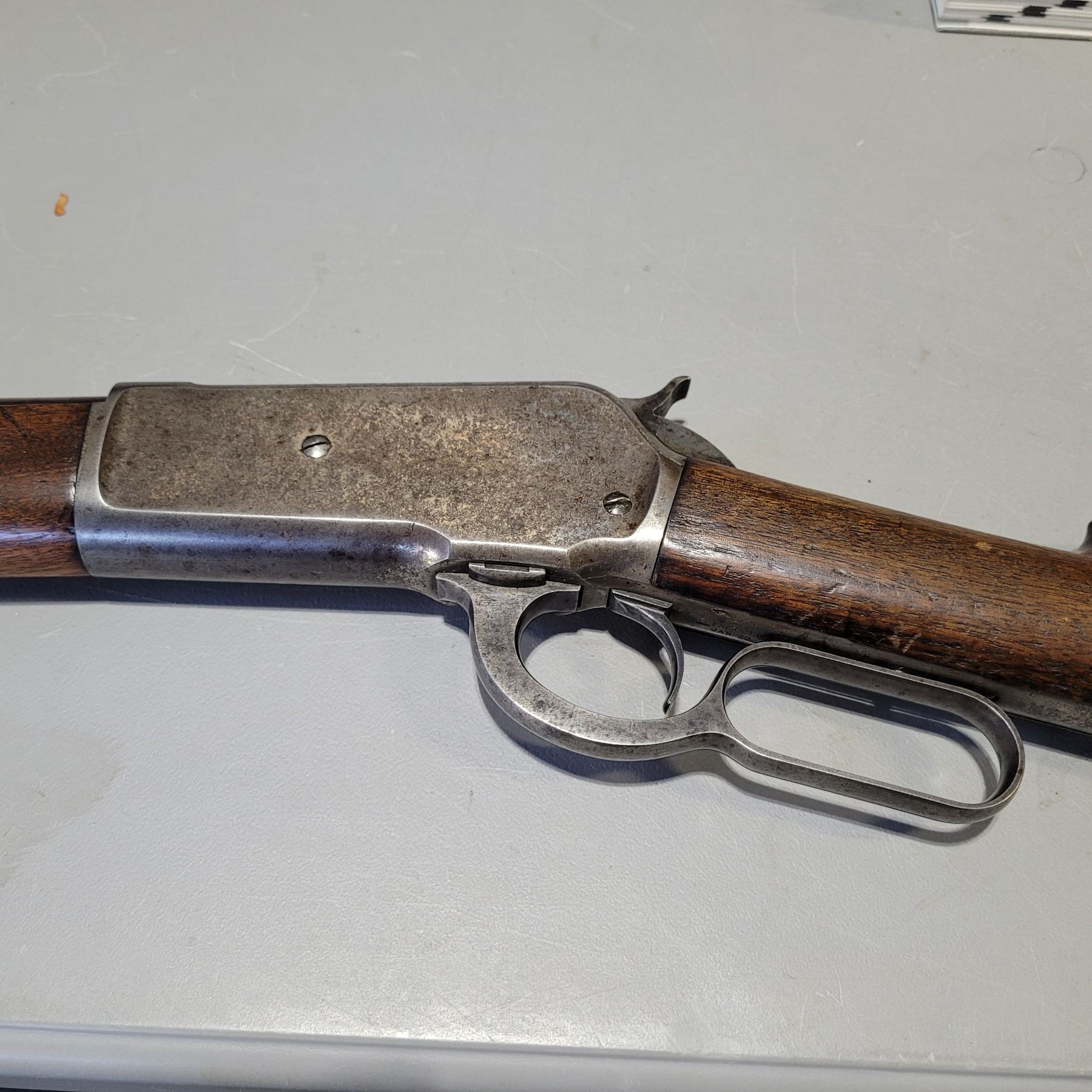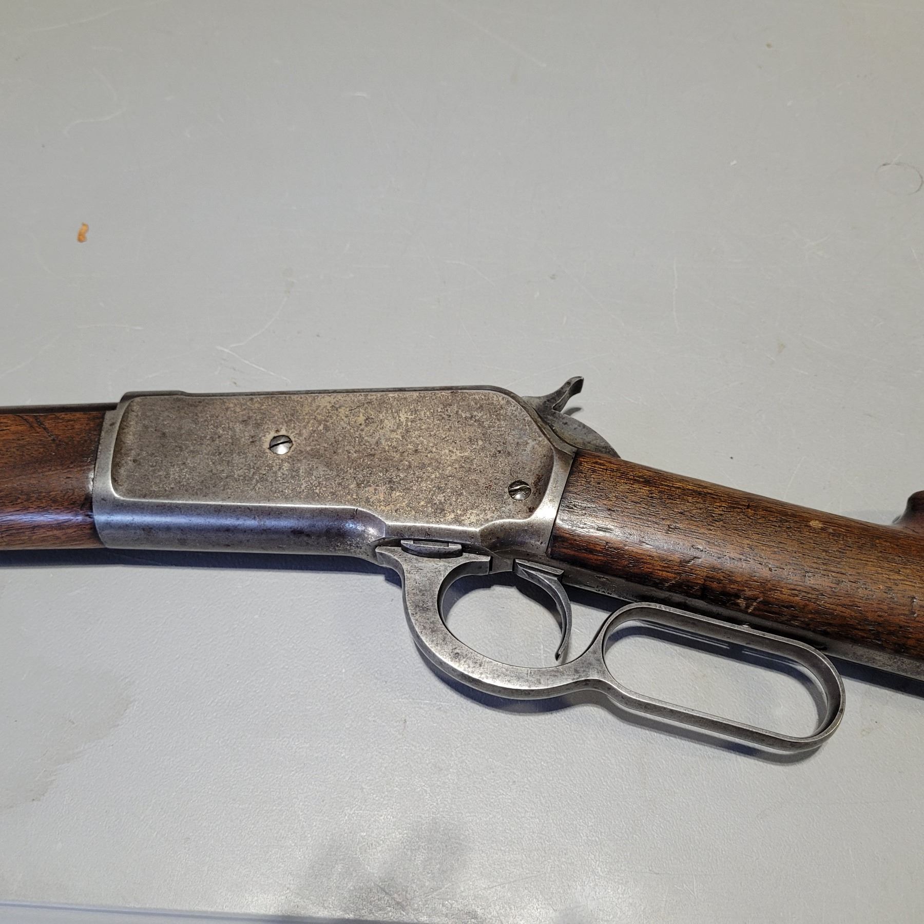 Used Winchester Model 1886 Rifle in 45-70. Serial #82789. This is an original 1886 with a 30" round barrel and full length magazine. Has a strong half and full cock hammer positions. The bore is dark with some frosting and prominent rifling. This should be a good shooter. The bluing has faded to a grey patina. Mechanically its in good condition. The stocks are have NO cracks, but do have dents and scratches. See Photos. Has the standard front sight with an 1886 marked rear ladder sight. Looks to be a good honest 1886.