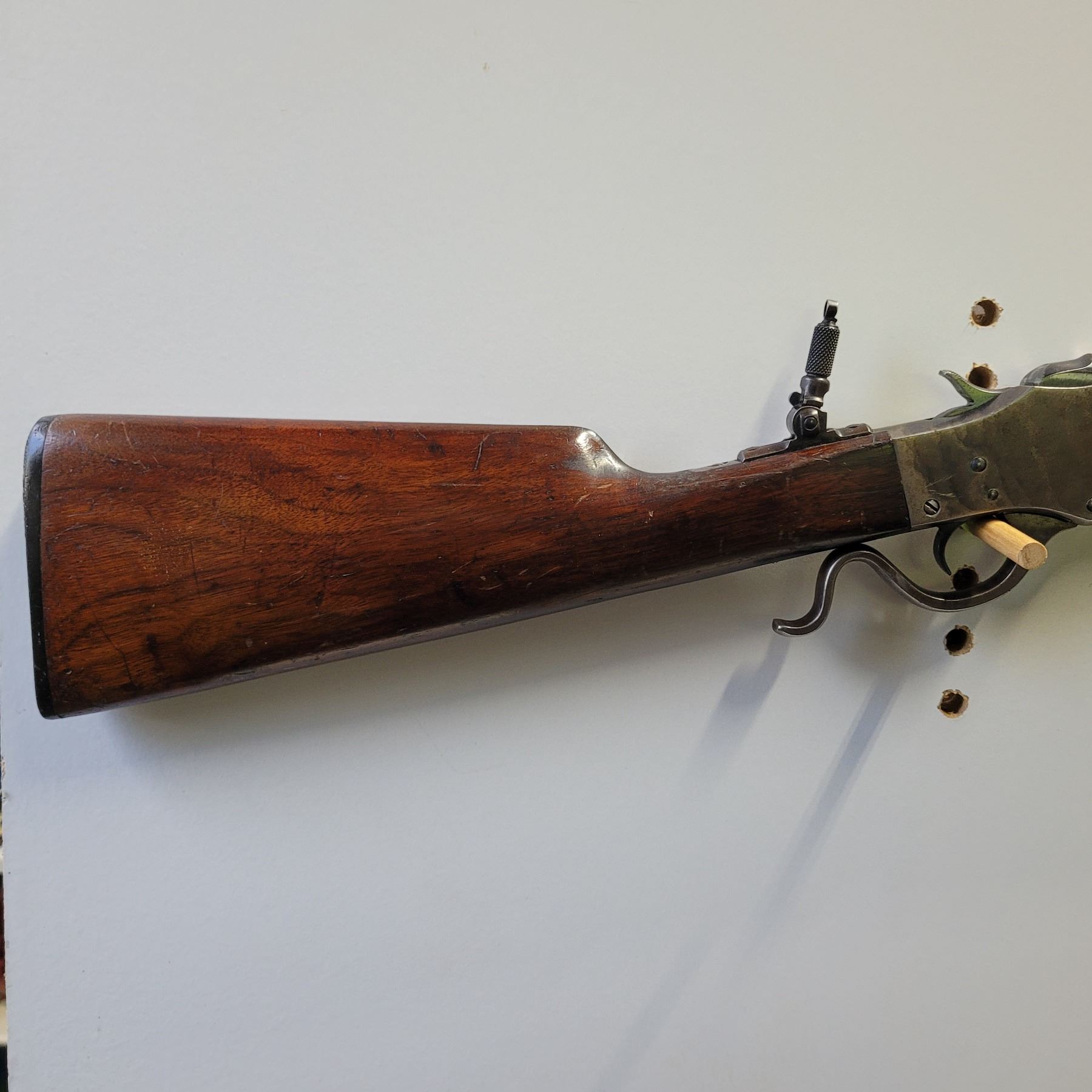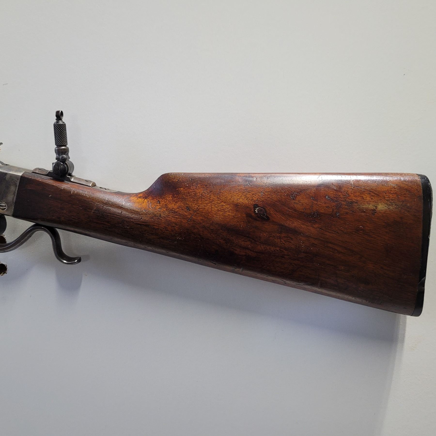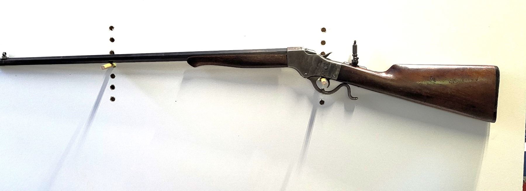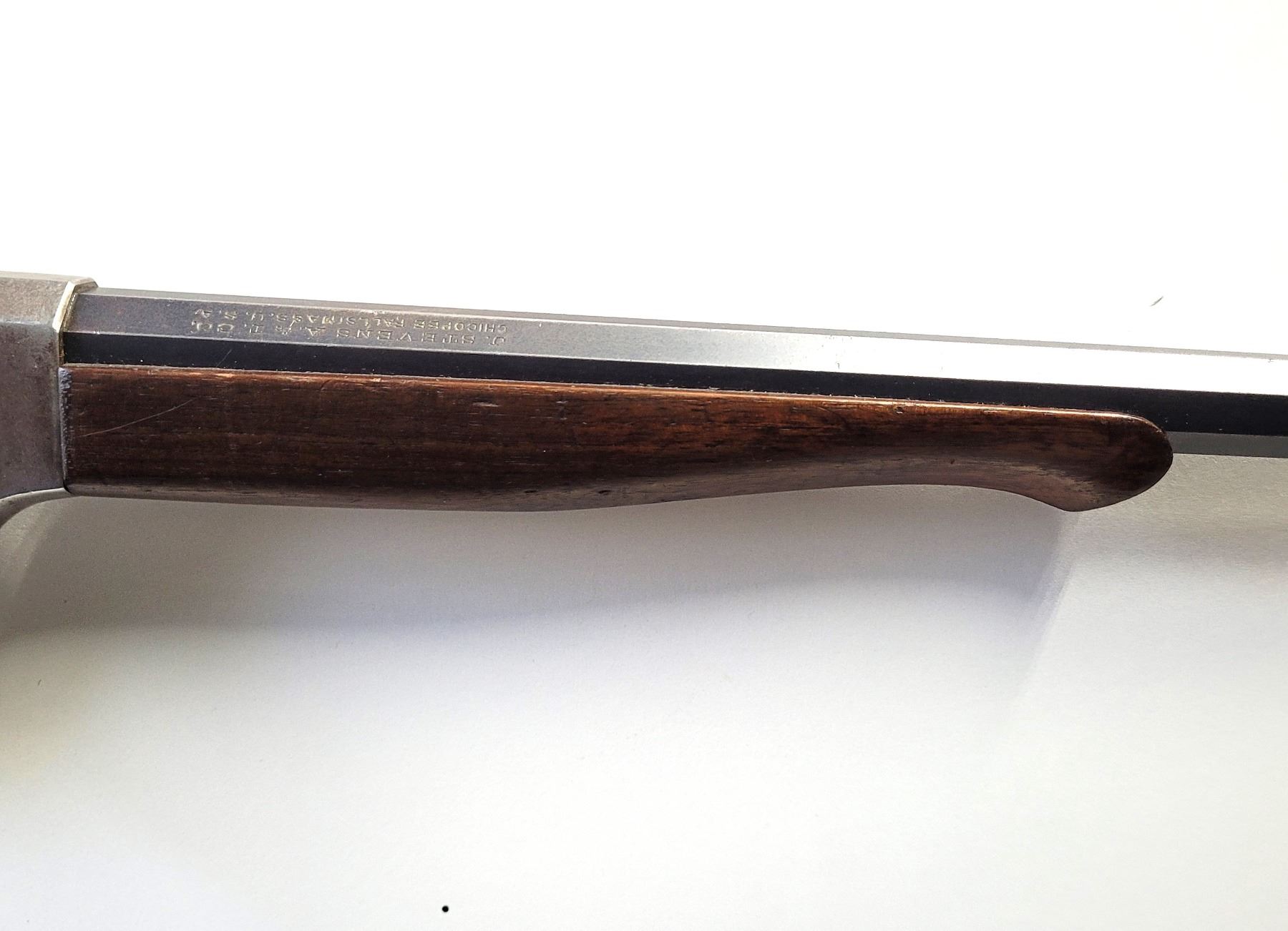 Used Stevens 044 1/2 English Model 25-25 Stevens Caliber. Serial #2976. This rifle has a 25 7/8" octagon barrel. The bore is in good condition with prominent rifling. It has a combination Beach style front sight and no provision for a rear sight on the barrel. It has a tang peep sight on the rear. The stocks are in good condition with NO cracks, however there are some light dents and scratches as per its age. The bluing is 90% on the barrel. The case colours on the receiver are prominent but are fading in some areas. It comes with a rubber/plastic buttplate which has a small chip out of it. Overall a good rifle.