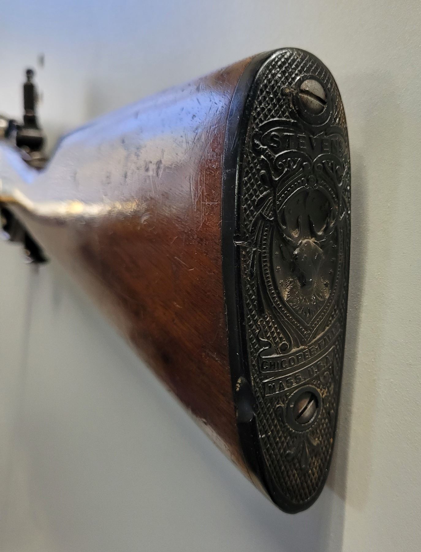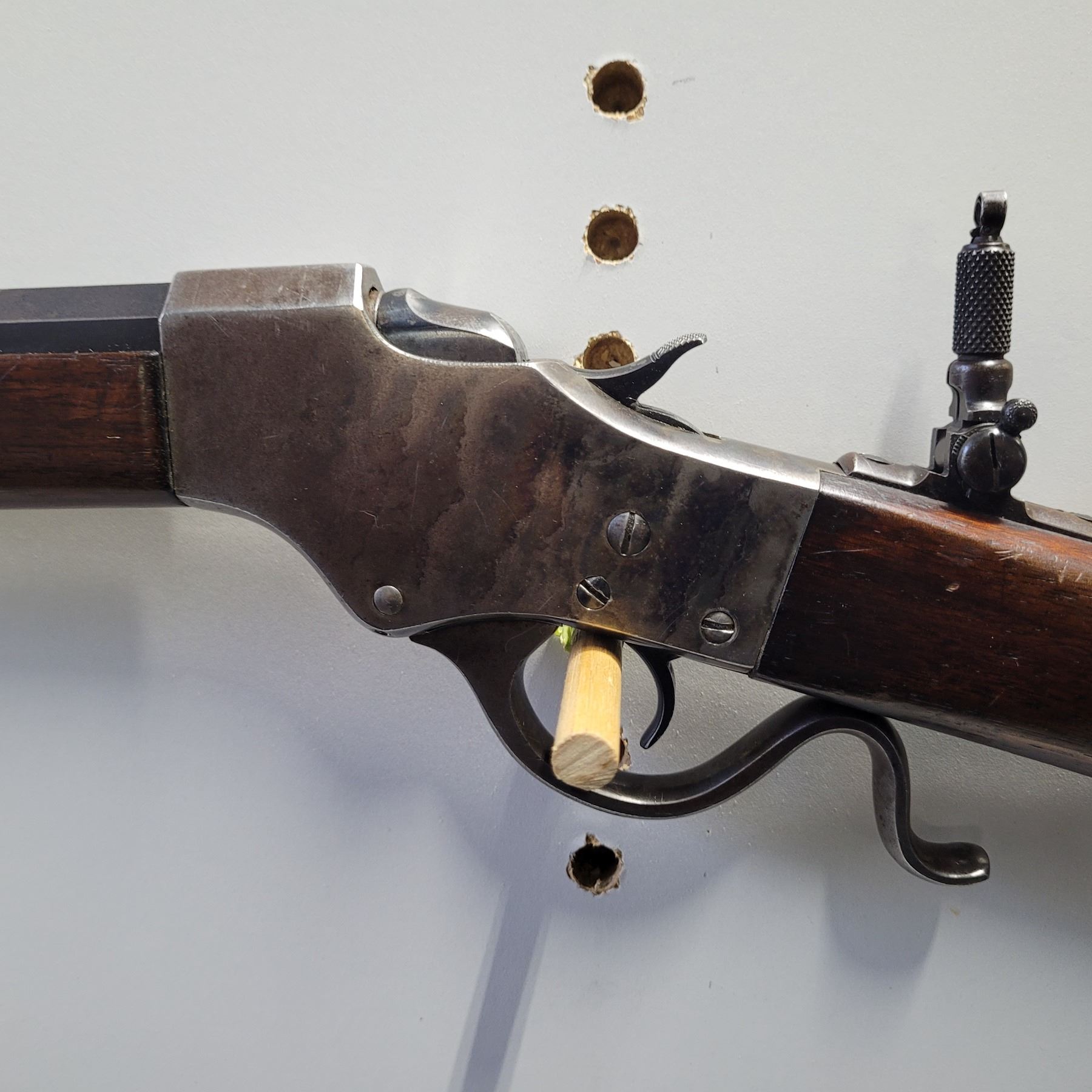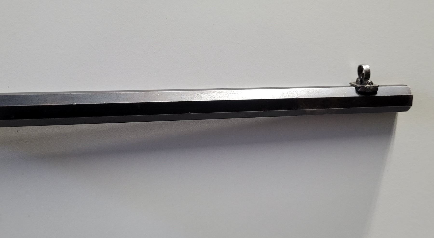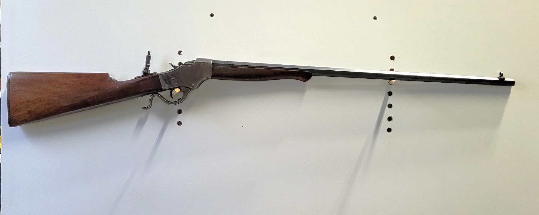Used Stevens 044 1/2 English Model 25-25 Stevens Caliber. Serial #2976. This rifle has a 25 7/8" octagon barrel. The bore is in good condition with prominent rifling. It has a combination Beach style front sight and no provision for a rear sight on the barrel. It has a tang peep sight on the rear. The stocks are in good condition with NO cracks, however there are some light dents and scratches as per its age. The bluing is 90% on the barrel. The case colours on the receiver are prominent but are fading in some areas. It comes with a rubber/plastic buttplate which has a small chip out of it. Overall a good rifle.