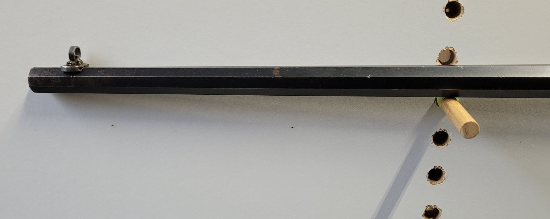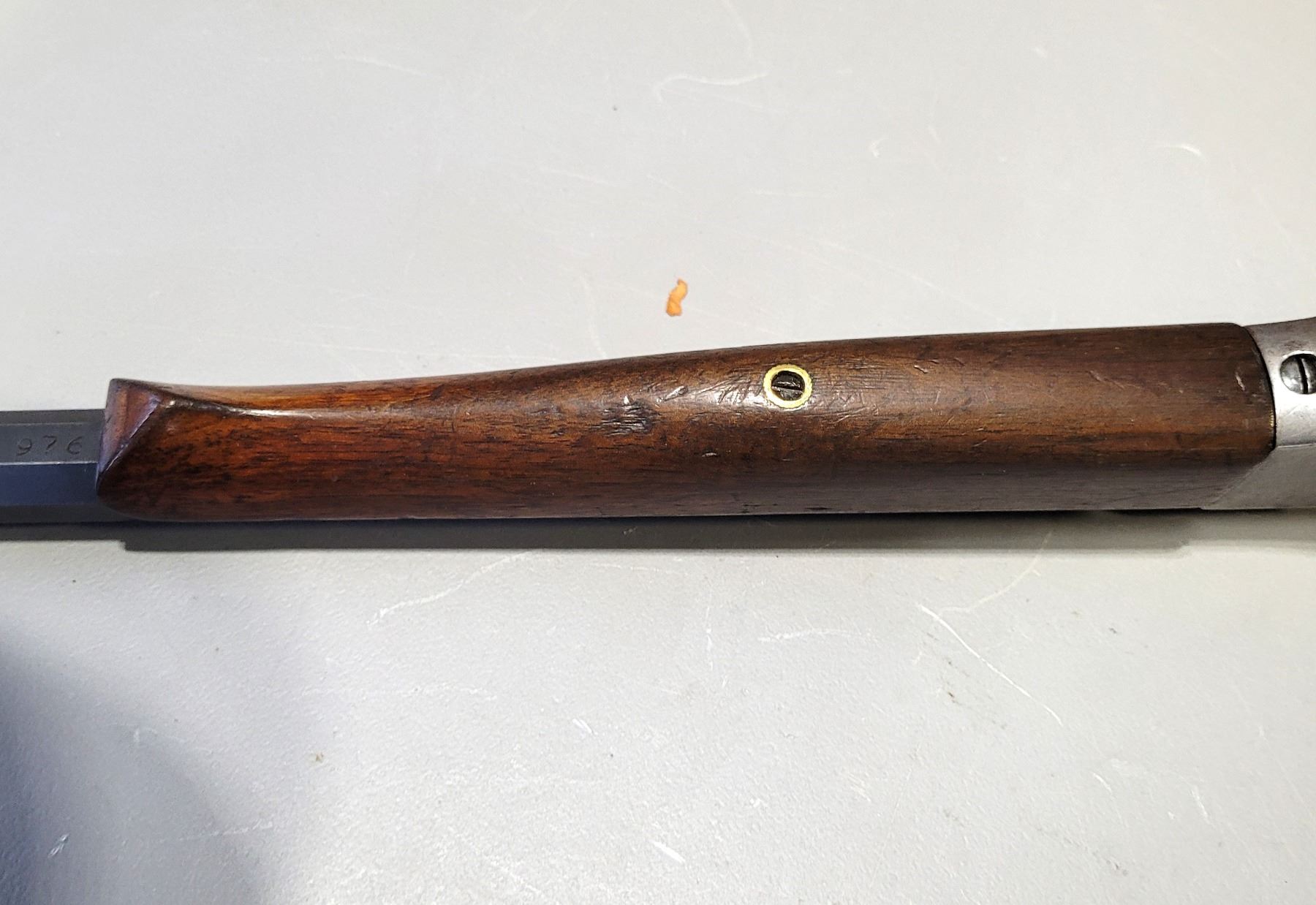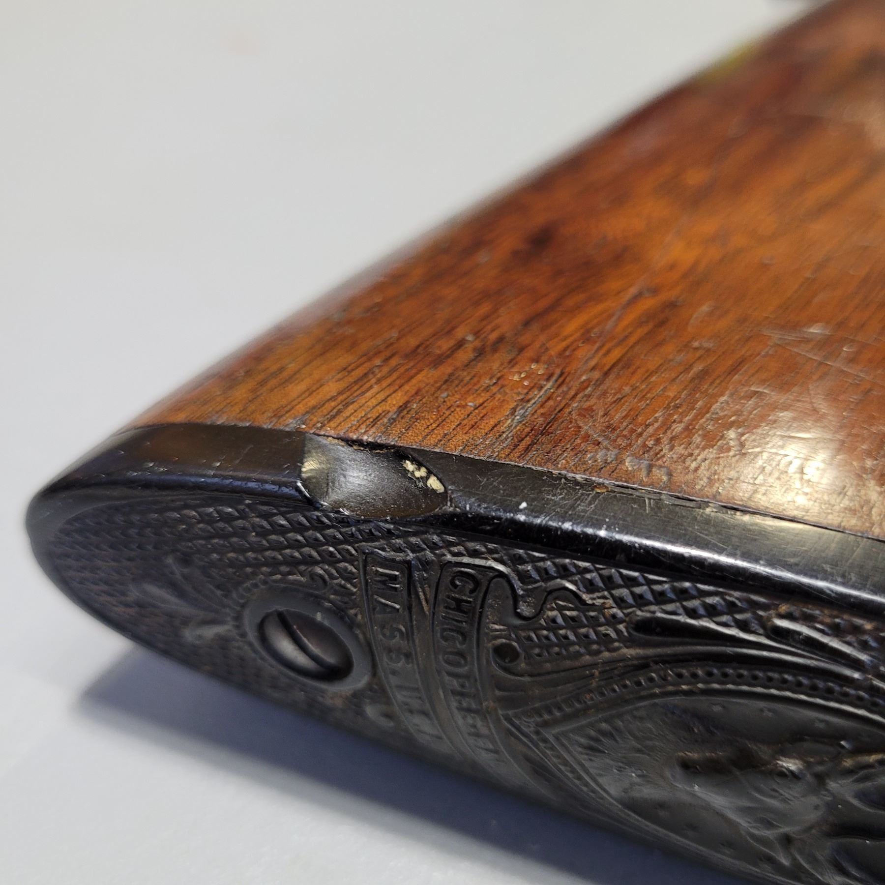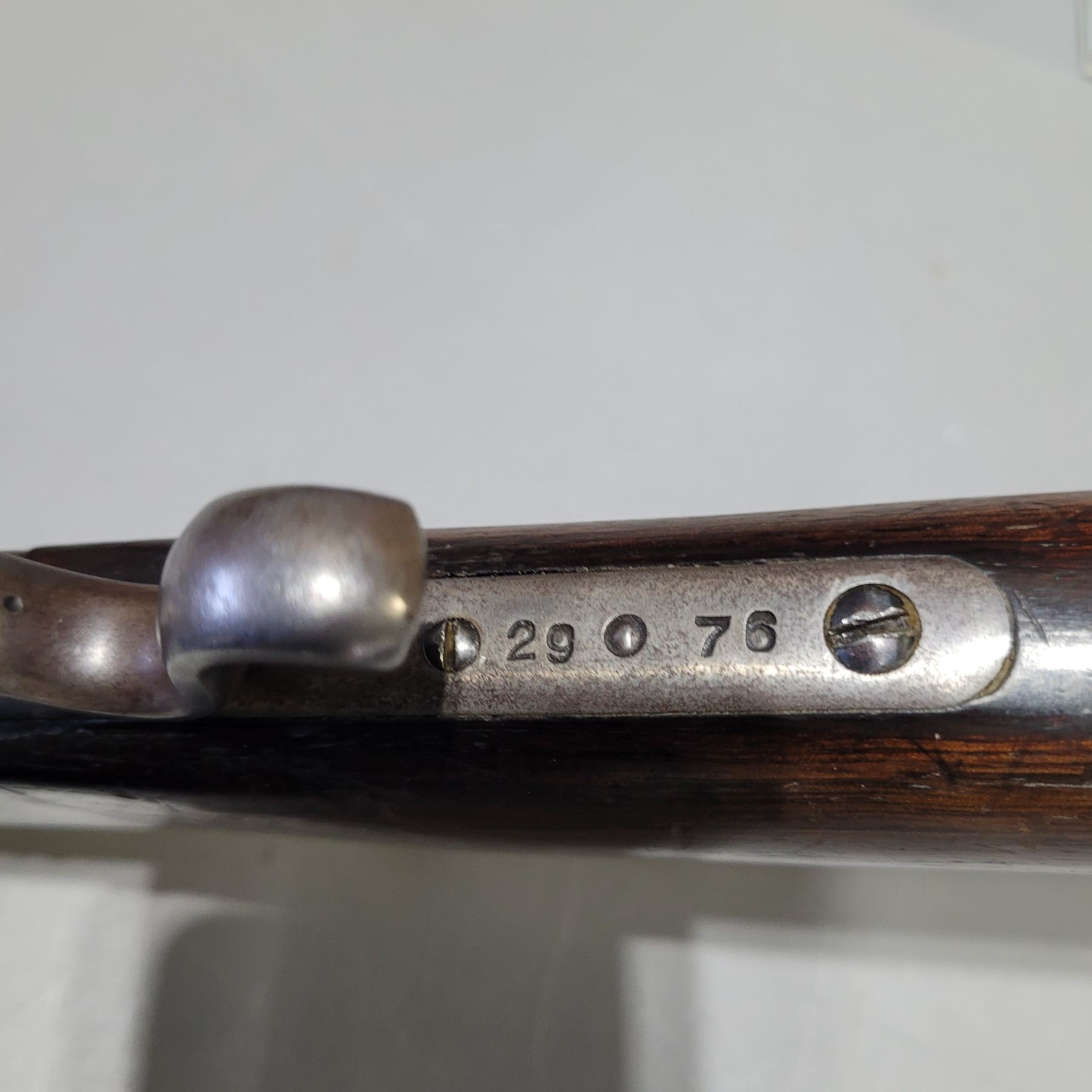 Used Stevens 044 1/2 English Model 25-25 Stevens Caliber. Serial #2976. This rifle has a 25 7/8" octagon barrel. The bore is in good condition with prominent rifling. It has a combination Beach style front sight and no provision for a rear sight on the barrel. It has a tang peep sight on the rear. The stocks are in good condition with NO cracks, however there are some light dents and scratches as per its age. The bluing is 90% on the barrel. The case colours on the receiver are prominent but are fading in some areas. It comes with a rubber/plastic buttplate which has a small chip out of it. Overall a good rifle.