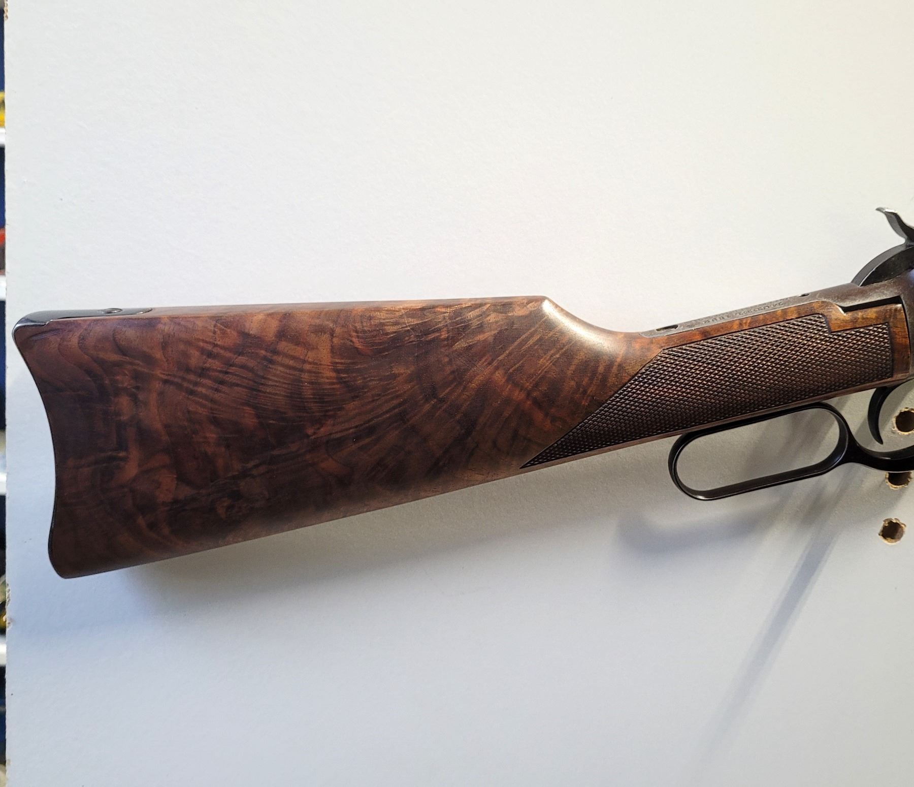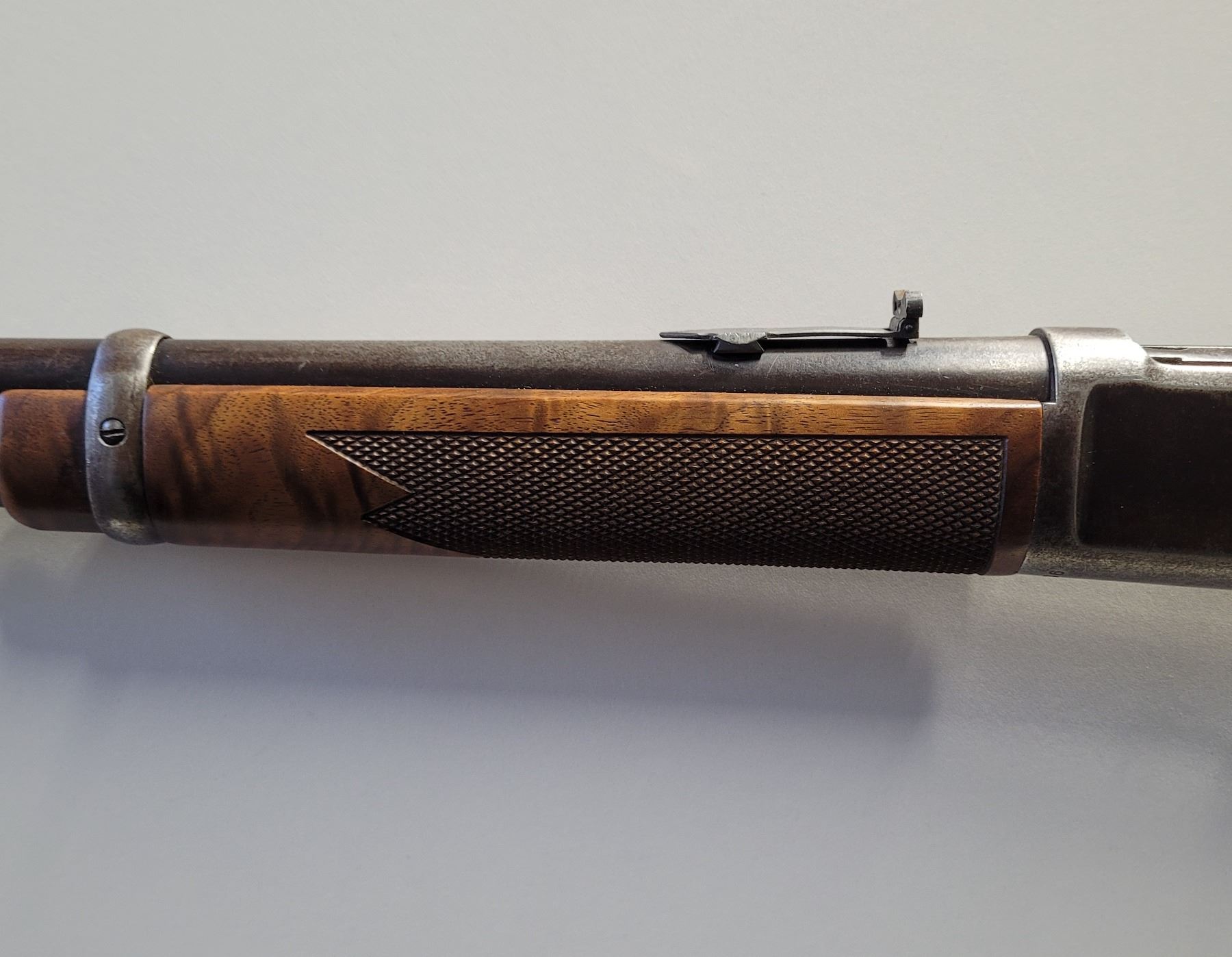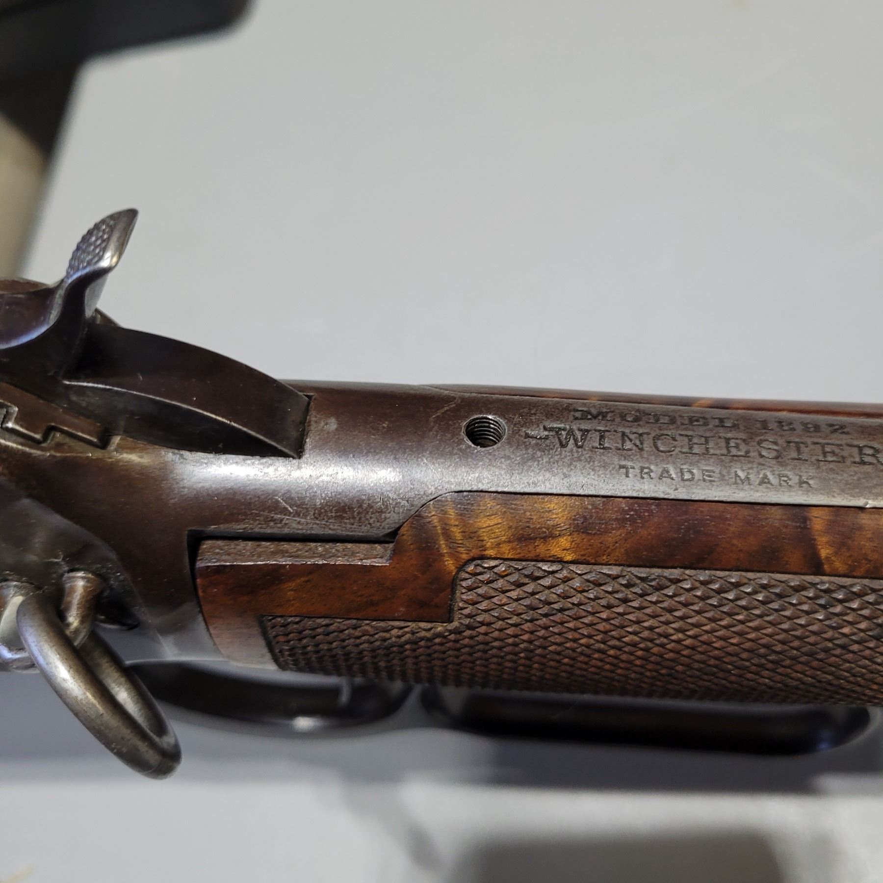 Used Winchester Custom 1892 Saddle Ring Carbine 44-40 Caliber. Serial #349836. This 92 SRC has a stock from a Commemorative Rifle. The wood is extra fancy walnut with wrap around checkering on the forearm. There are gaps in the stock along the upper tang. See Photos. The metalwork is original except for the buttplate. The 18" barrel has a post front sight and a Marbles folding rear sight. The bore has good rifling, however its dark with light pitting through out. There is a number 9 stamped on the bottom of the receiver.