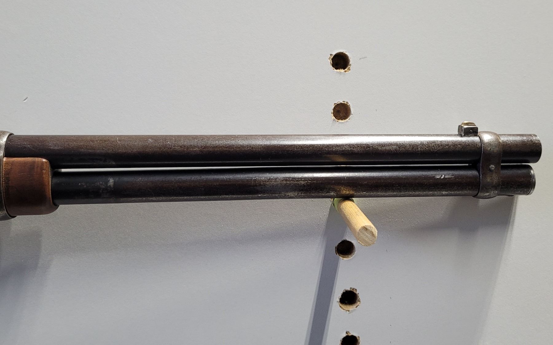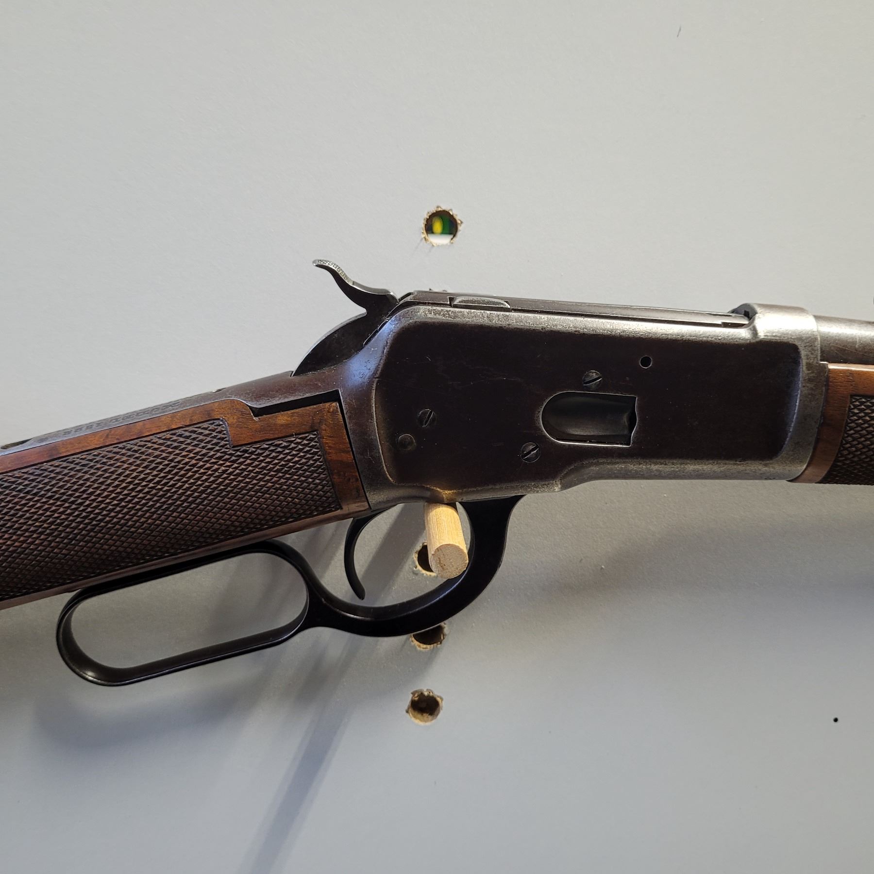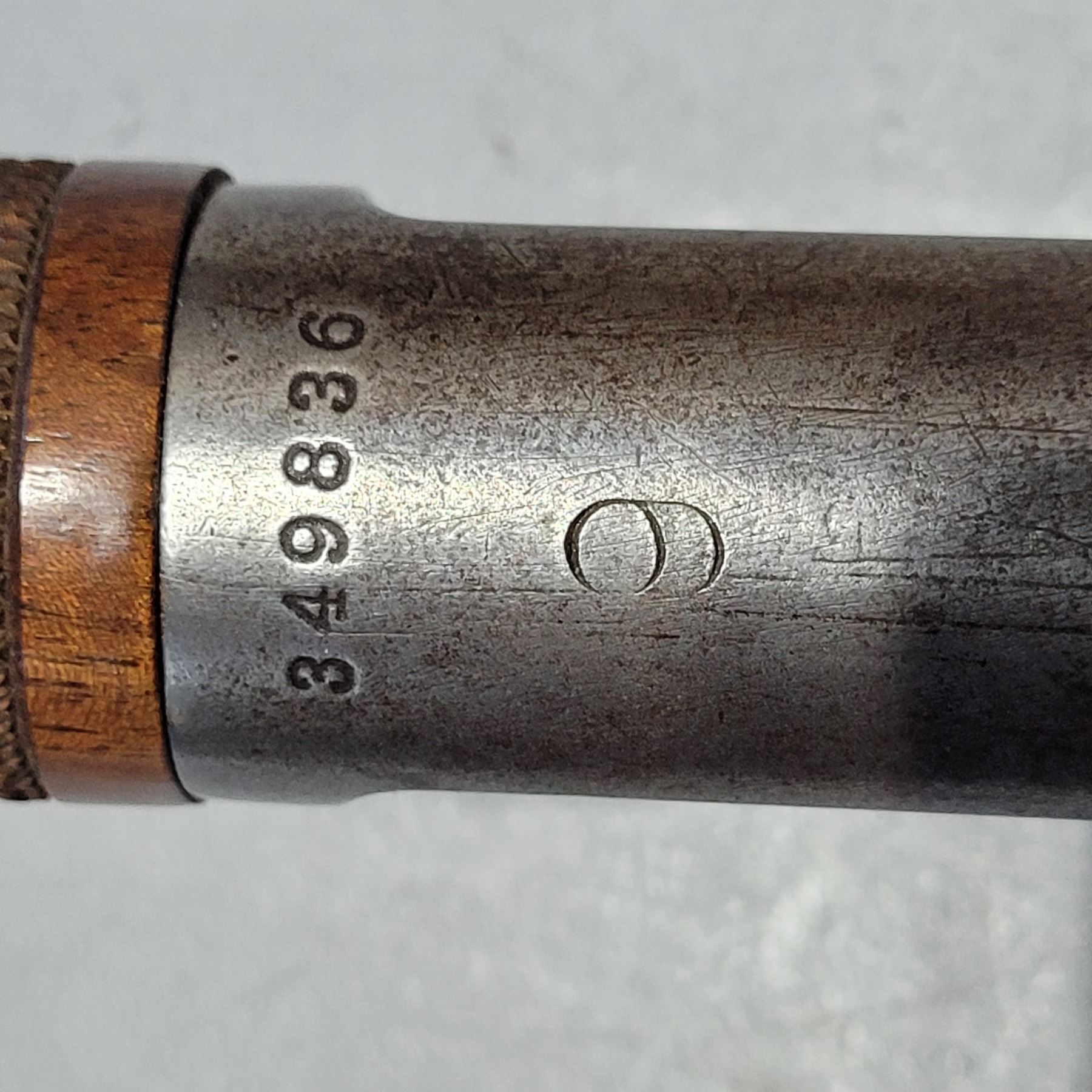 Used Winchester Custom 1892 Saddle Ring Carbine 44-40 Caliber. Serial #349836. This 92 SRC has a stock from a Commemorative Rifle. The wood is extra fancy walnut with wrap around checkering on the forearm. There are gaps in the stock along the upper tang. See Photos. The metalwork is original except for the buttplate. The 18" barrel has a post front sight and a Marbles folding rear sight. The bore has good rifling, however its dark with light pitting through out. There is a number 9 stamped on the bottom of the receiver.
