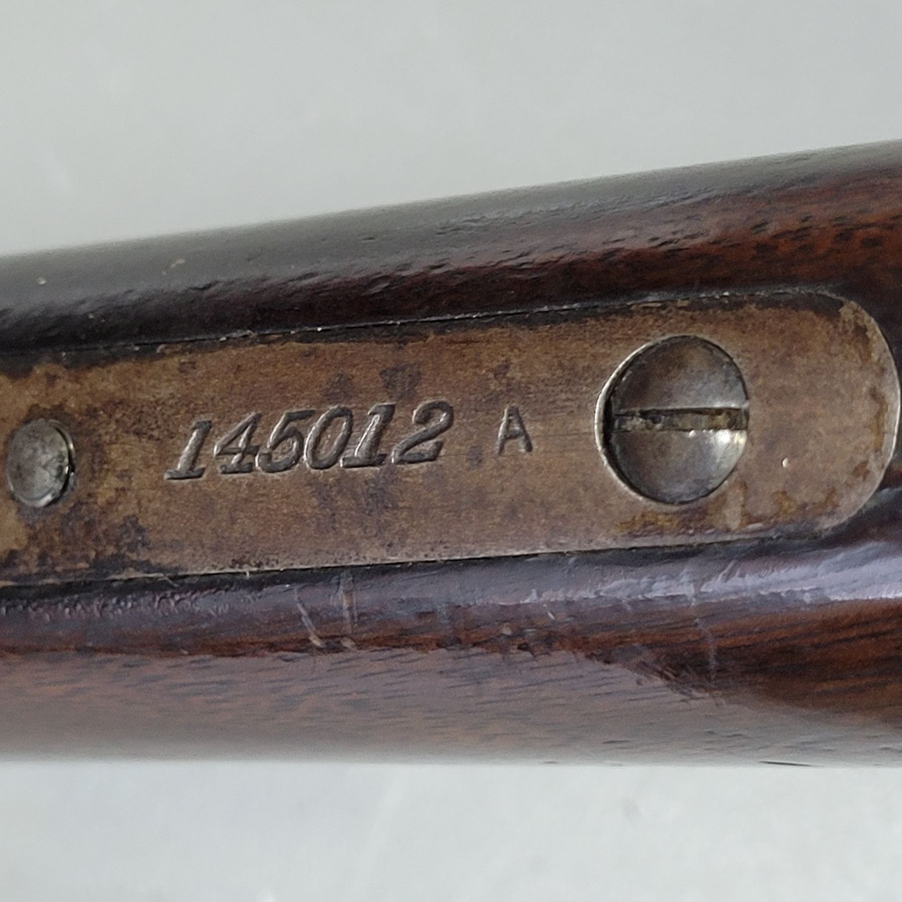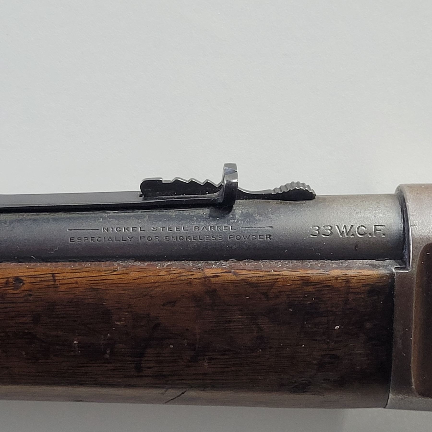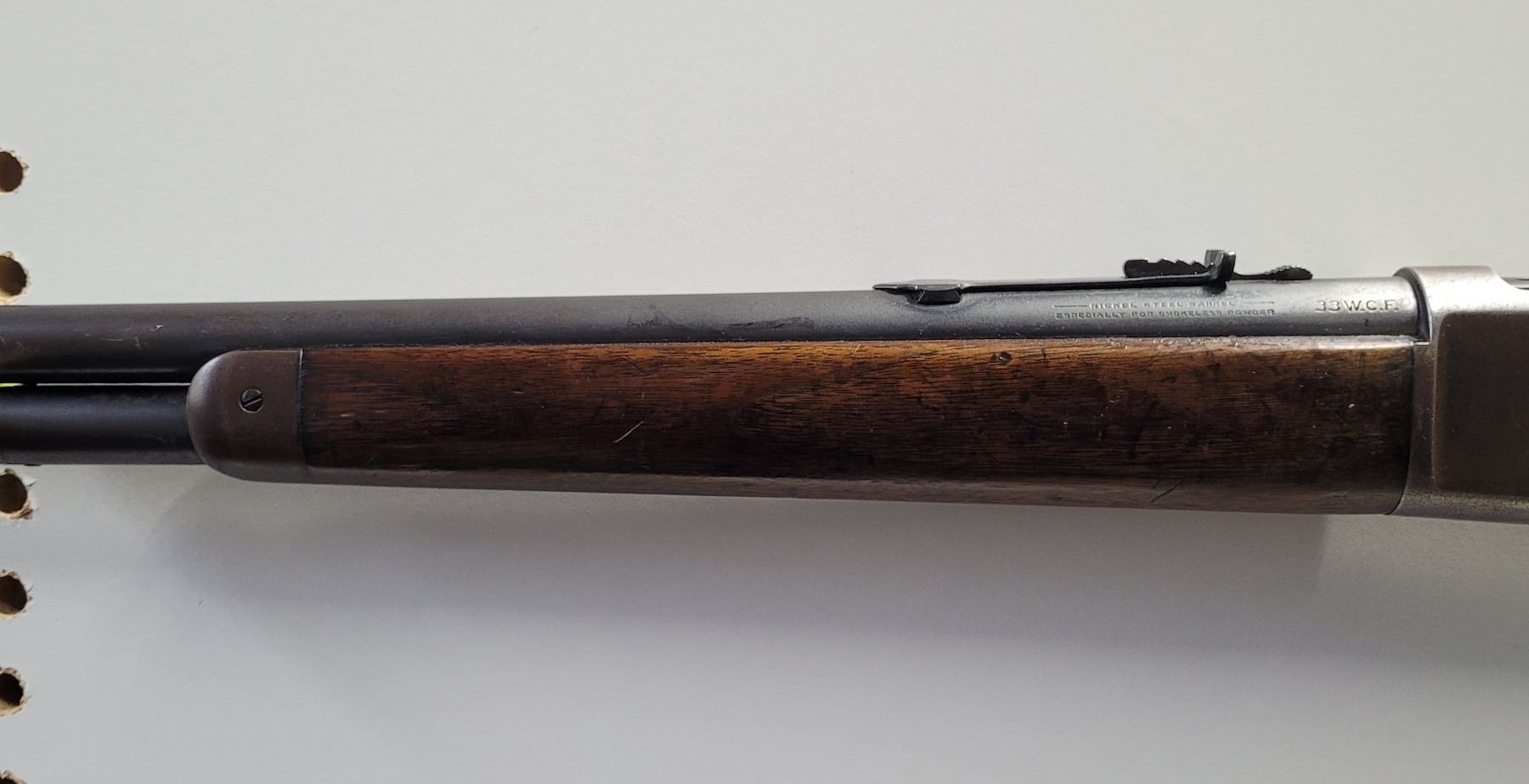 Used Winchester 1886 Rifle in 33 Win caliber. Serial #145012A. This rifle has the standard 24" tapered barrel with the ramp front sight and a rear flat top open sight. The bore is dark and frosty, but prominent rifling. The barrel retains approximately 85% of the bluing, but is fading in some areas. This rifle has both a strong half and full cock position. The receiver and the buttplate have a nice brown patina. This rifle varies from the normal 33 caliber rifle in that it has a crescent buttplate. The wood has some original varnish and has dents and scratches.