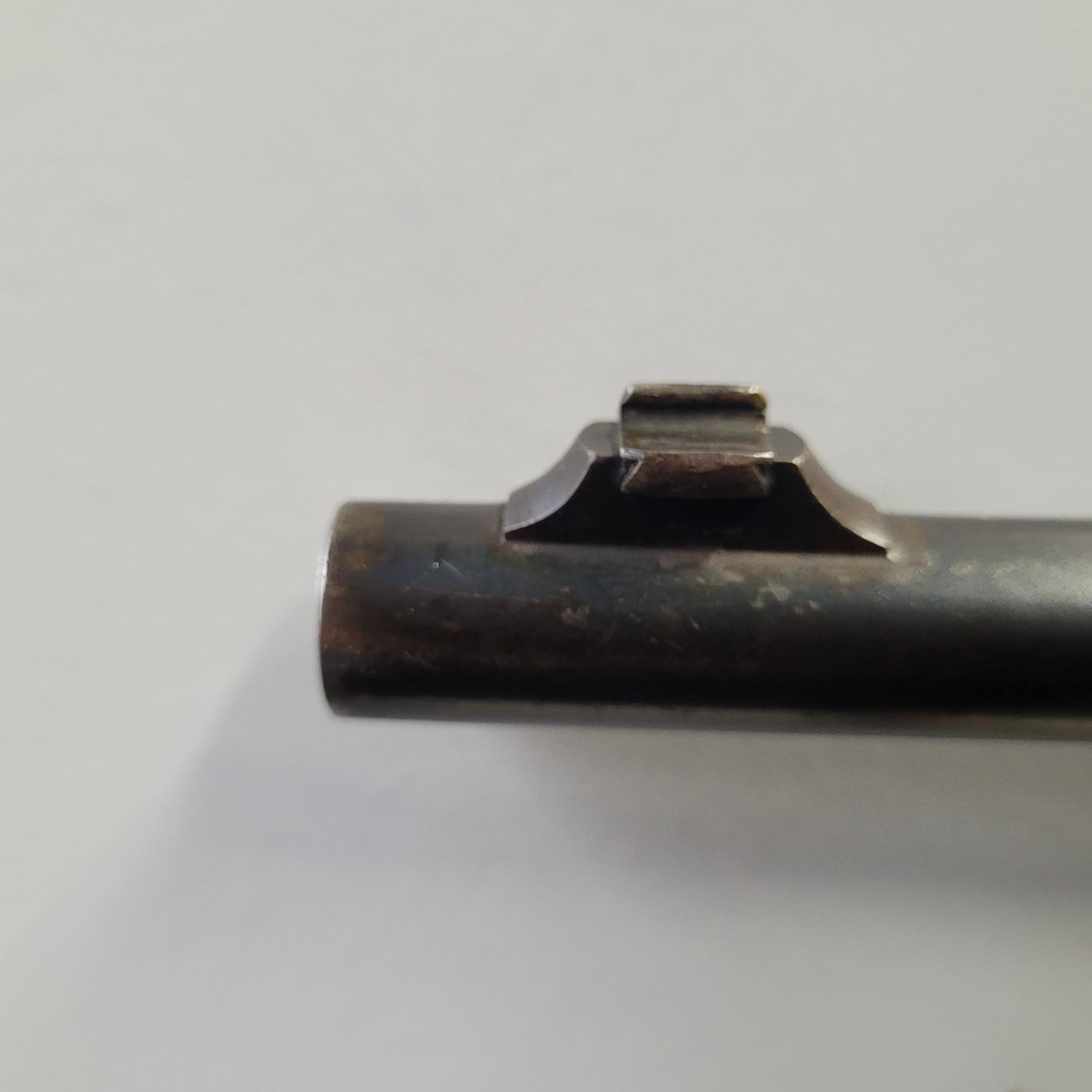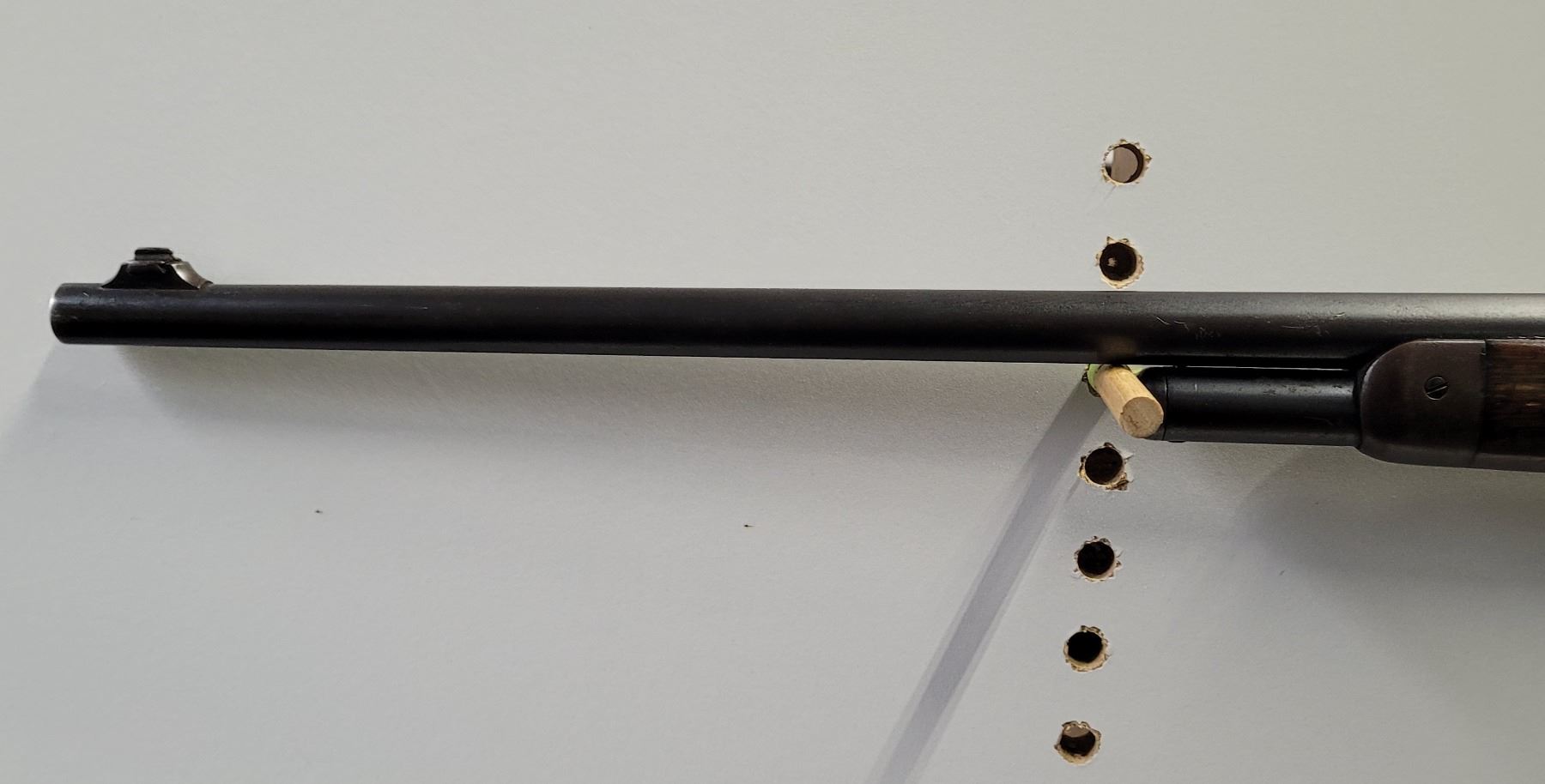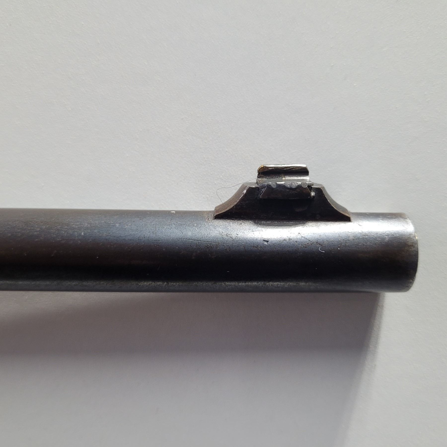 Used Winchester 1886 Rifle in 33 Win caliber. Serial #145012A. This rifle has the standard 24" tapered barrel with the ramp front sight and a rear flat top open sight. The bore is dark and frosty, but prominent rifling. The barrel retains approximately 85% of the bluing, but is fading in some areas. This rifle has both a strong half and full cock position. The receiver and the buttplate have a nice brown patina. This rifle varies from the normal 33 caliber rifle in that it has a crescent buttplate. The wood has some original varnish and has dents and scratches.