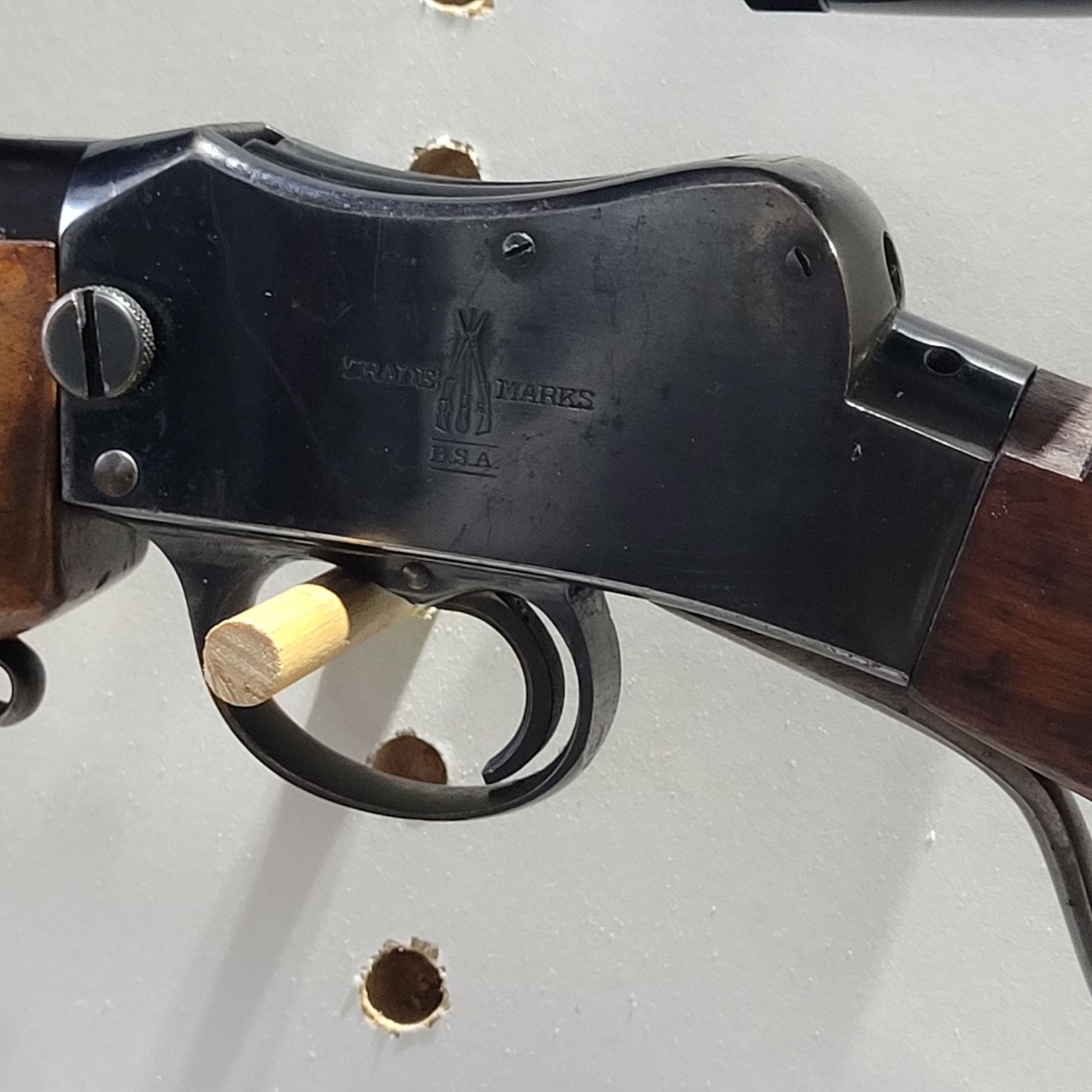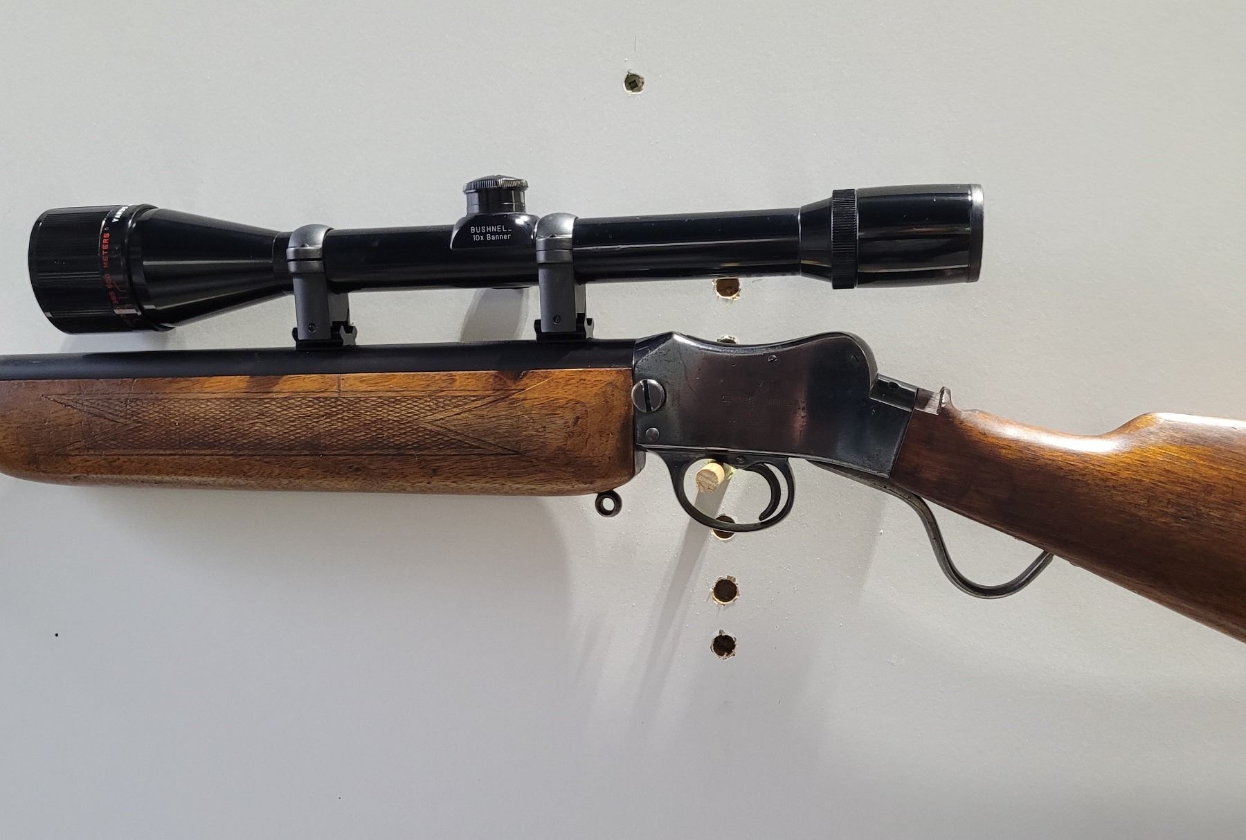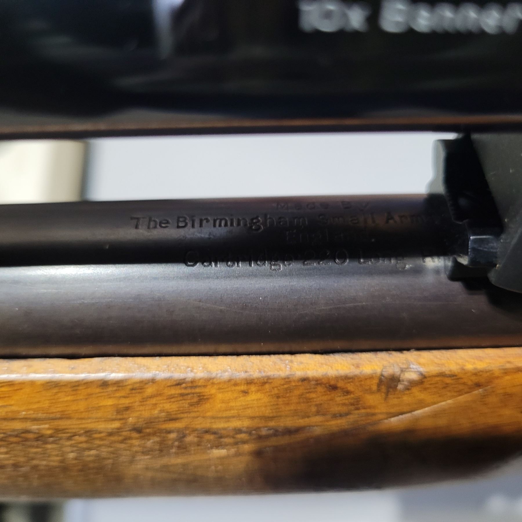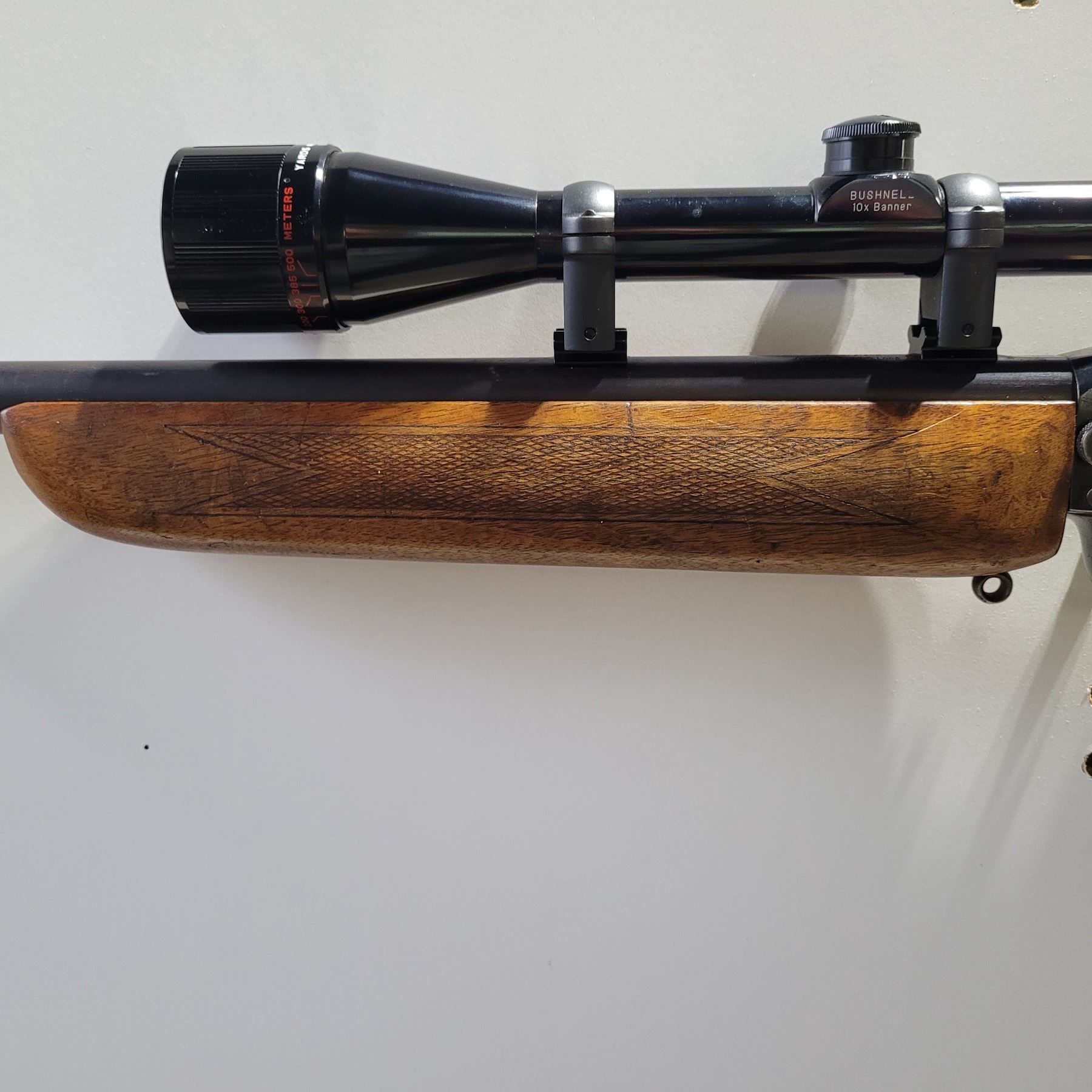 BSA Martini Single Shot .218 Bee Caliber with 10X Bushnell Banner Scope. This rifle has been re-chambered to .218 Bee. The 25" Barrel has a dovetail cut in the bottom. It has a good shiny bore.The stock is in good condition, with NO cracks, however there are multiple marks on it from years of use as well as the initals GBE on the bottom of the forend. The buttstock as well as the barrel is stamped with the Canadian Military marking C - broad arrow. The Receiver has very nice original blueing. The barrel has good blueing but has some wear near the muzzle. The Scope is a Bushnell Banner 10x with parallax adjustment.