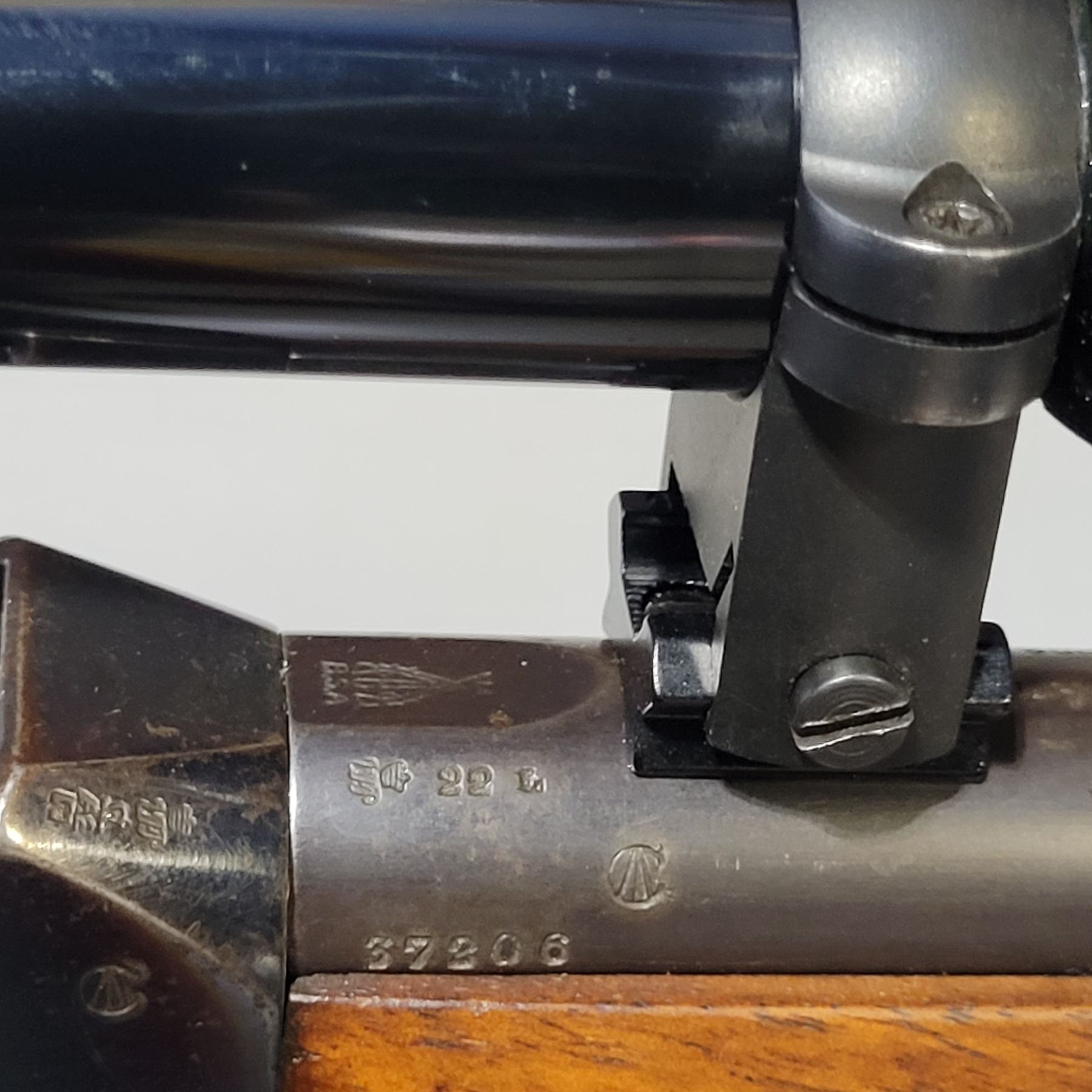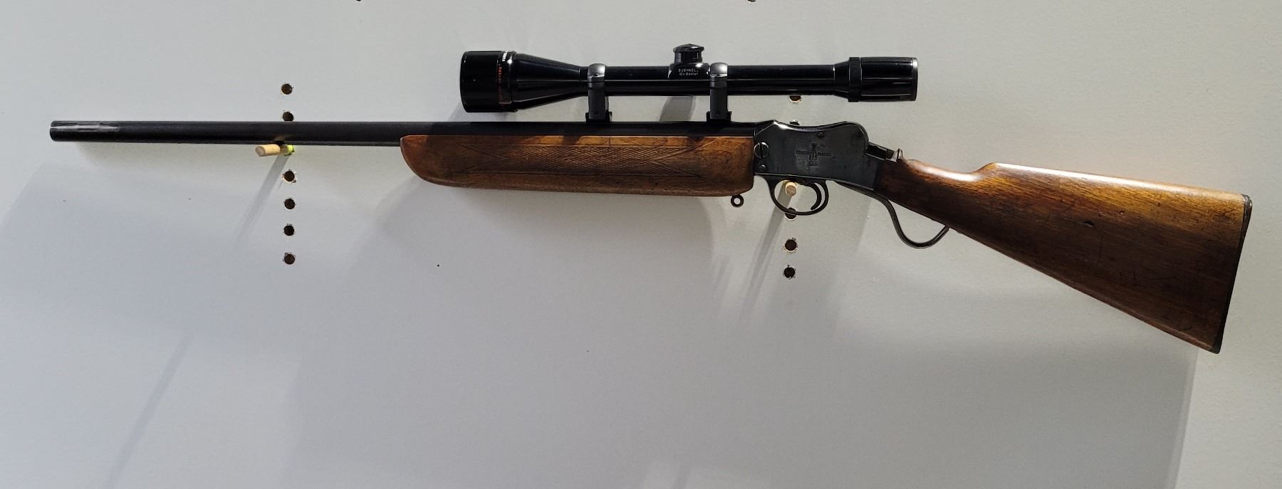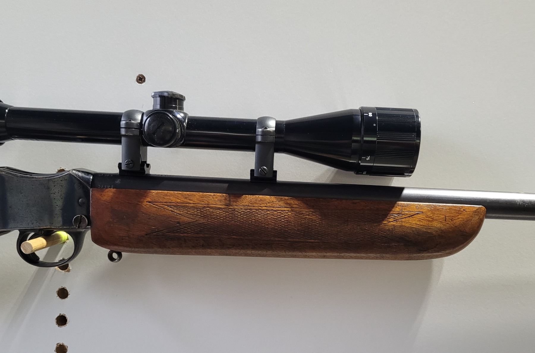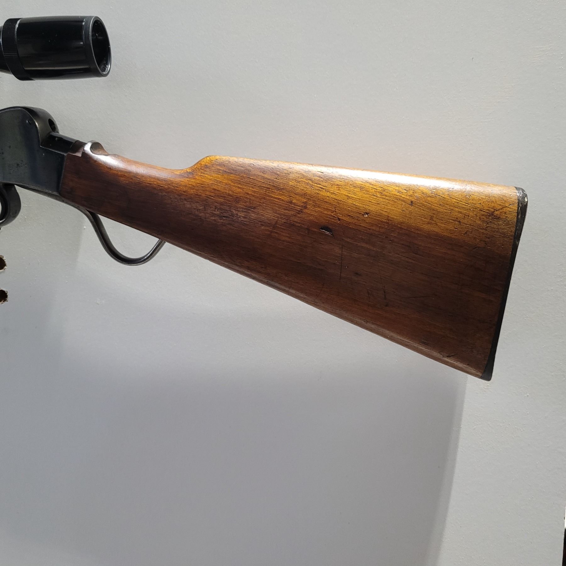 BSA Martini Single Shot .218 Bee Caliber with 10X Bushnell Banner Scope. This rifle has been re-chambered to .218 Bee. The 25" Barrel has a dovetail cut in the bottom. It has a good shiny bore.The stock is in good condition, with NO cracks, however there are multiple marks on it from years of use as well as the initals GBE on the bottom of the forend. The buttstock as well as the barrel is stamped with the Canadian Military marking C - broad arrow. The Receiver has very nice original blueing. The barrel has good blueing but has some wear near the muzzle. The Scope is a Bushnell Banner 10x with parallax adjustment.