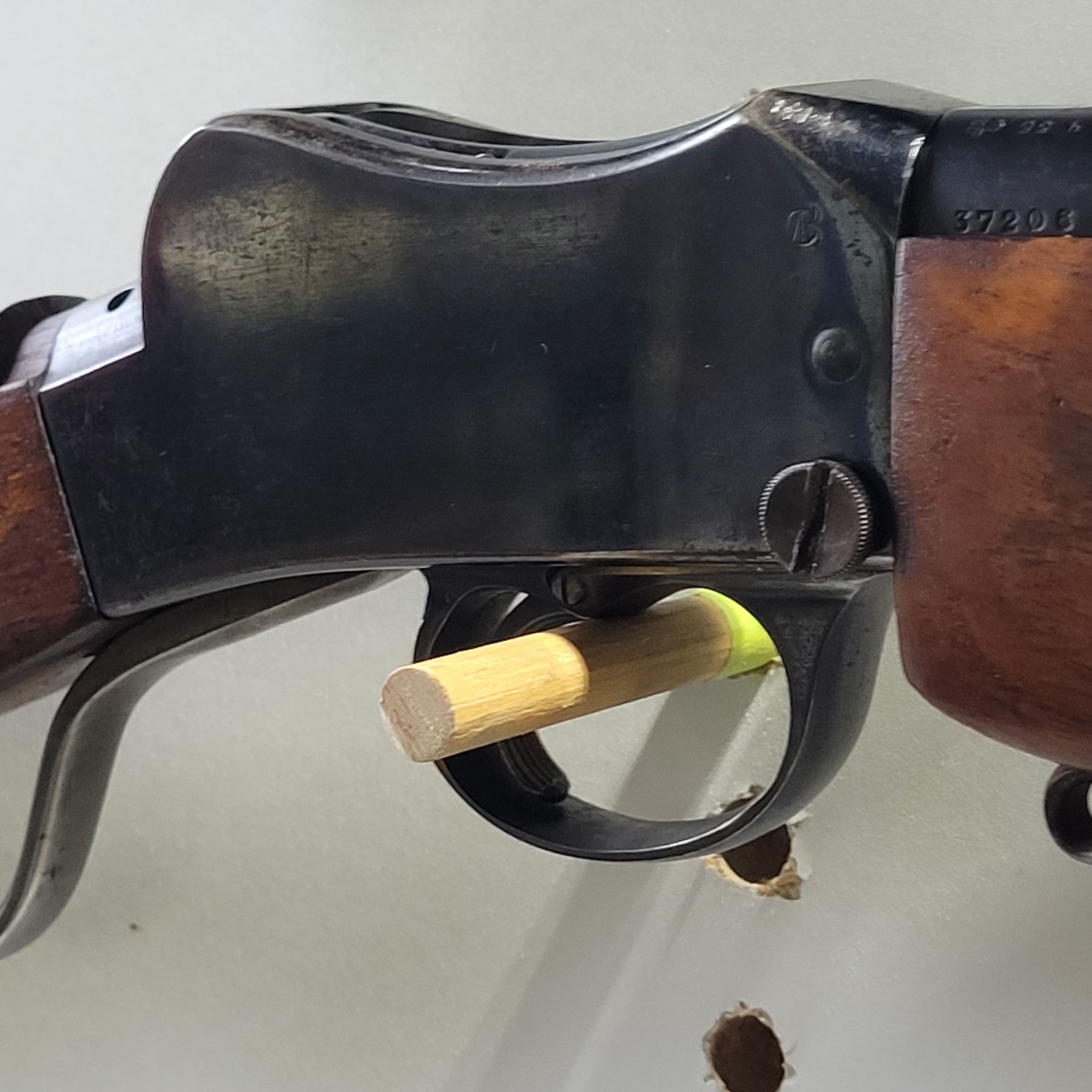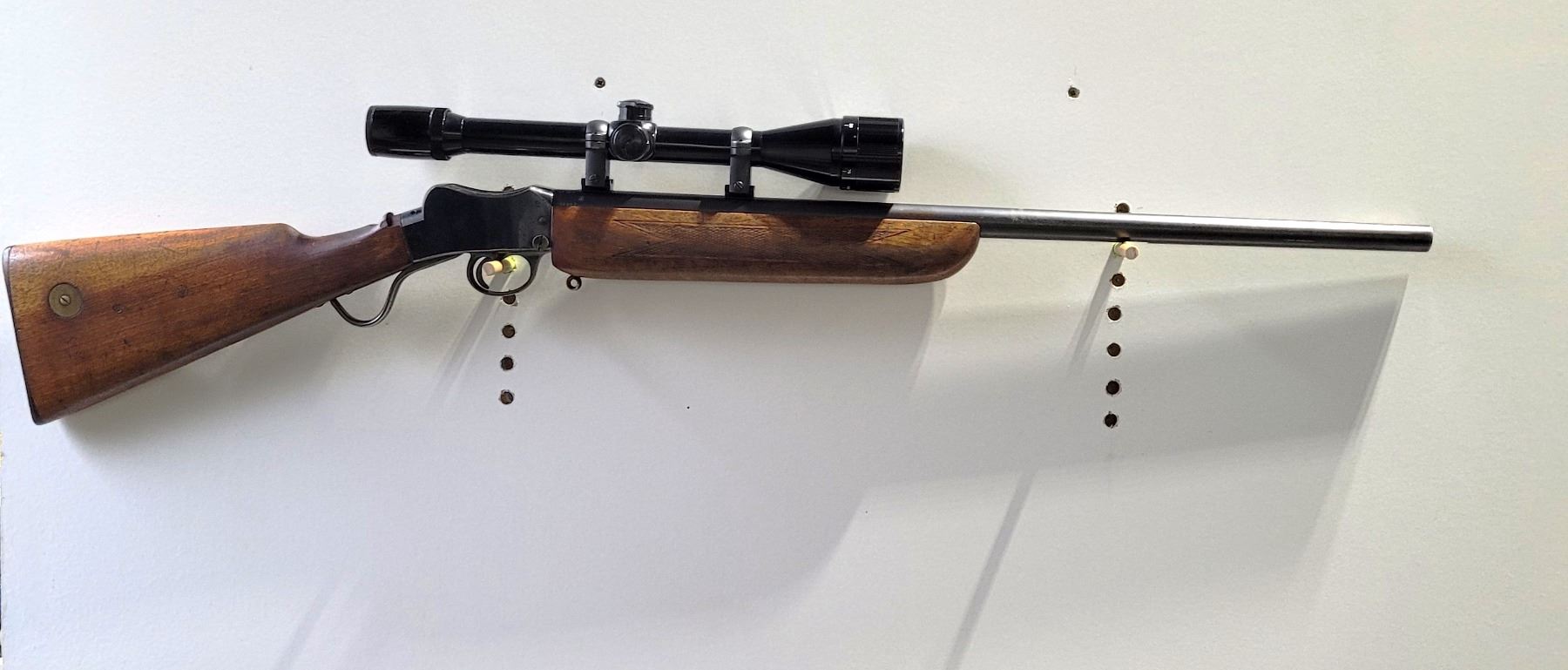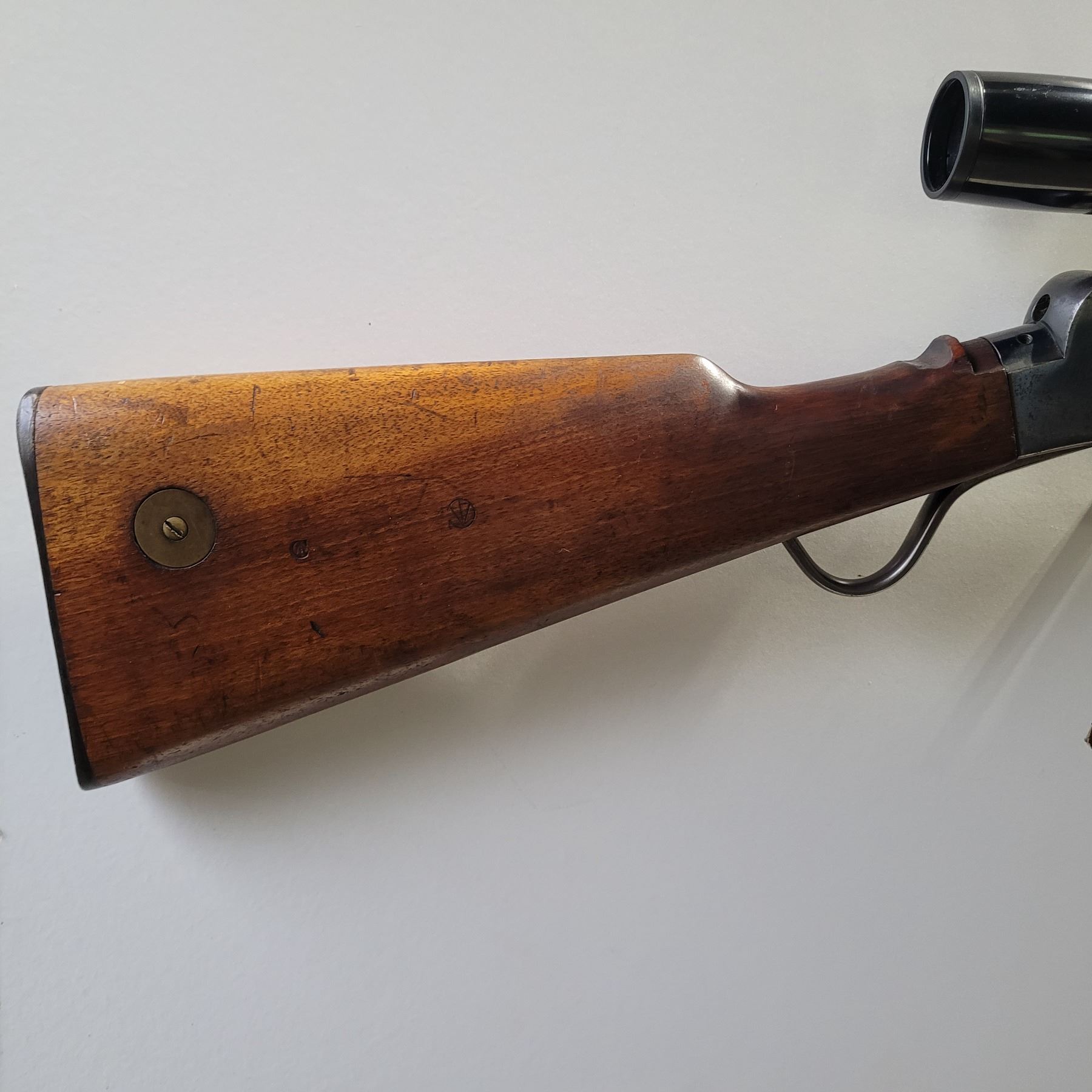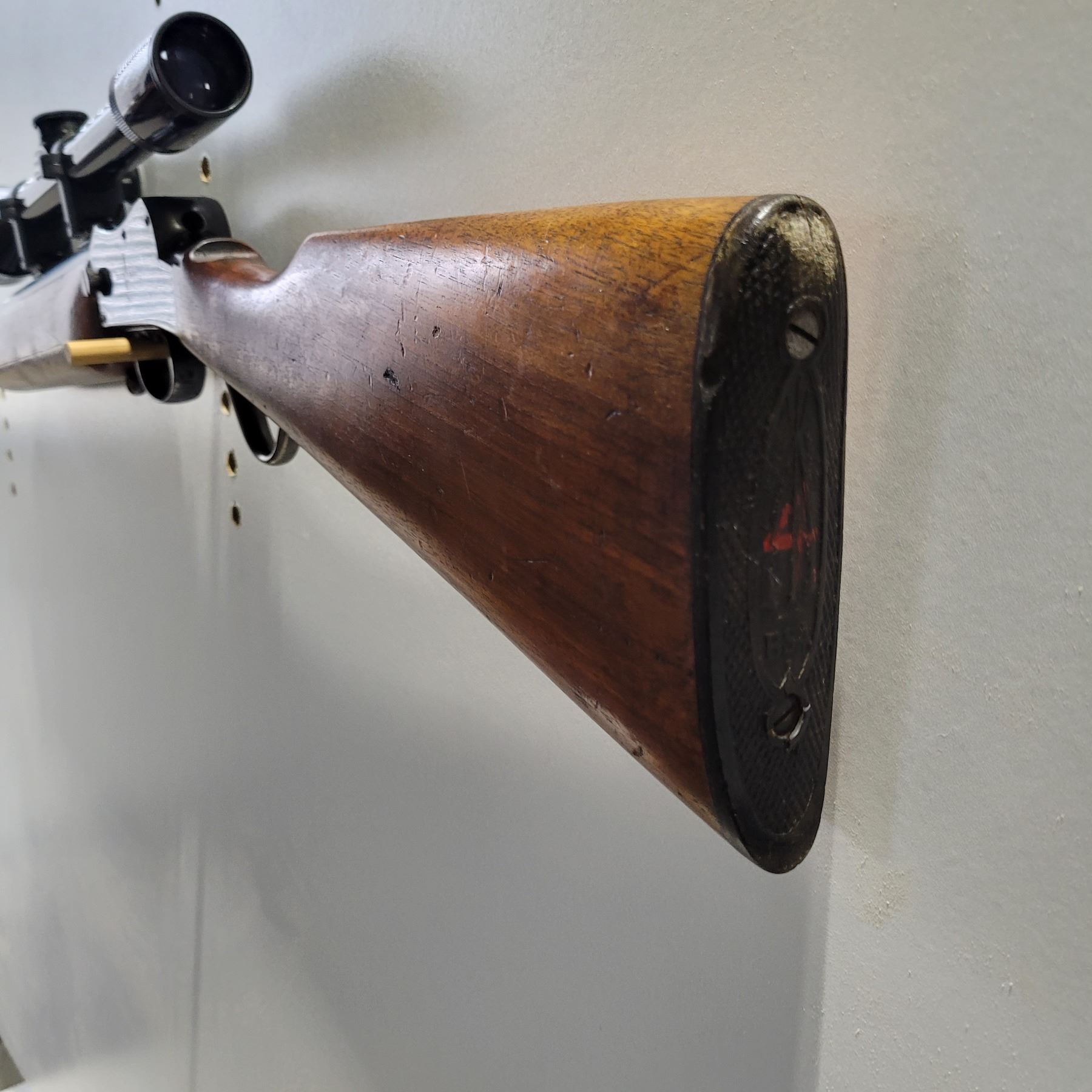 BSA Martini Single Shot .218 Bee Caliber with 10X Bushnell Banner Scope. This rifle has been re-chambered to .218 Bee. The 25" Barrel has a dovetail cut in the bottom. It has a good shiny bore.The stock is in good condition, with NO cracks, however there are multiple marks on it from years of use as well as the initals GBE on the bottom of the forend. The buttstock as well as the barrel is stamped with the Canadian Military marking C - broad arrow. The Receiver has very nice original blueing. The barrel has good blueing but has some wear near the muzzle. The Scope is a Bushnell Banner 10x with parallax adjustment.