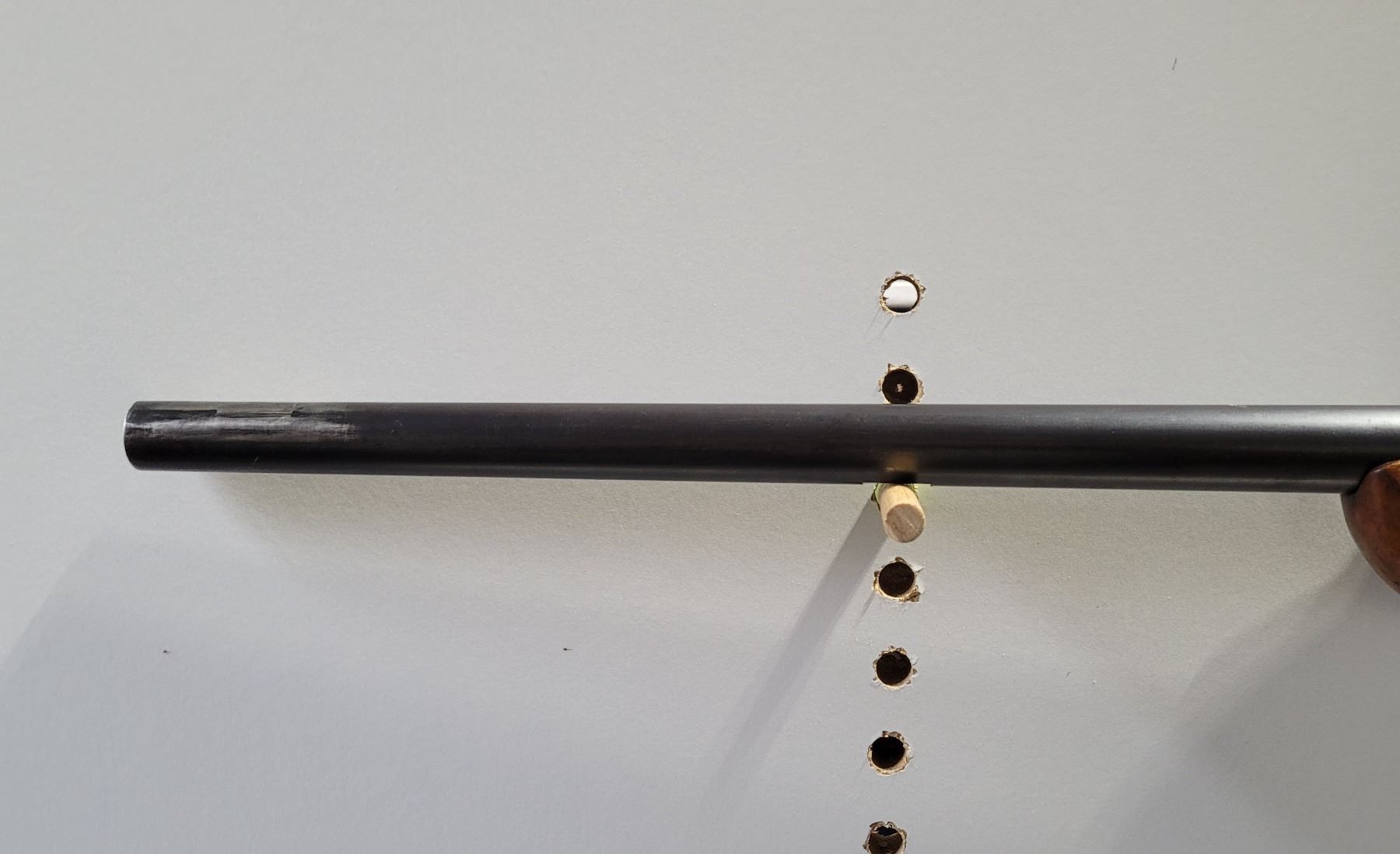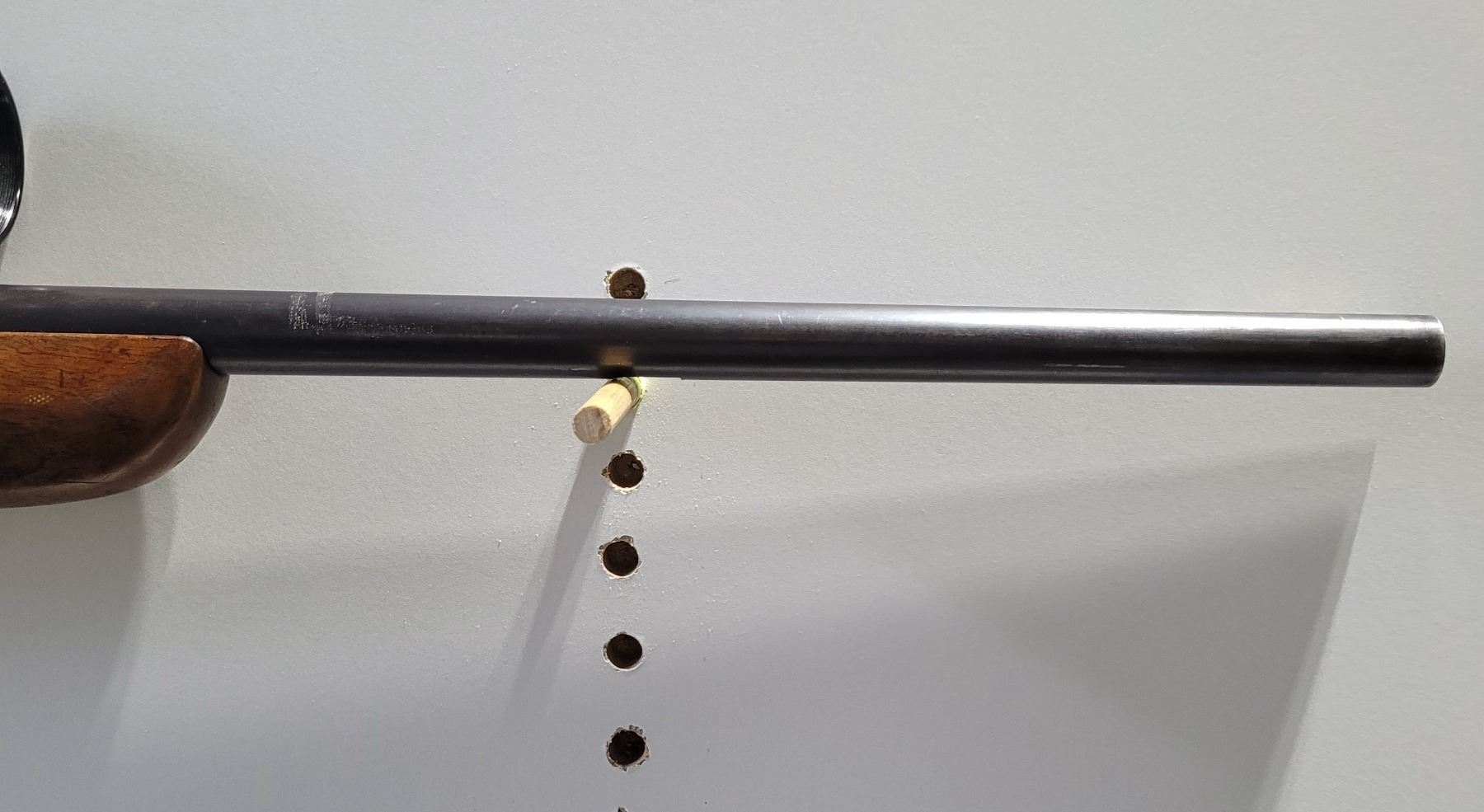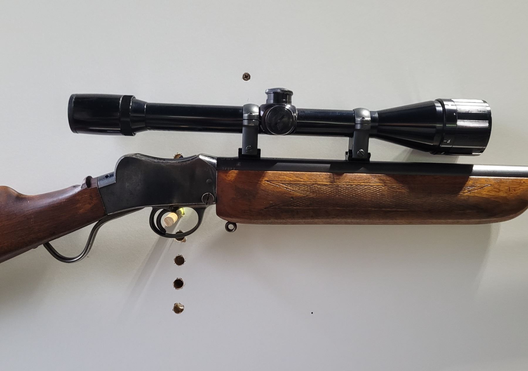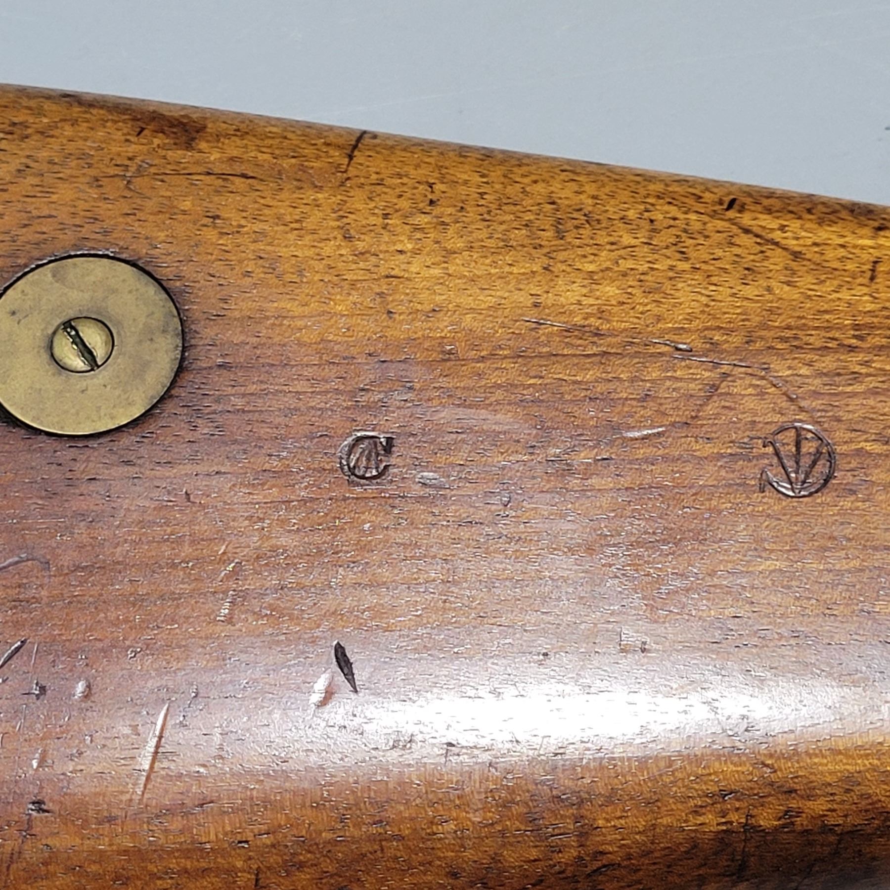 BSA Martini Single Shot .218 Bee Caliber with 10X Bushnell Banner Scope. This rifle has been re-chambered to .218 Bee. The 25" Barrel has a dovetail cut in the bottom. It has a good shiny bore.The stock is in good condition, with NO cracks, however there are multiple marks on it from years of use as well as the initals GBE on the bottom of the forend. The buttstock as well as the barrel is stamped with the Canadian Military marking C - broad arrow. The Receiver has very nice original blueing. The barrel has good blueing but has some wear near the muzzle. The Scope is a Bushnell Banner 10x with parallax adjustment.