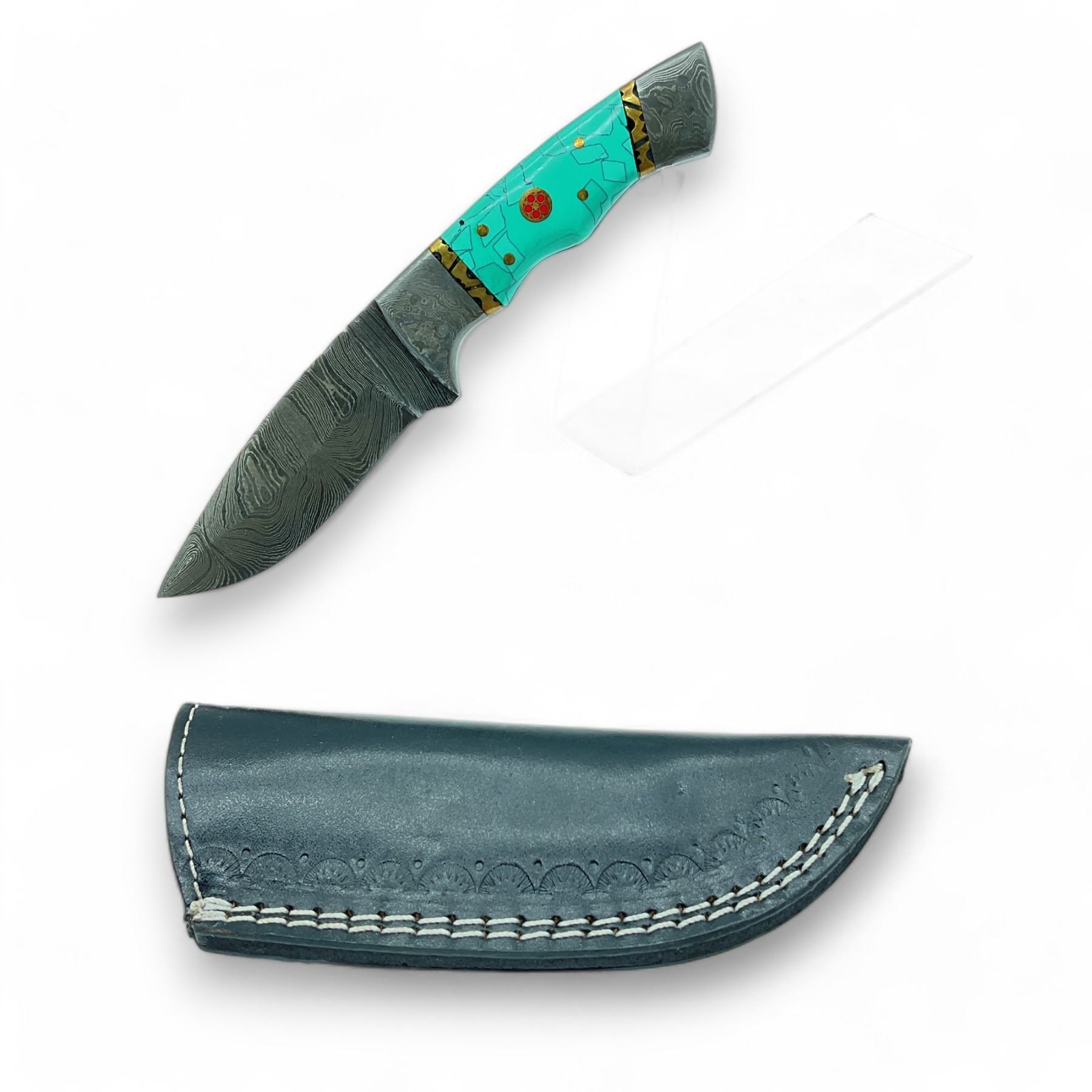 Fixed 3" Damascus Blade Knife with Green Accents and Belt Sheath