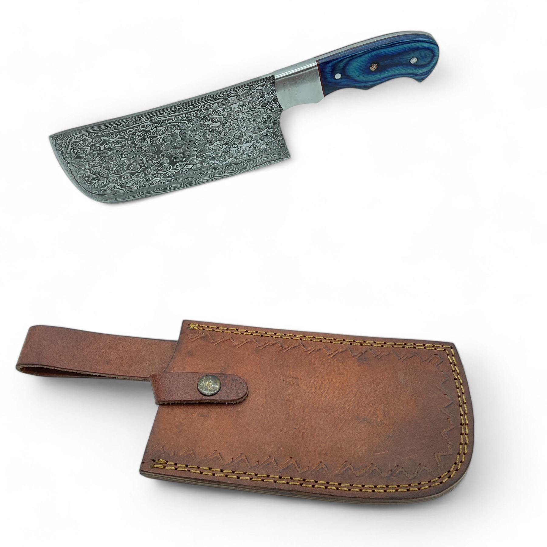 Fixed 7.5" Damascus Blade Cleaver with Blue Handle & Leather Sheath