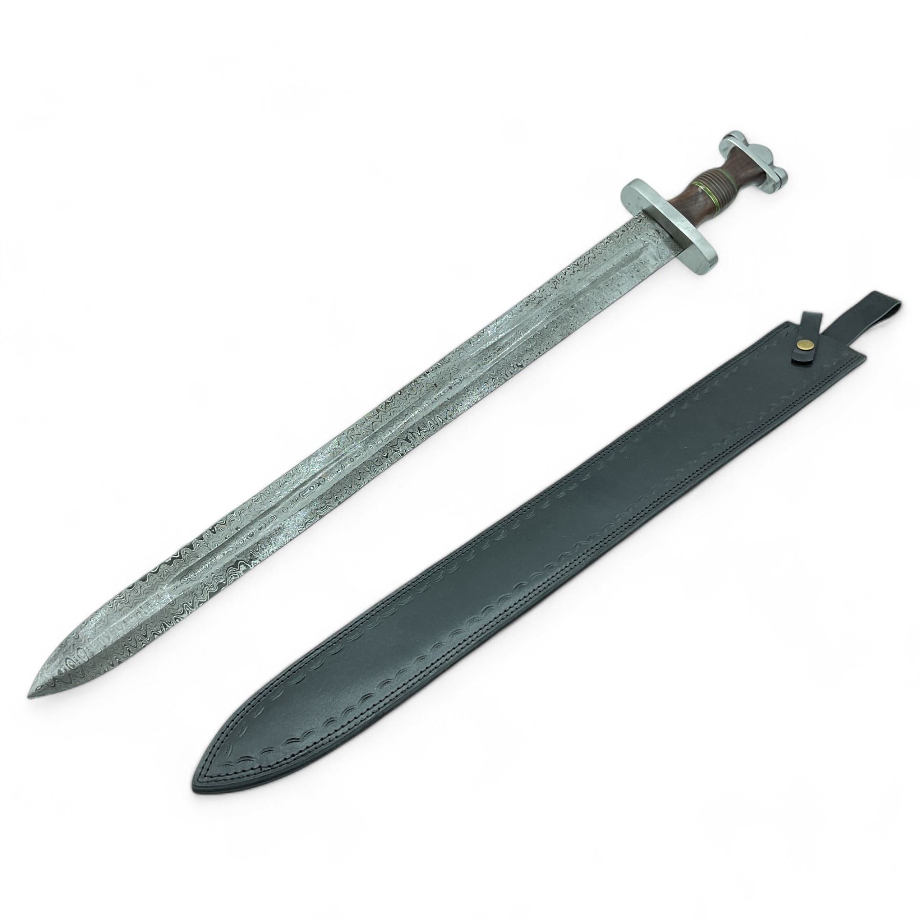 Fixed 24" Damascus Blade Sword with Leather Belt Sheath