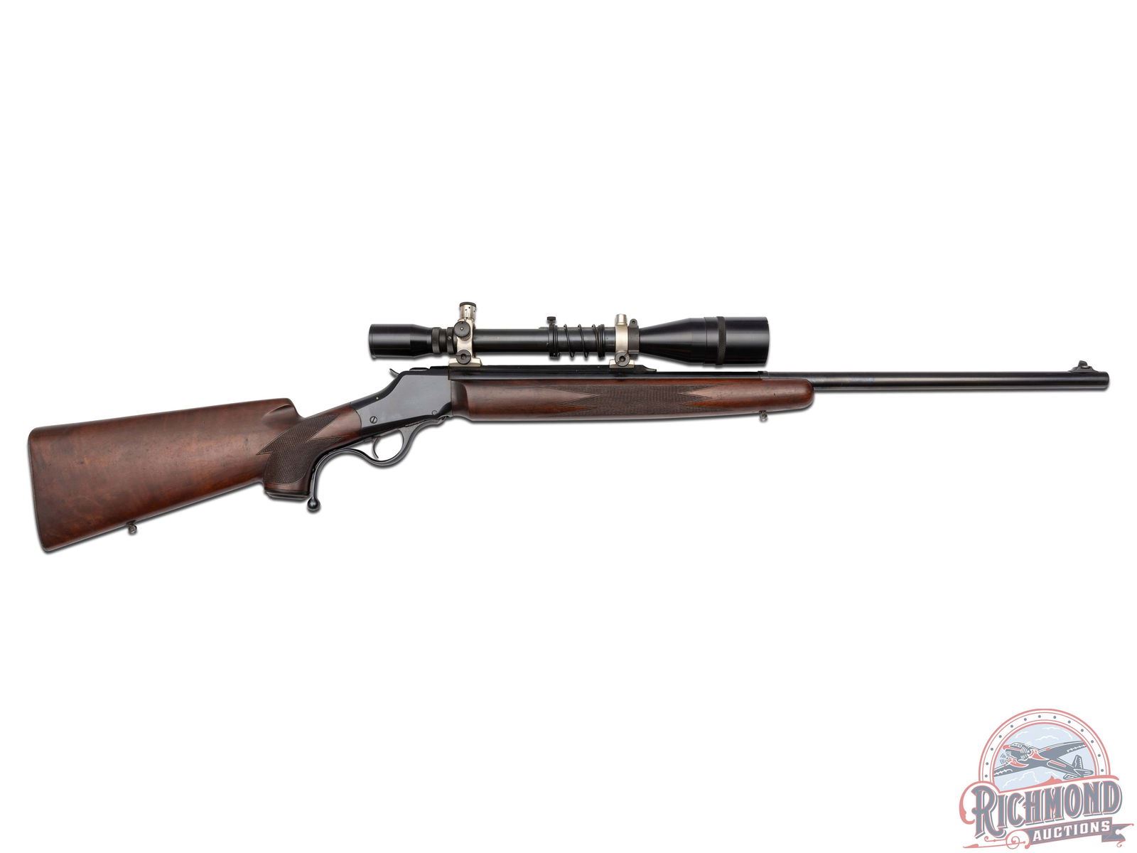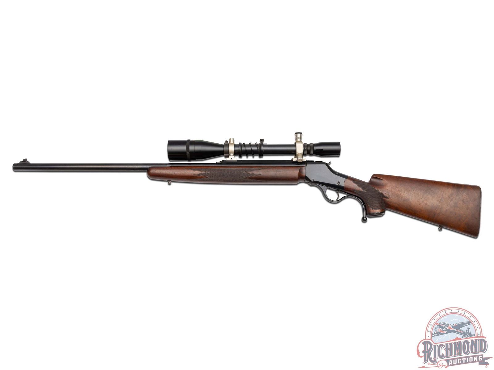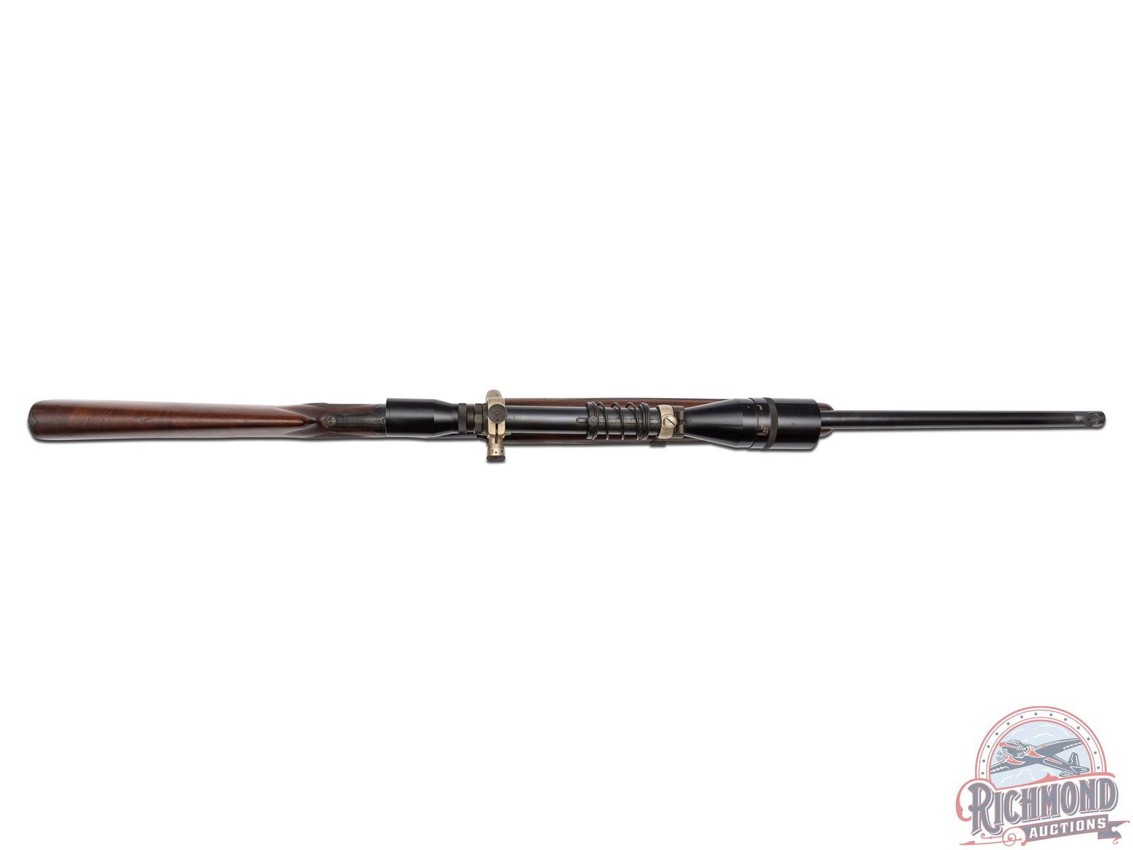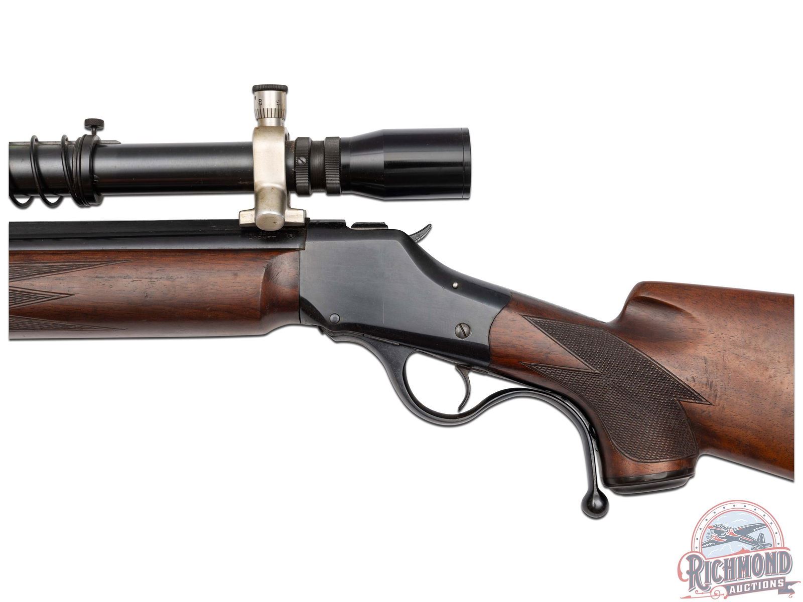 Made originally by Winchester Repeating Arms and then rebarreled and customized by R.F. Sedgley of Philadelphia, Pennsylvania, circa 1930. Fitted with Sedgley marked 28" round blued medium weight barrel with ramped dovetail front sight, quarter rib with Unertl 10x scope in 22 Hornet caliber. Blued coil spring Highwall action with extended opening level and standard trigger. Custom walnut checkered pistol grip stock with Winchester Steel Widow's peek butt plate and hard rubber grip cap. Matching walnut checkered beavertail type forearm. J.T. Livengood Collection. CALIBER: 22 Hornet. S/N: 124. FFL STATUS: Curio & Relic.