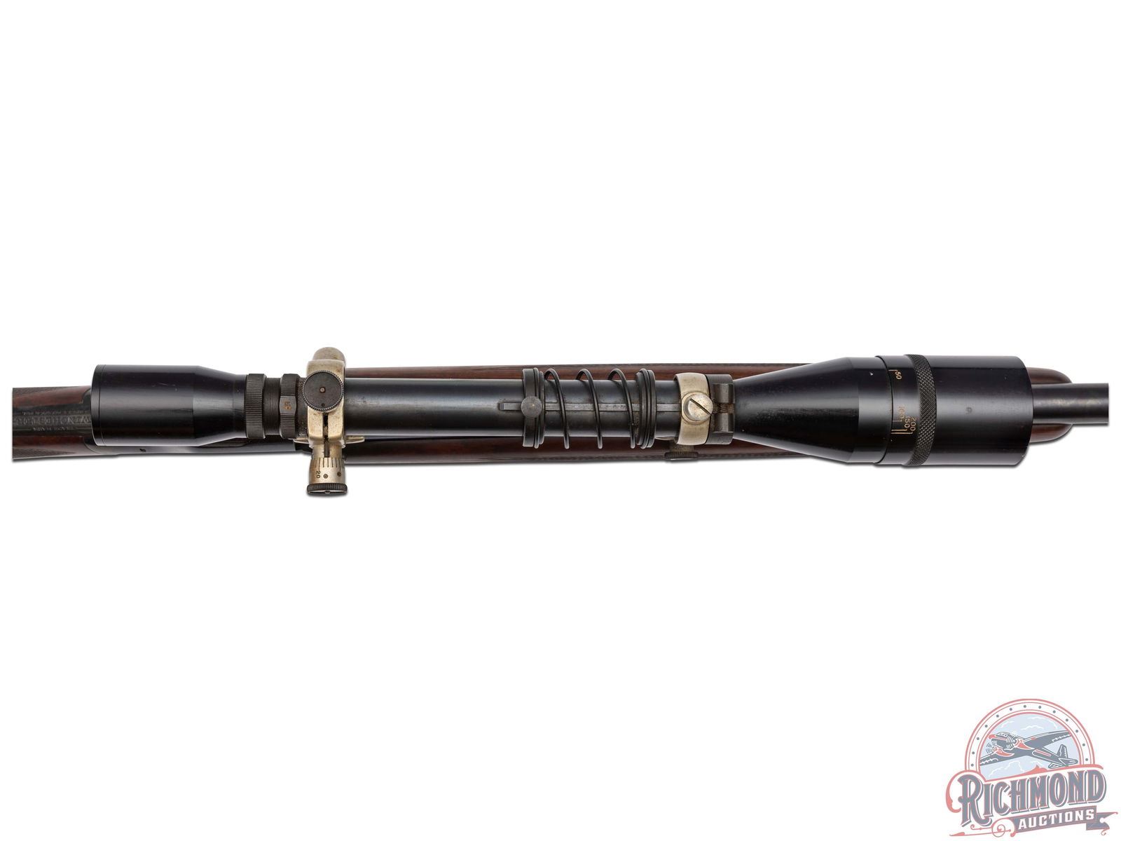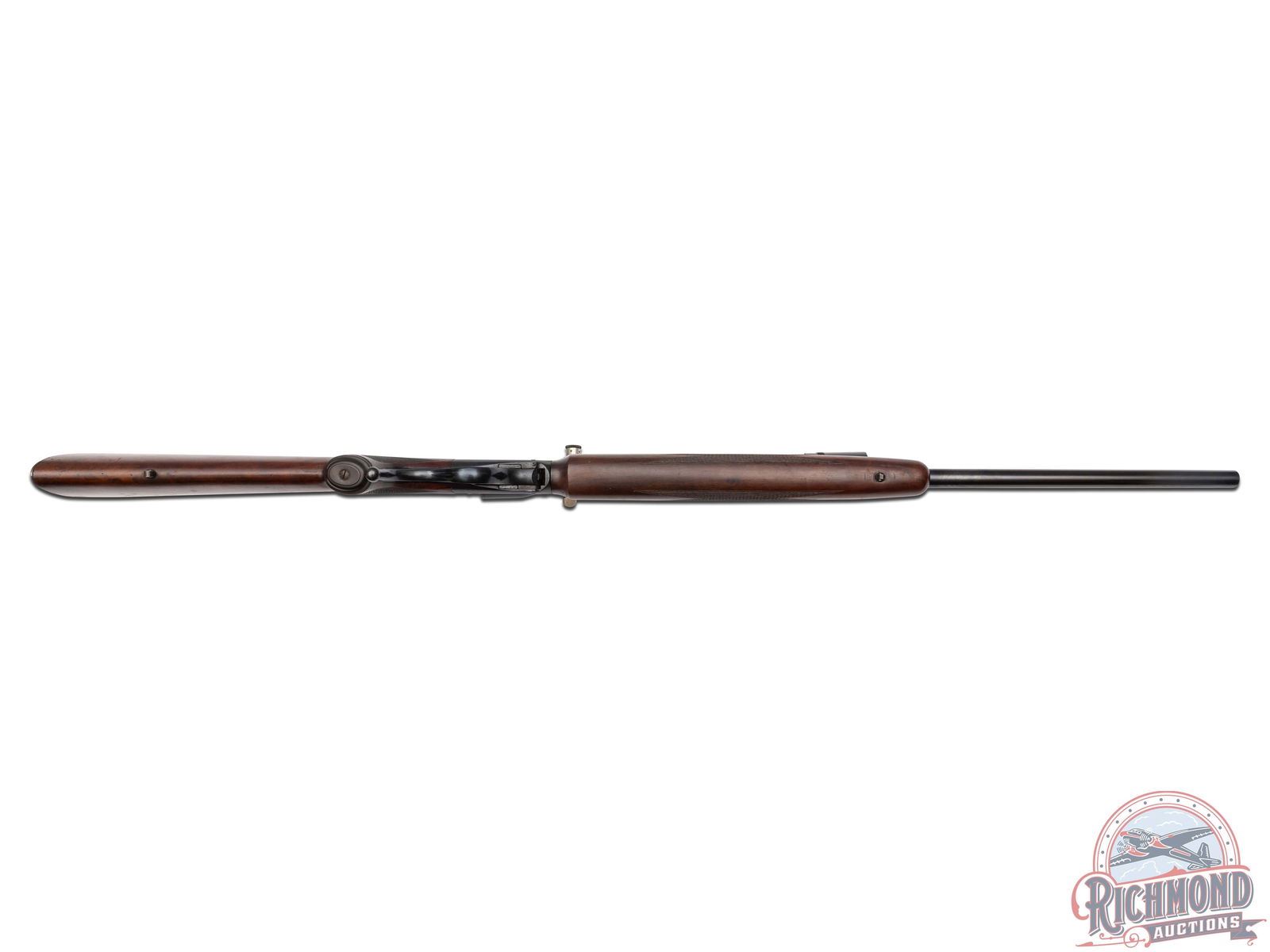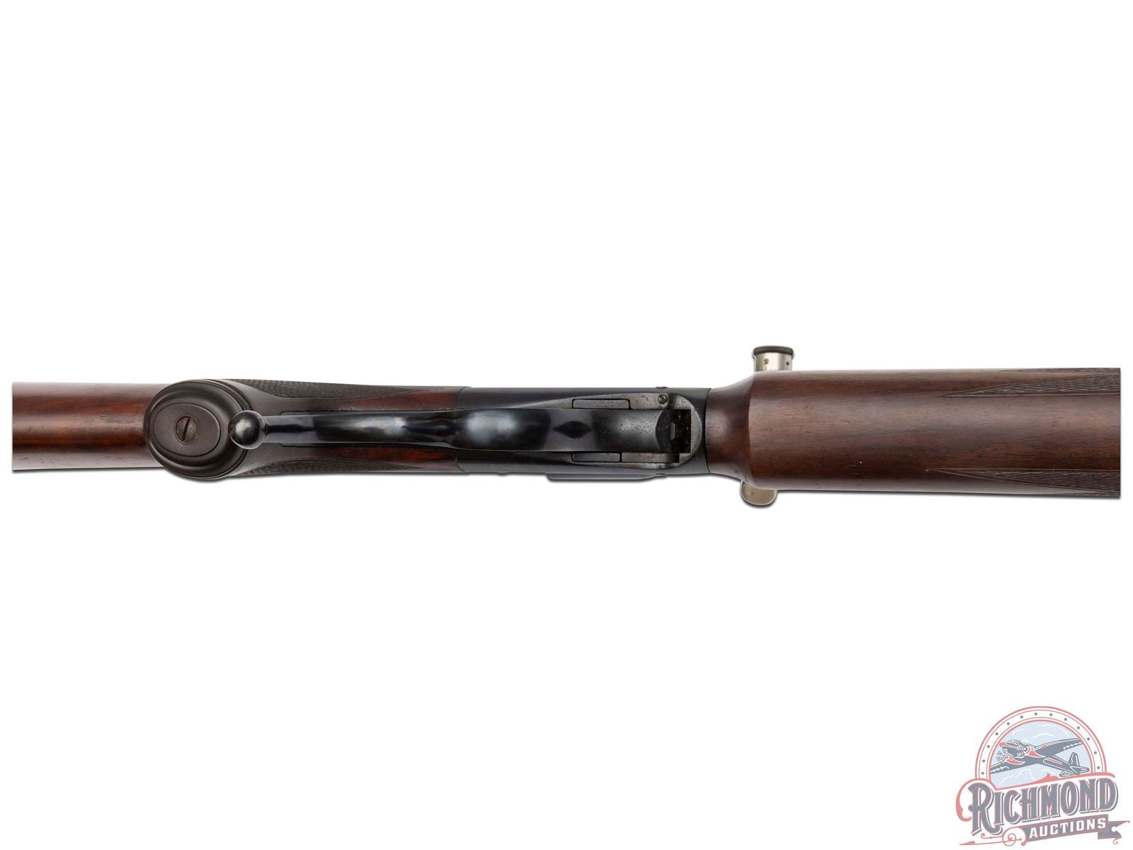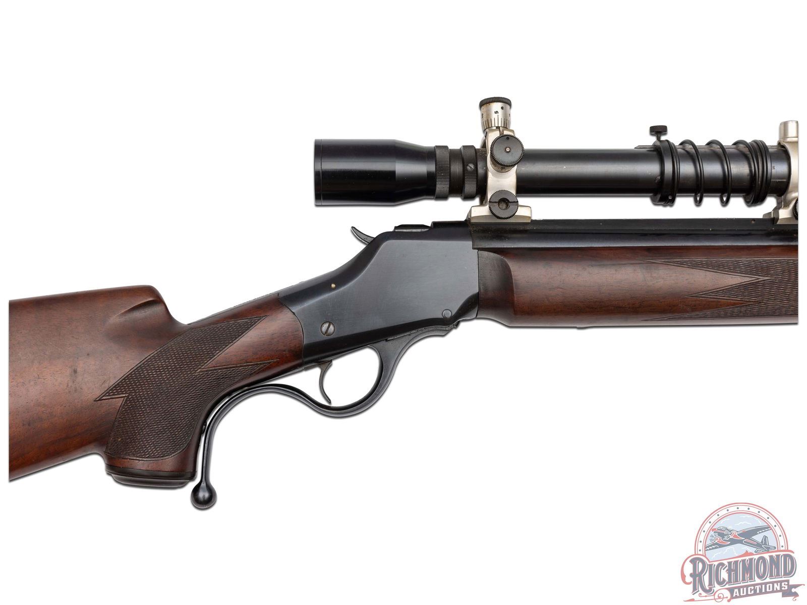 Made originally by Winchester Repeating Arms and then rebarreled and customized by R.F. Sedgley of Philadelphia, Pennsylvania, circa 1930. Fitted with Sedgley marked 28" round blued medium weight barrel with ramped dovetail front sight, quarter rib with Unertl 10x scope in 22 Hornet caliber. Blued coil spring Highwall action with extended opening level and standard trigger. Custom walnut checkered pistol grip stock with Winchester Steel Widow's peek butt plate and hard rubber grip cap. Matching walnut checkered beavertail type forearm. J.T. Livengood Collection. CALIBER: 22 Hornet. S/N: 124. FFL STATUS: Curio & Relic.