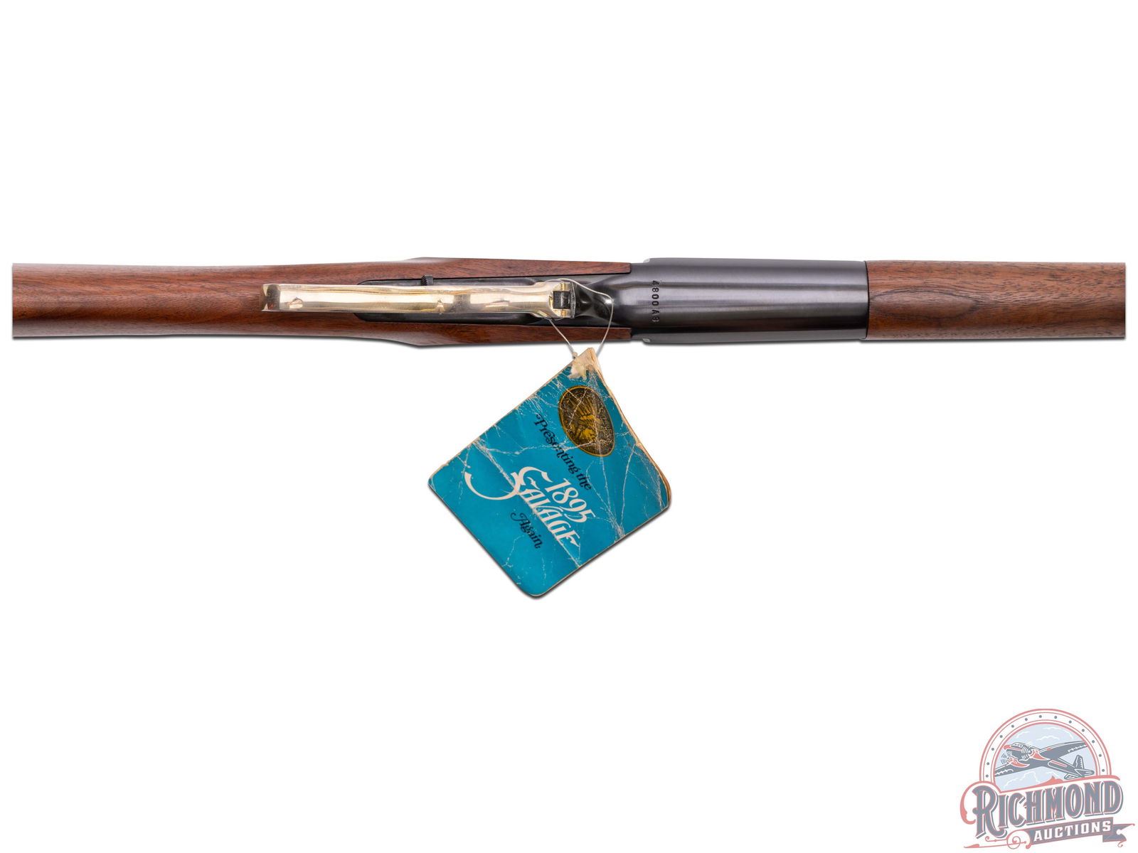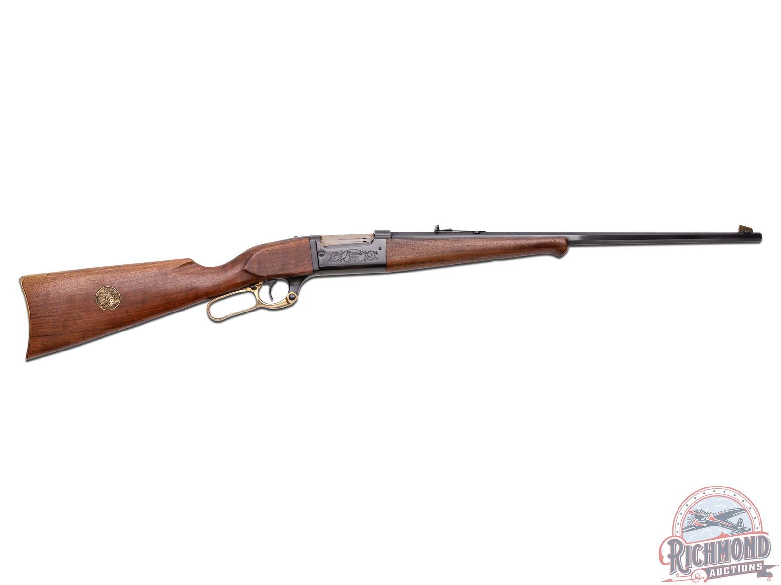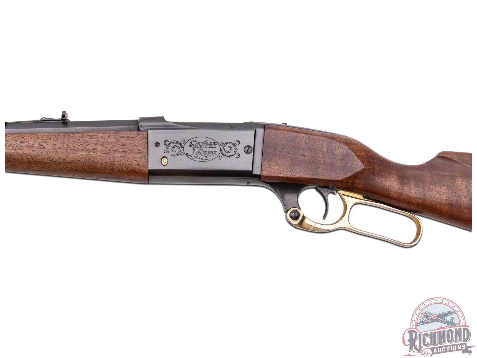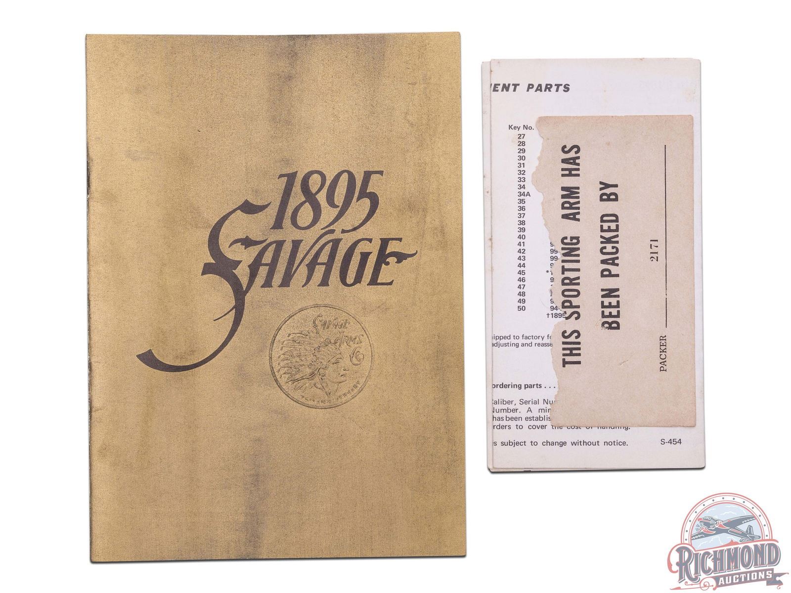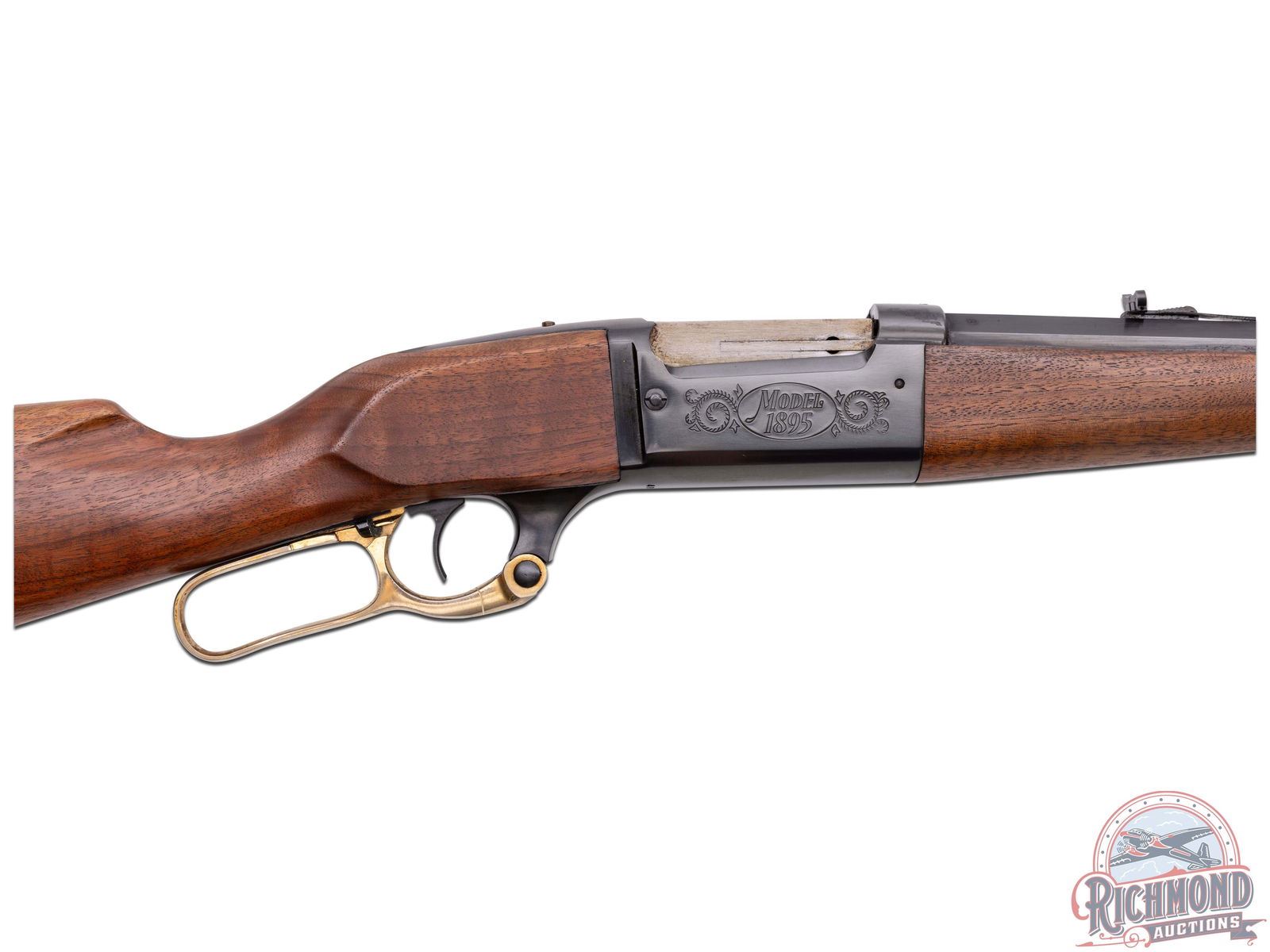 Manufactured in 1970 to commemorate the 75th Anniversary of the model 1895. Features a 24" octagon barrel stamped "SAVAGE ARMS, WESTFIELD, MASS. U.S.A. PATENTED FEB. 7.1893 / HI-PRESSURE STEEL - PROOF-TESTED - CAL. 308 WIN.". The top of the chamber has an oval "SP" proof mark, and the left is stamped with "10X". Rear notch sight with adjustable elevator and brass blade front. Blued receiver, factory drilled and tapped. Left side featuring scroll engraving and marked "SAVAGE / ARMS". The right side of the receiver features scroll engraving and marked "MODEL / 1895". Gold washed lever and follower. Lever manual safety and serrated trigger. Smooth satin walnut stock with straight grip and forearm with Schnabel tip. Right side of the butt stock has a gold tone inlaid Savage Arms Indian logo 75th Anniversary Medallion. Fitted with a brass crescent butt plate. Includes original hanging tag still intact and comes in the factory original box with sleeve and all original paperwork. LOP: 13-1/2". CALIBER: 308 WIN. S/N: 4800AS. FFL STATUS: Curio & Relic.