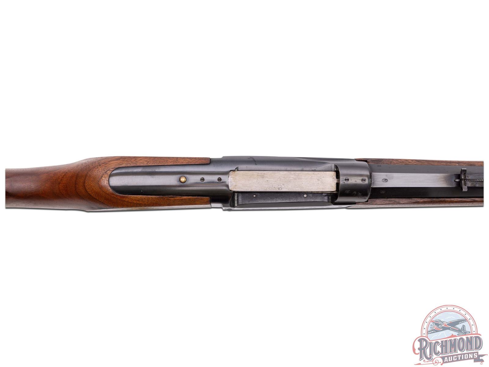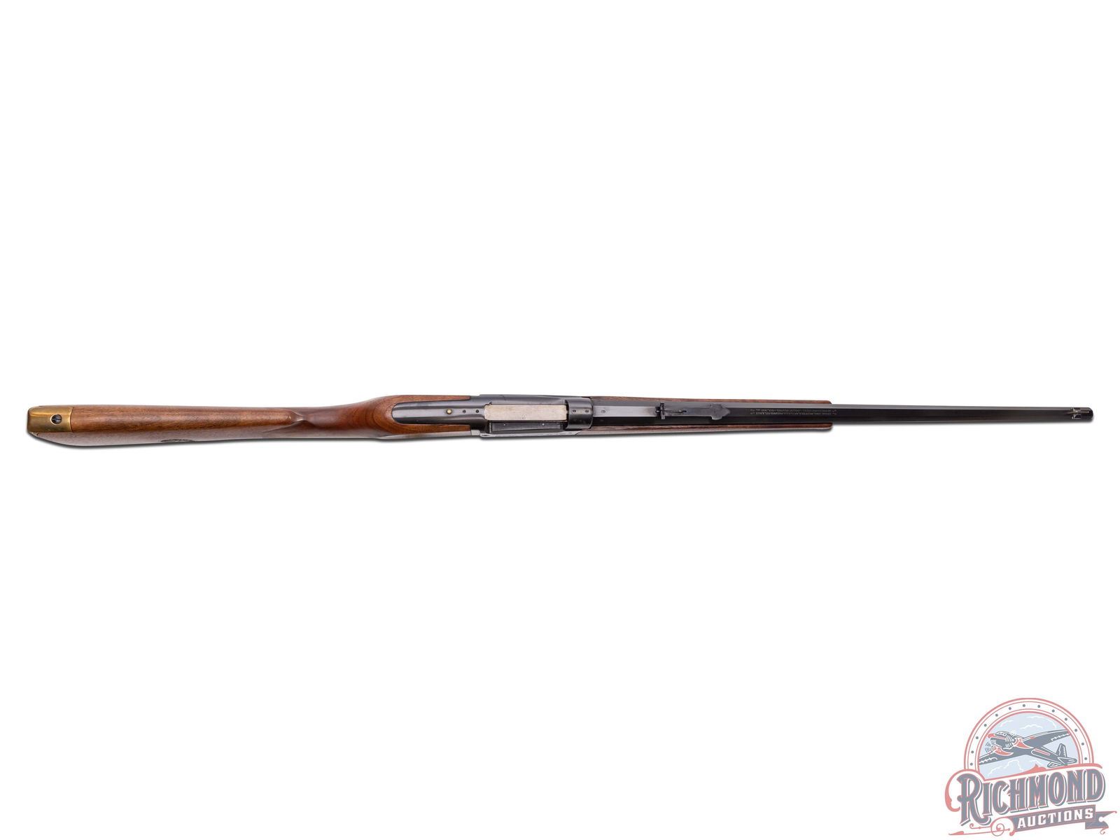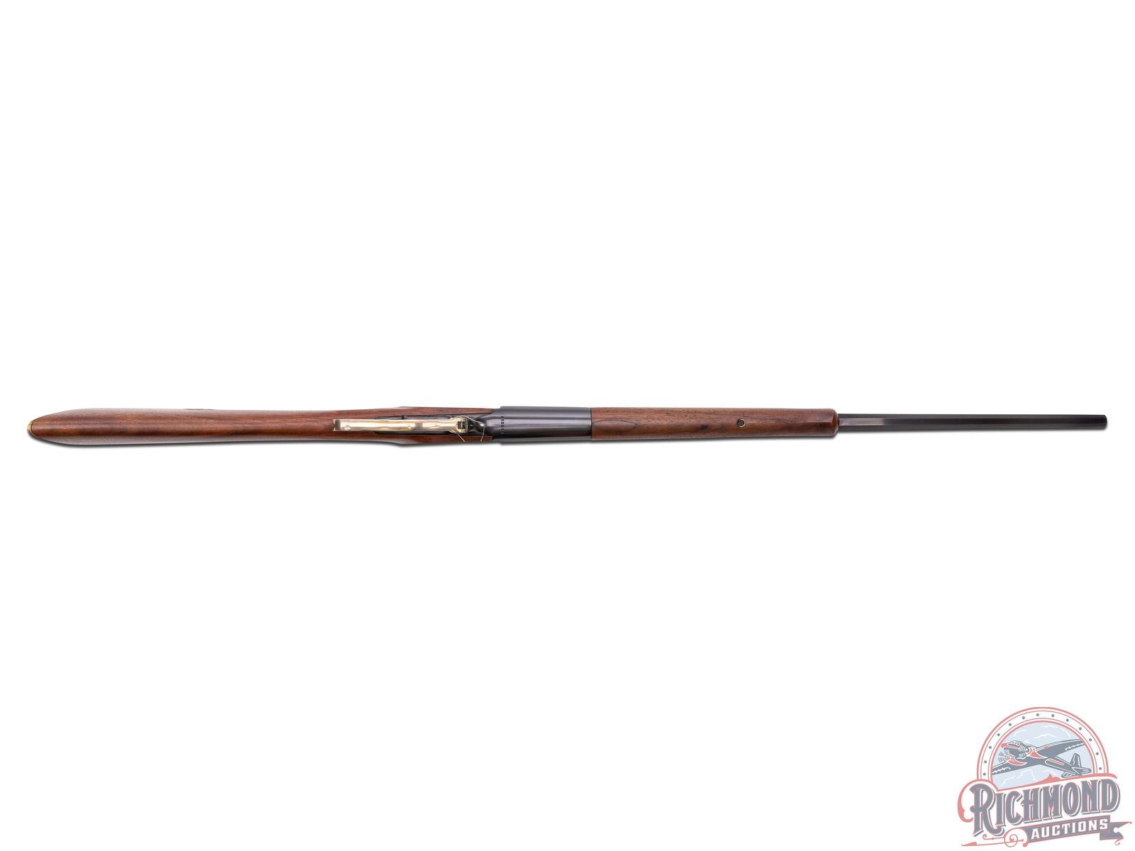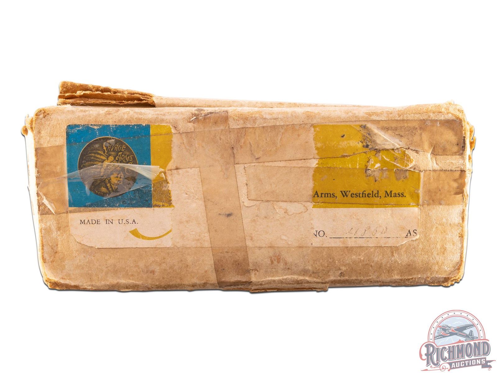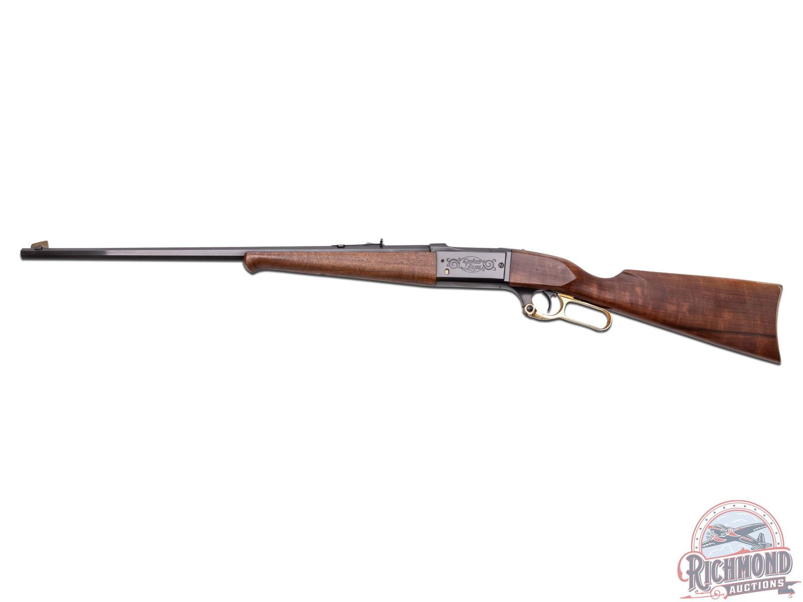 Manufactured in 1970 to commemorate the 75th Anniversary of the model 1895. Features a 24" octagon barrel stamped "SAVAGE ARMS, WESTFIELD, MASS. U.S.A. PATENTED FEB. 7.1893 / HI-PRESSURE STEEL - PROOF-TESTED - CAL. 308 WIN.". The top of the chamber has an oval "SP" proof mark, and the left is stamped with "10X". Rear notch sight with adjustable elevator and brass blade front. Blued receiver, factory drilled and tapped. Left side featuring scroll engraving and marked "SAVAGE / ARMS". The right side of the receiver features scroll engraving and marked "MODEL / 1895". Gold washed lever and follower. Lever manual safety and serrated trigger. Smooth satin walnut stock with straight grip and forearm with Schnabel tip. Right side of the butt stock has a gold tone inlaid Savage Arms Indian logo 75th Anniversary Medallion. Fitted with a brass crescent butt plate. Includes original hanging tag still intact and comes in the factory original box with sleeve and all original paperwork. LOP: 13-1/2". CALIBER: 308 WIN. S/N: 4800AS. FFL STATUS: Curio & Relic.