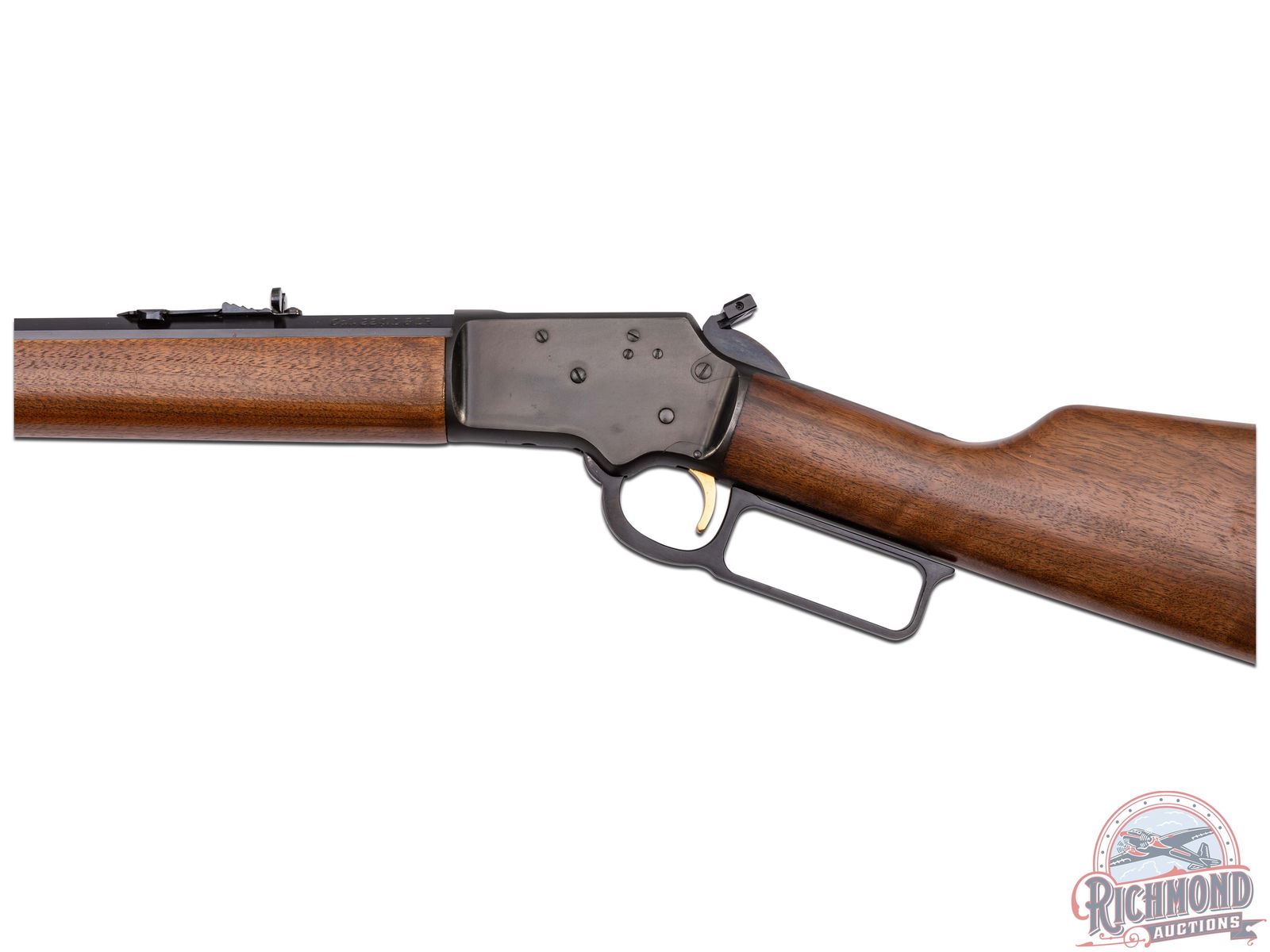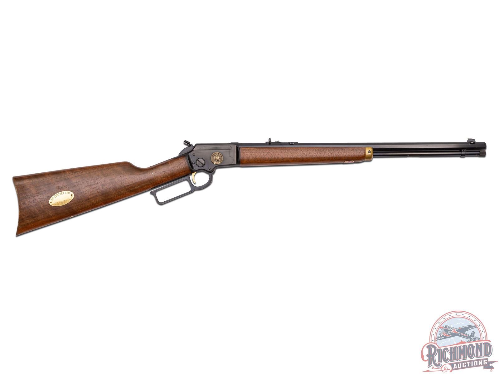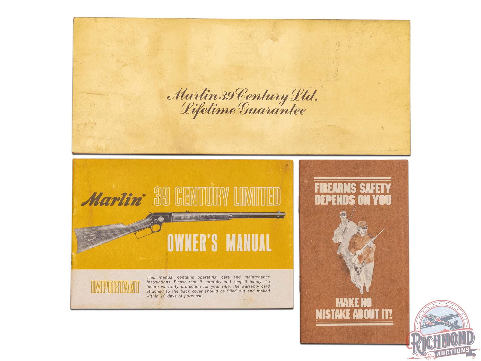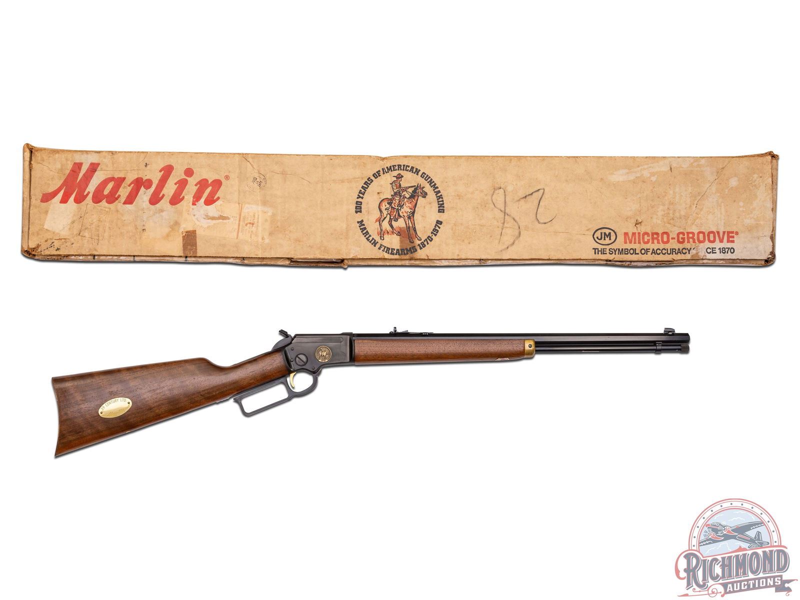 Manufactured in 1970 to commemorate the 100th Anniversary of Marlin Firearms Model 39. Features a 19-1/2" blued octagon barrel with full length magazine tube. Rear adjustable semi-buckhorn sight and front blade with brass bead. Top of the barrel is stamped "MARLIN 39 CENTURY LTD" with a two-line Marlin address. JM stamped barrel with the black bullseye on the bottom of the stock. Blued receiver with brass inlaid medallion on the right side, features the Marlin cowboy logo with dates 1870 and 1970. Gold washed trigger and hammer extension. Fancy straight walnut stock and forearm fitted with a brass end cap and butt plate. forearm still has the original "SOLID AMERICAN WALNUT" sticker. Brass plate adorns the right side of the stock stamped in yellow "39 CENTURY LTD. / 100 MARLIN YEARS". Comes in the original box with the factory original paperwork. LOP: 13". CALIBER: 22 S/L/LR. S/N: 34538. FFL STATUS: Curio & Relic.