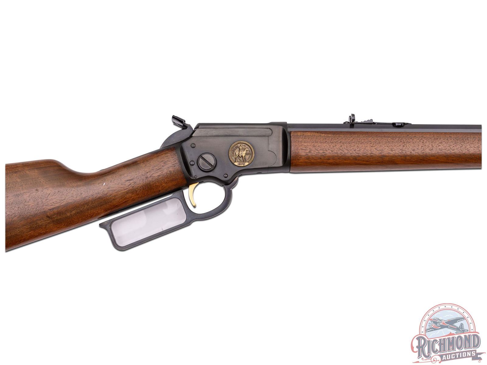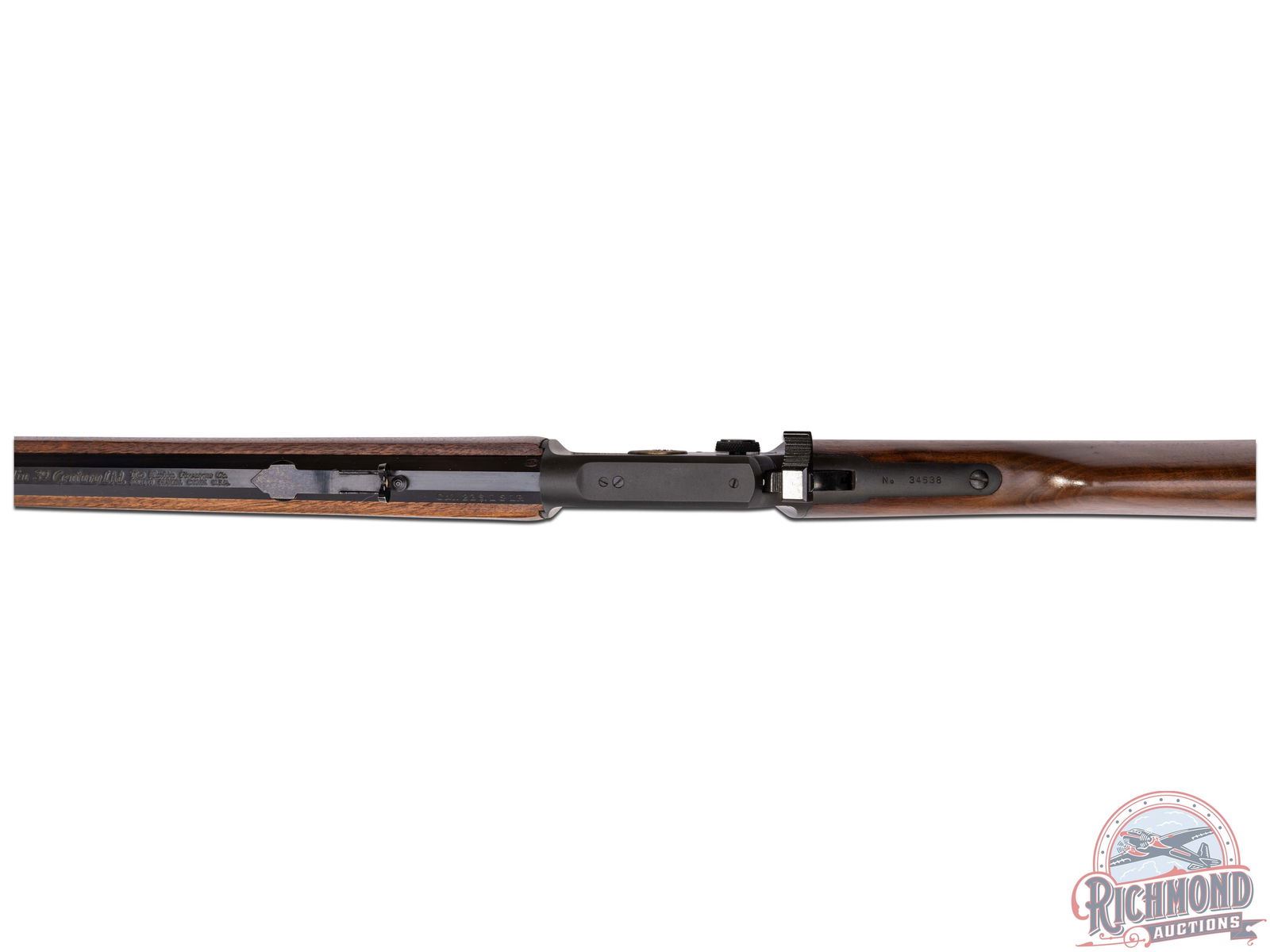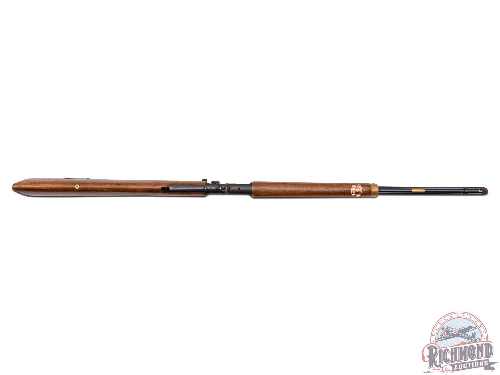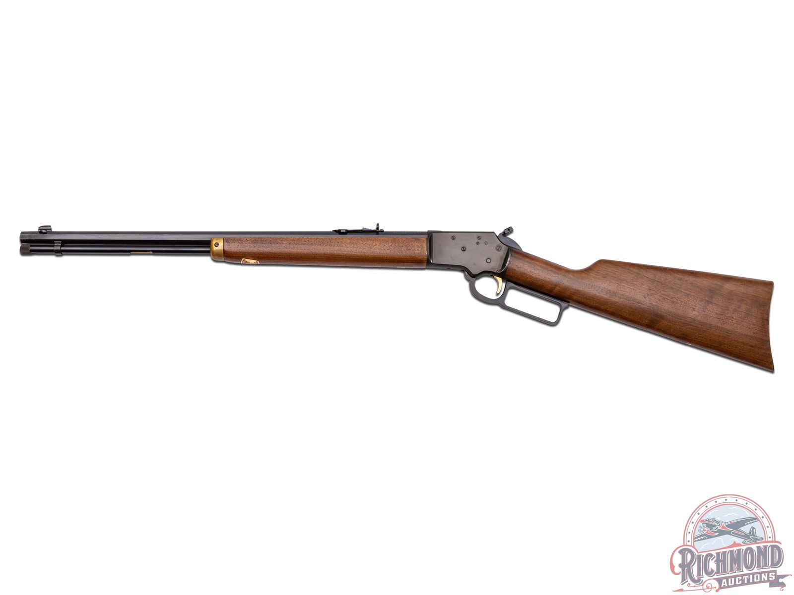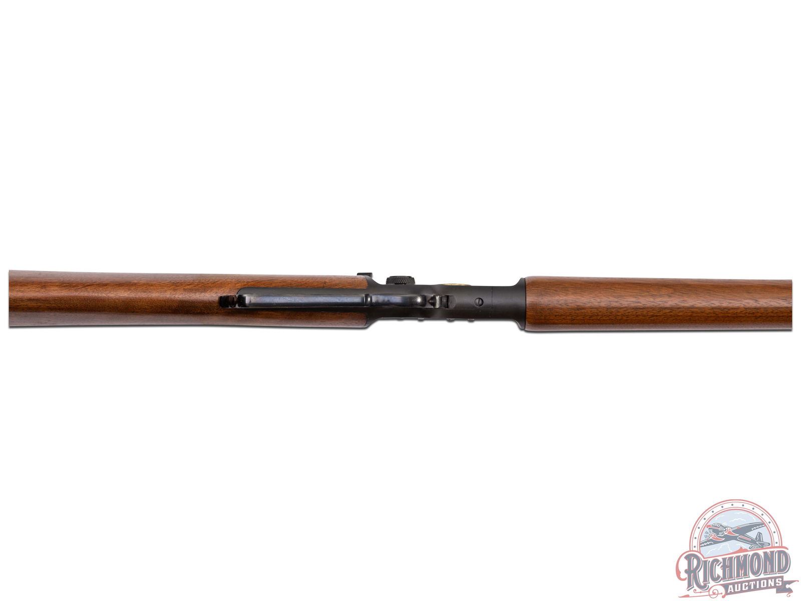 Manufactured in 1970 to commemorate the 100th Anniversary of Marlin Firearms Model 39. Features a 19-1/2" blued octagon barrel with full length magazine tube. Rear adjustable semi-buckhorn sight and front blade with brass bead. Top of the barrel is stamped "MARLIN 39 CENTURY LTD" with a two-line Marlin address. JM stamped barrel with the black bullseye on the bottom of the stock. Blued receiver with brass inlaid medallion on the right side, features the Marlin cowboy logo with dates 1870 and 1970. Gold washed trigger and hammer extension. Fancy straight walnut stock and forearm fitted with a brass end cap and butt plate. forearm still has the original "SOLID AMERICAN WALNUT" sticker. Brass plate adorns the right side of the stock stamped in yellow "39 CENTURY LTD. / 100 MARLIN YEARS". Comes in the original box with the factory original paperwork. LOP: 13". CALIBER: 22 S/L/LR. S/N: 34538. FFL STATUS: Curio & Relic.