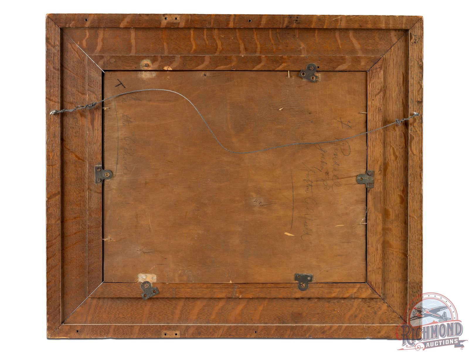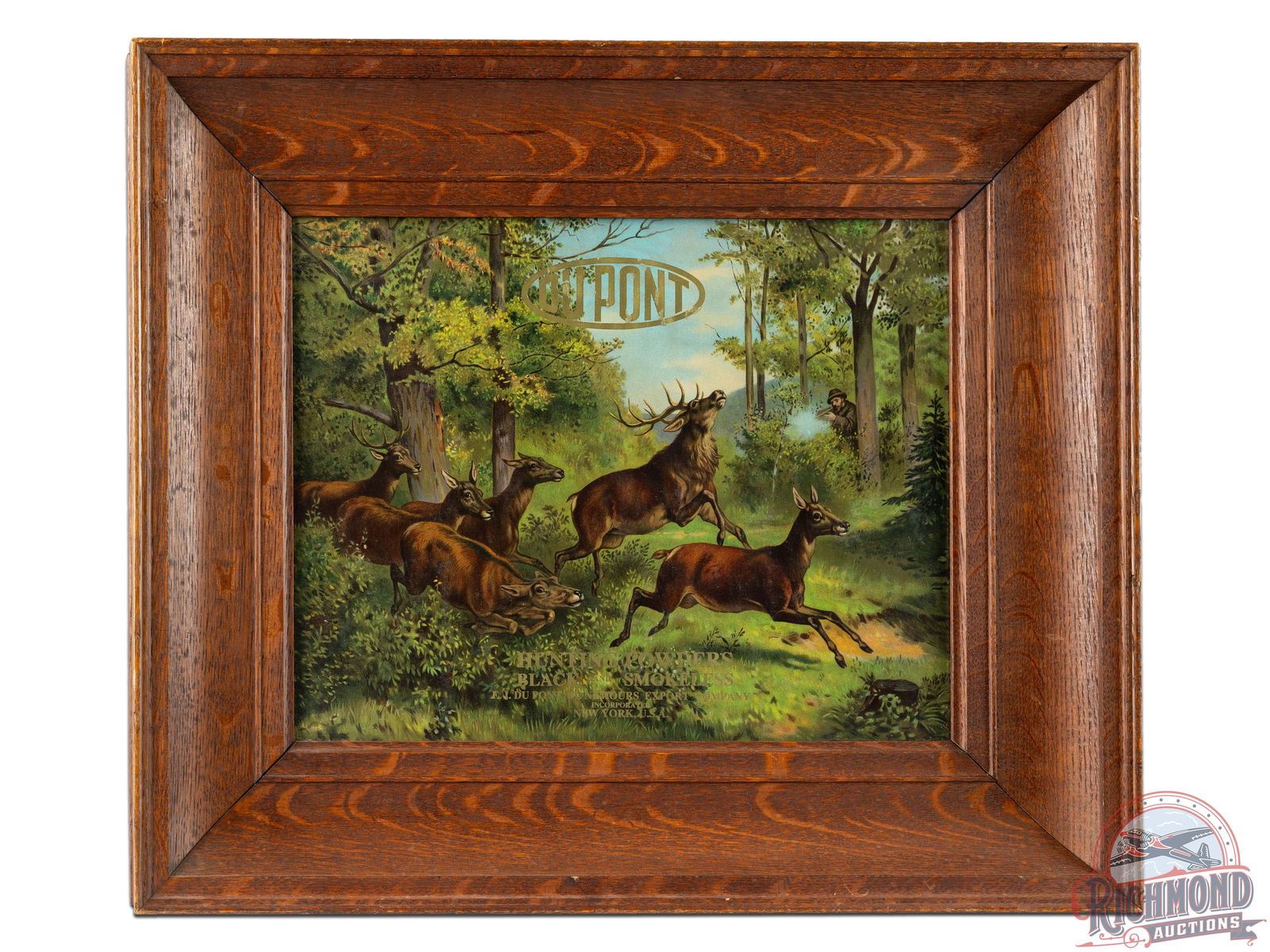 Framed paper poster with vibrant color and a great hunting scene featuring a hunter taking down an elk as several cows escape. Exhibits some flaking in the DuPont gold lettering as well as one spot of repair/touch-up in the "U." Mounted under glass in a heavy wooden frame. Marked E.I. DuPont De Nemours Export Company, Incorporated, New York, USA. 19.5" H x 22.75" W.
