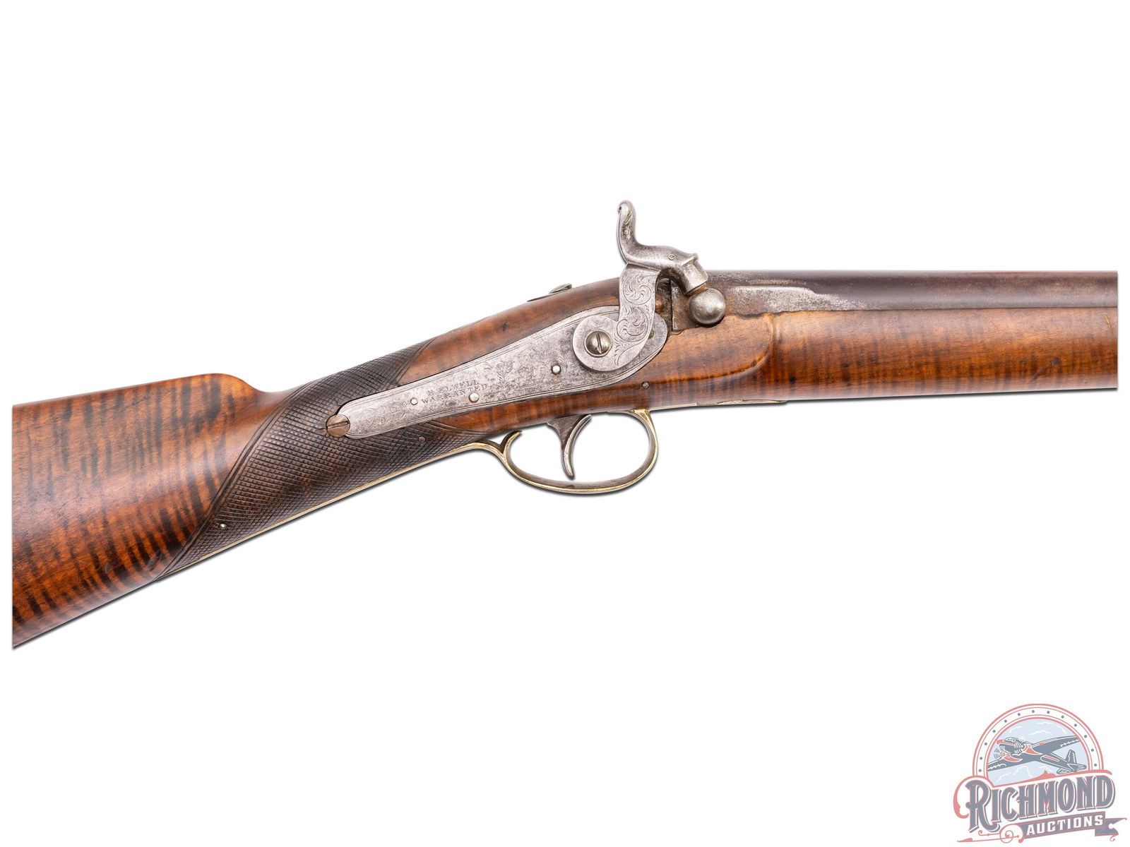 Made by Henry Lechler Jr. circa 1840's in Philadelphia, Pennsylvania. Measures 50" overall length with a 34" smoothbore 75 caliber (roughly 12 gauge) round barrel with bead front sight and "U.S." stamp with maker's "H. Lechler Phila" marking. Barrel is a recycled musket barrel. "H.Elwell Warranted" marked back action percussion lock with single trigger control. Curly maple checkered half stock with brass floral engraved hardware and escutcheon plates. Comes with hardwood ramrod with brass tip. CALIBER: 75. FFL STATUS: Antique.