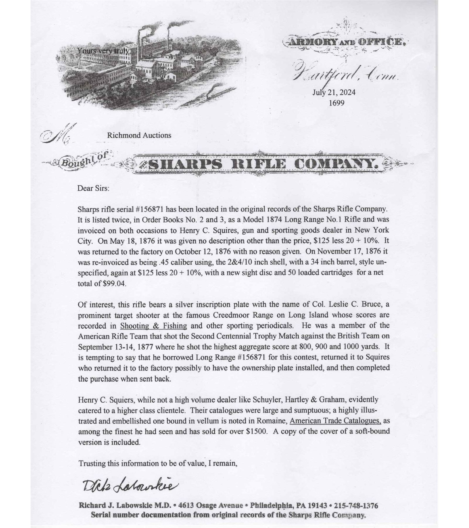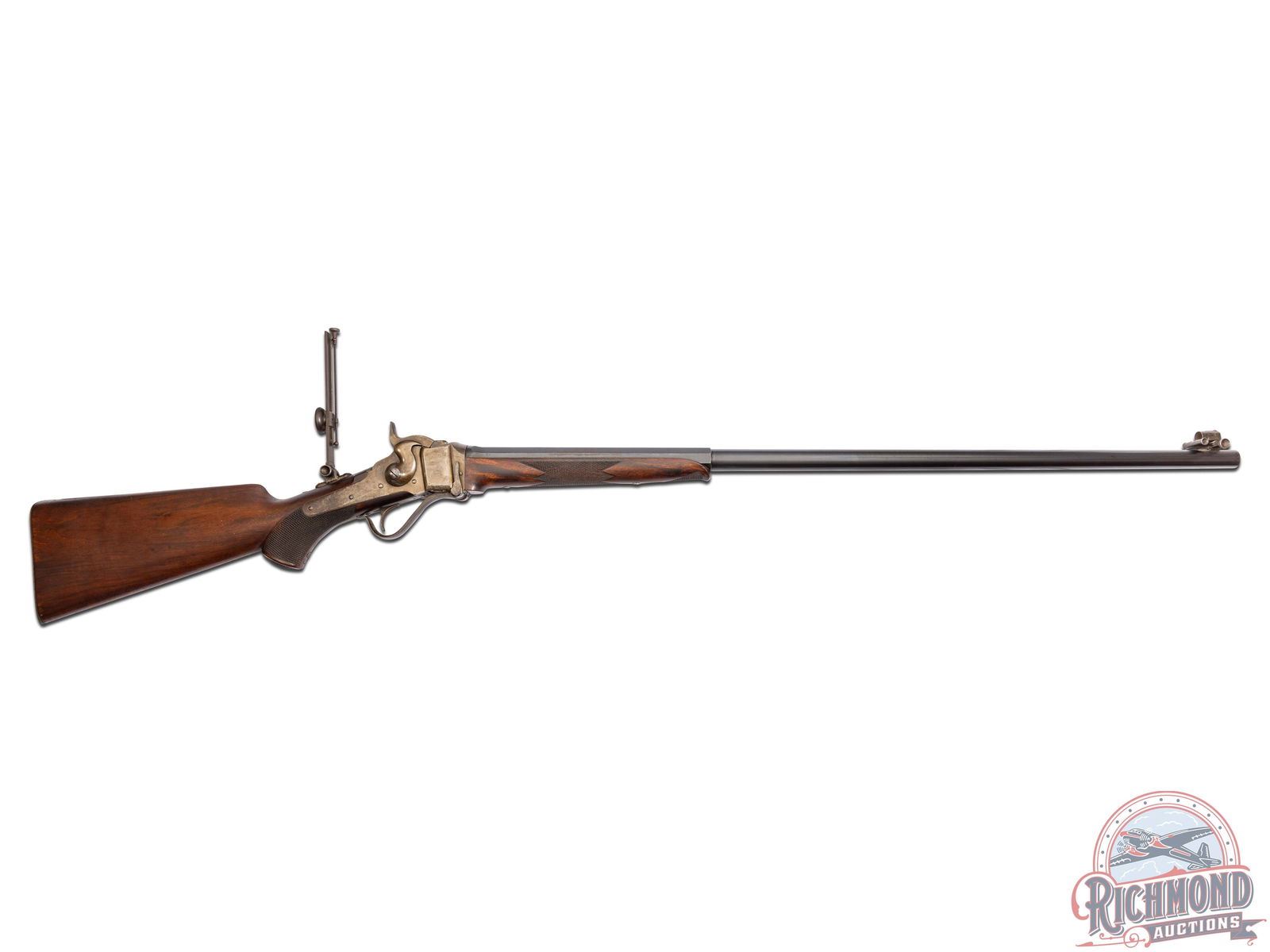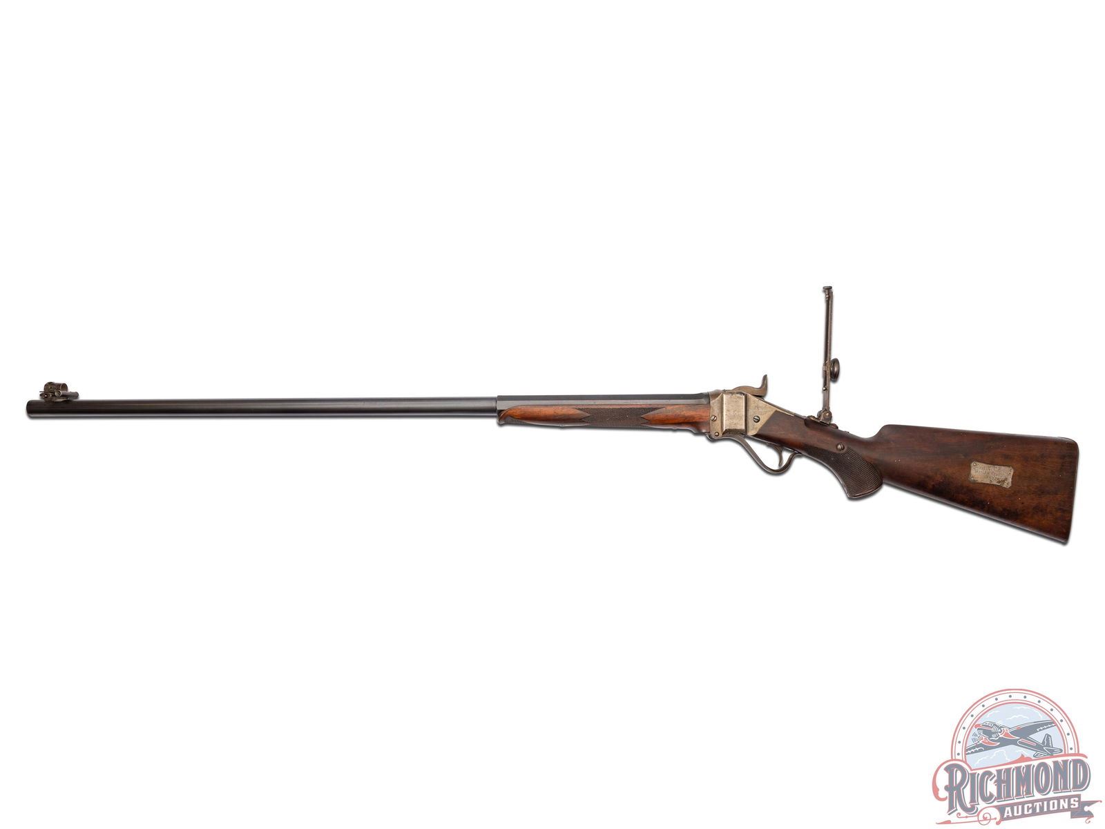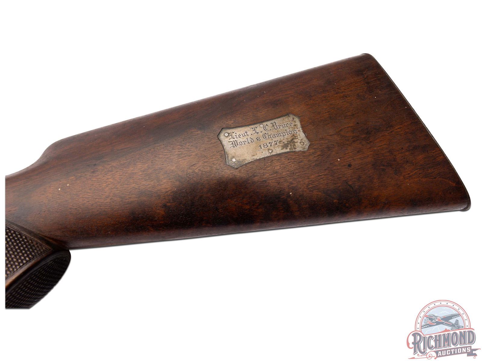 Made by the Sharps Rifle Company at Bridgeport, Connecticut in 1876. Rifle is listed in Factory Letter as being at the factory twice, leaving the first time a Model 1874 Long Range No. 1 to Henry C. Squires of New York, NY. Squires was a huge dealer of sporting goods around the late 1800's into the turn of the century. The second time, no model or reason is given for the return other than cost and a list of accessories. This rifle has a silver plaque on the right side of the stock that is engraved "Lieut L.C. Bruce / World's Champion / 1877". It is well known Leslie Combs Bruce shot the highest score at Creedmoor in 1877 defeating the British and Irish for the World's Championship. One can speculate as the factory letter does not show direct purchase. Did Bruce borrow this rifle from the Squires Firm and shoot it in this match? Upon return did Squires have this rifle embossed with the silver plate as a marketing item? The equivalent today might be a guitar used by Elvis. These shooters were the celebrities of the day and their opinion carried a lot of weight. The actual reason is lost to history. This rifle features a blued 34" half-octagon tapered barrel with globe spirit level front sight. No rear sight provision with tang having a long range Vernier sight numbered "156871" and measuring 6" from top to pivot point. Barrel is serial numbered to gun under forearm and is marked with "Old Reliable" stamping and Bridgeport address with "Cal 45" marking at breech. Case-hardened 1874 action with checkered single trigger control and Sharps 1869 patent on left. Walnut checkered pistol grip stock with steel checkered butt plate and base for heel sight. Grip is checkered in lieu of a grip cap. Walnut checkered Schnabel forearm with serial number penciled on inside. A super rifle with factory letter and Squires Catalog print. Jack T. Livengood Collection. CALIBER: 45 - 2-4/10. S/N: 156871. FFL STATUS: Antique.