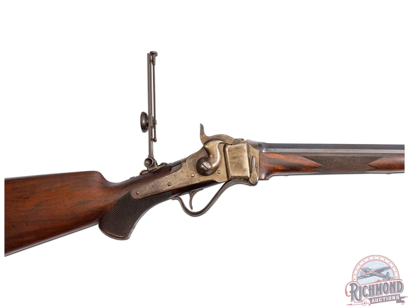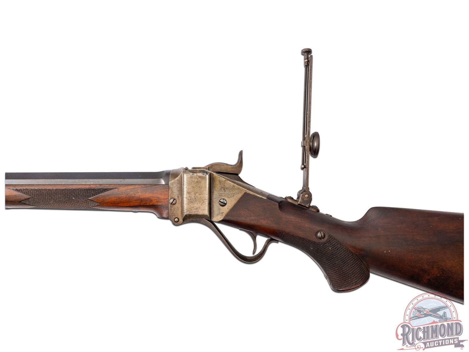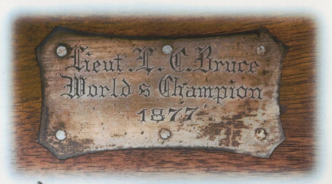 Made by the Sharps Rifle Company at Bridgeport, Connecticut in 1876. Rifle is listed in Factory Letter as being at the factory twice, leaving the first time a Model 1874 Long Range No. 1 to Henry C. Squires of New York, NY. Squires was a huge dealer of sporting goods around the late 1800's into the turn of the century. The second time, no model or reason is given for the return other than cost and a list of accessories. This rifle has a silver plaque on the right side of the stock that is engraved "Lieut L.C. Bruce / World's Champion / 1877". It is well known Leslie Combs Bruce shot the highest score at Creedmoor in 1877 defeating the British and Irish for the World's Championship. One can speculate as the factory letter does not show direct purchase. Did Bruce borrow this rifle from the Squires Firm and shoot it in this match? Upon return did Squires have this rifle embossed with the silver plate as a marketing item? The equivalent today might be a guitar used by Elvis. These shooters were the celebrities of the day and their opinion carried a lot of weight. The actual reason is lost to history. This rifle features a blued 34" half-octagon tapered barrel with globe spirit level front sight. No rear sight provision with tang having a long range Vernier sight numbered "156871" and measuring 6" from top to pivot point. Barrel is serial numbered to gun under forearm and is marked with "Old Reliable" stamping and Bridgeport address with "Cal 45" marking at breech. Case-hardened 1874 action with checkered single trigger control and Sharps 1869 patent on left. Walnut checkered pistol grip stock with steel checkered butt plate and base for heel sight. Grip is checkered in lieu of a grip cap. Walnut checkered Schnabel forearm with serial number penciled on inside. A super rifle with factory letter and Squires Catalog print. Jack T. Livengood Collection. CALIBER: 45 - 2-4/10. S/N: 156871. FFL STATUS: Antique.