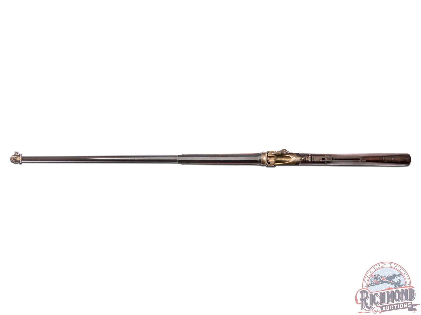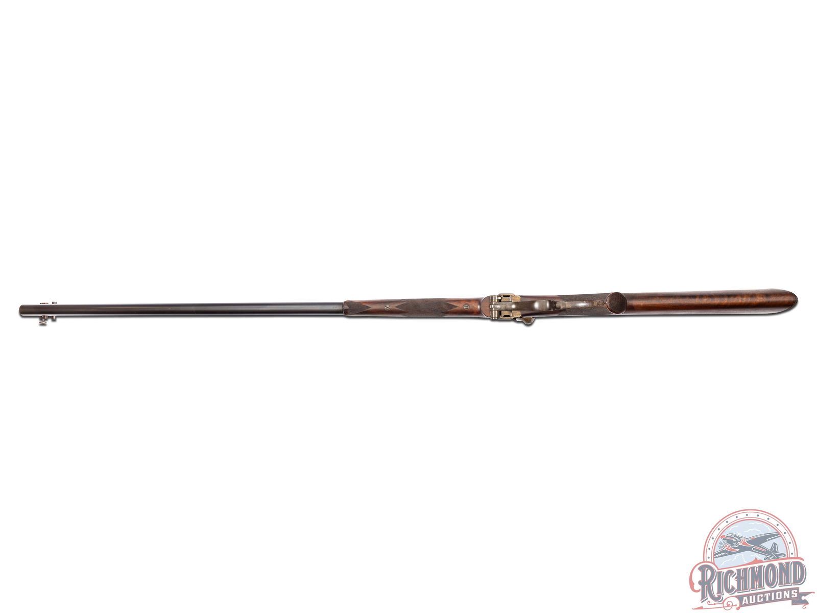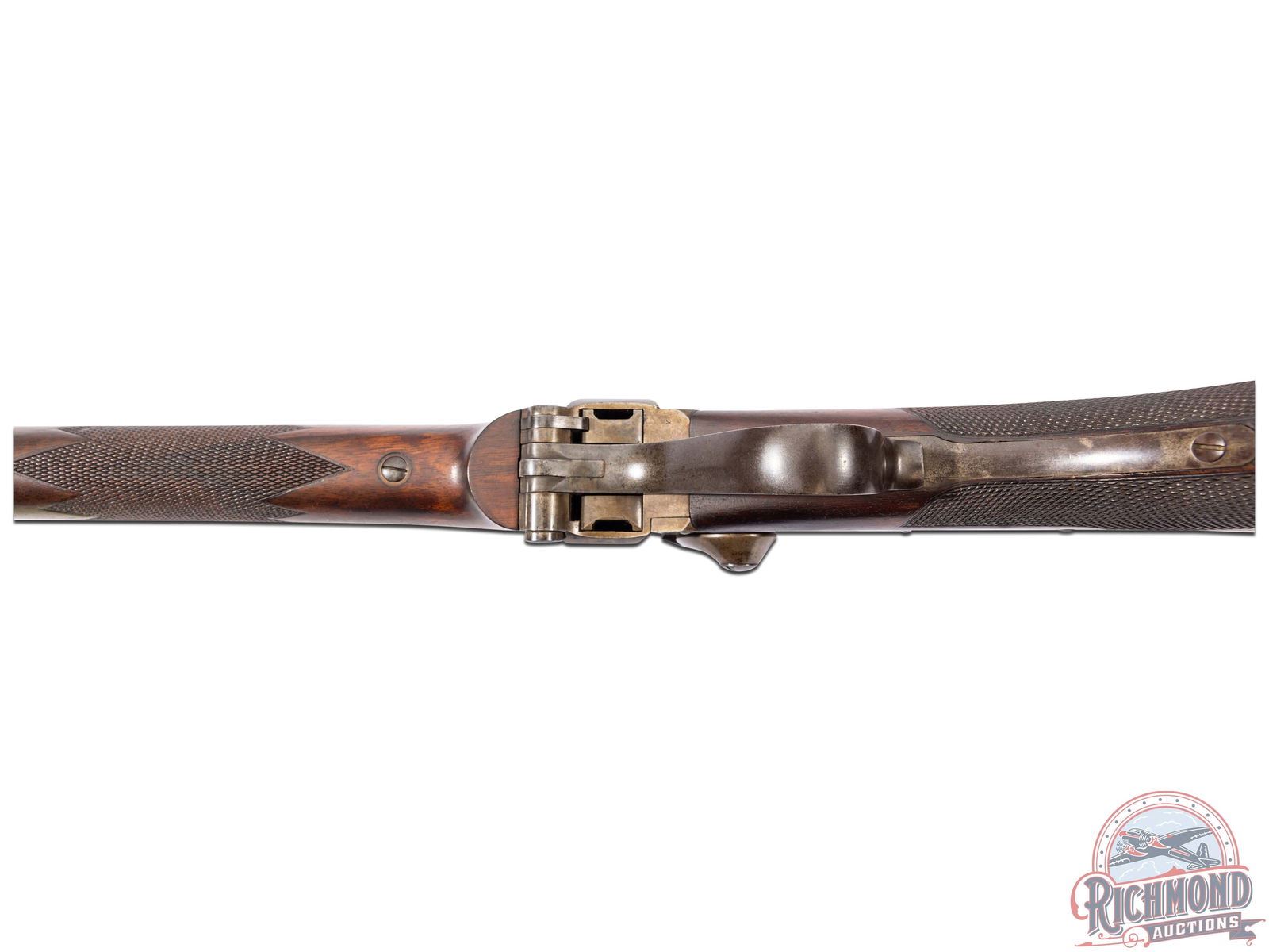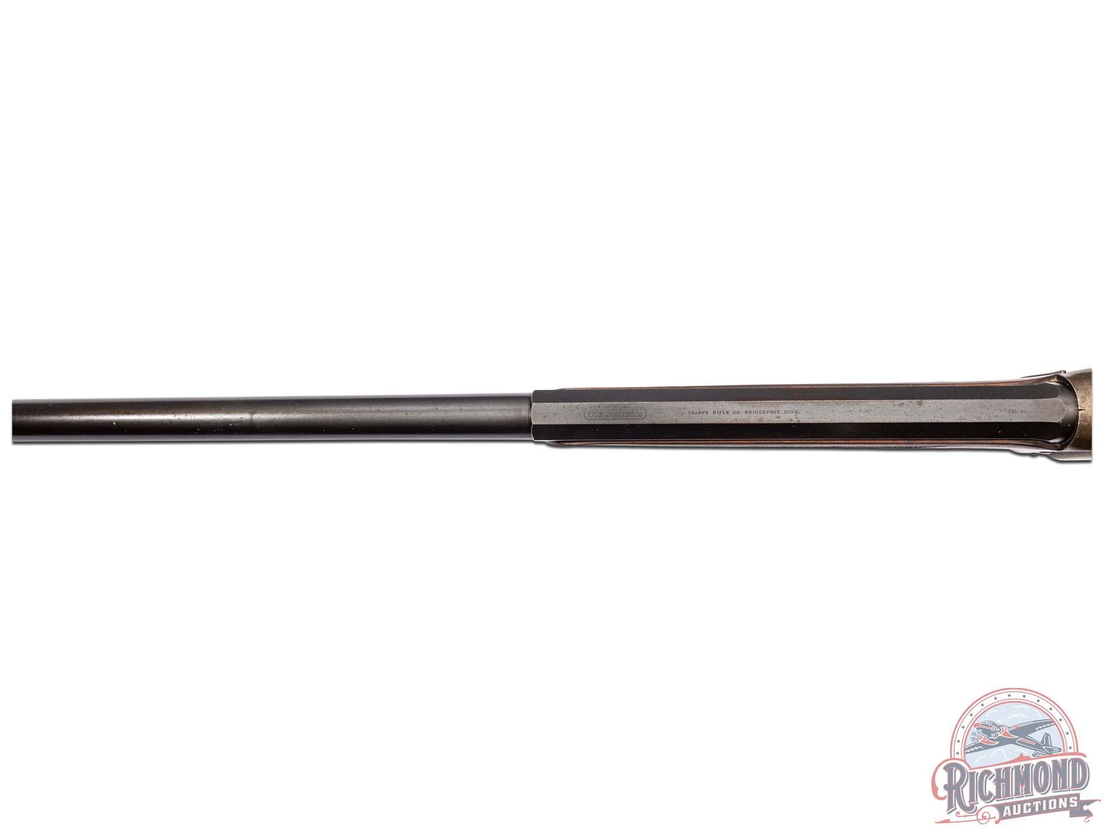 Made by the Sharps Rifle Company at Bridgeport, Connecticut in 1876. Rifle is listed in Factory Letter as being at the factory twice, leaving the first time a Model 1874 Long Range No. 1 to Henry C. Squires of New York, NY. Squires was a huge dealer of sporting goods around the late 1800's into the turn of the century. The second time, no model or reason is given for the return other than cost and a list of accessories. This rifle has a silver plaque on the right side of the stock that is engraved "Lieut L.C. Bruce / World's Champion / 1877". It is well known Leslie Combs Bruce shot the highest score at Creedmoor in 1877 defeating the British and Irish for the World's Championship. One can speculate as the factory letter does not show direct purchase. Did Bruce borrow this rifle from the Squires Firm and shoot it in this match? Upon return did Squires have this rifle embossed with the silver plate as a marketing item? The equivalent today might be a guitar used by Elvis. These shooters were the celebrities of the day and their opinion carried a lot of weight. The actual reason is lost to history. This rifle features a blued 34" half-octagon tapered barrel with globe spirit level front sight. No rear sight provision with tang having a long range Vernier sight numbered "156871" and measuring 6" from top to pivot point. Barrel is serial numbered to gun under forearm and is marked with "Old Reliable" stamping and Bridgeport address with "Cal 45" marking at breech. Case-hardened 1874 action with checkered single trigger control and Sharps 1869 patent on left. Walnut checkered pistol grip stock with steel checkered butt plate and base for heel sight. Grip is checkered in lieu of a grip cap. Walnut checkered Schnabel forearm with serial number penciled on inside. A super rifle with factory letter and Squires Catalog print. Jack T. Livengood Collection. CALIBER: 45 - 2-4/10. S/N: 156871. FFL STATUS: Antique.