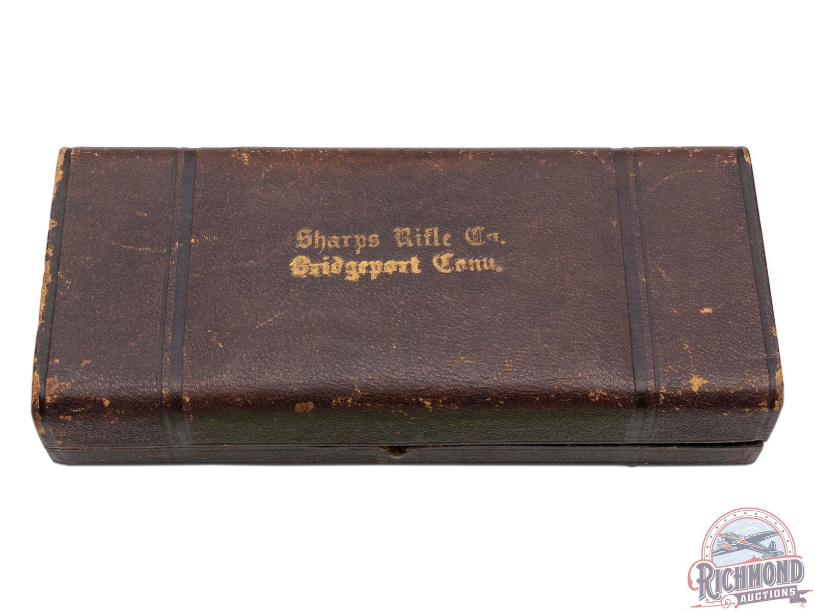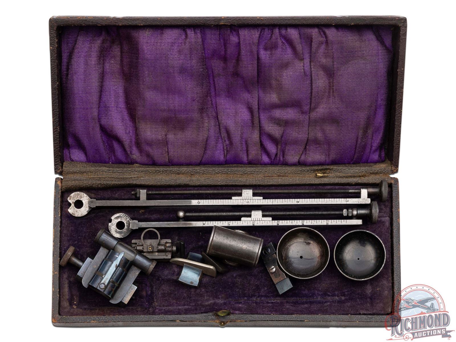 Manufactured by Sharps Rifle Company in Bridgeport, Connecticut circa 1880. Kit features long range staff Sharps Venier tang sight measuring 6-1/8" from top to pivot point and mid-range staff measuring 5-1/2" from top to pivot point. Kit includes Sharps globe Wind gage, front sight globe site, Beech front sight, two disc peep apertures, Rocky Mountain blade front sight, sheared blade front sight and notch graduated sight. Kit is missing base and some of these items do not belong in this kit but all are of the same time period. Sight staffs are non-serial numbered. The case is of brown leather with gold washed Sharp's logo and purple velvet lining.