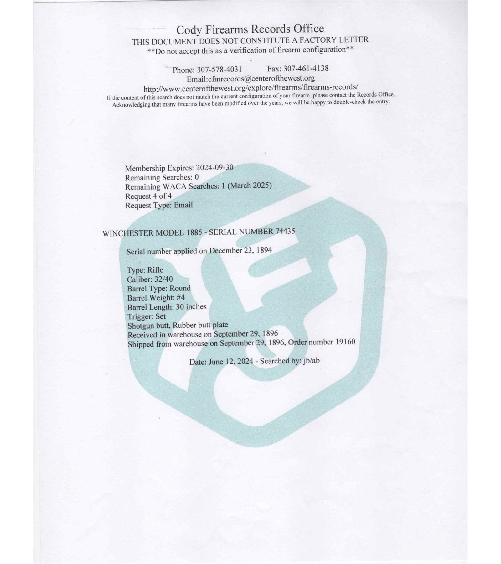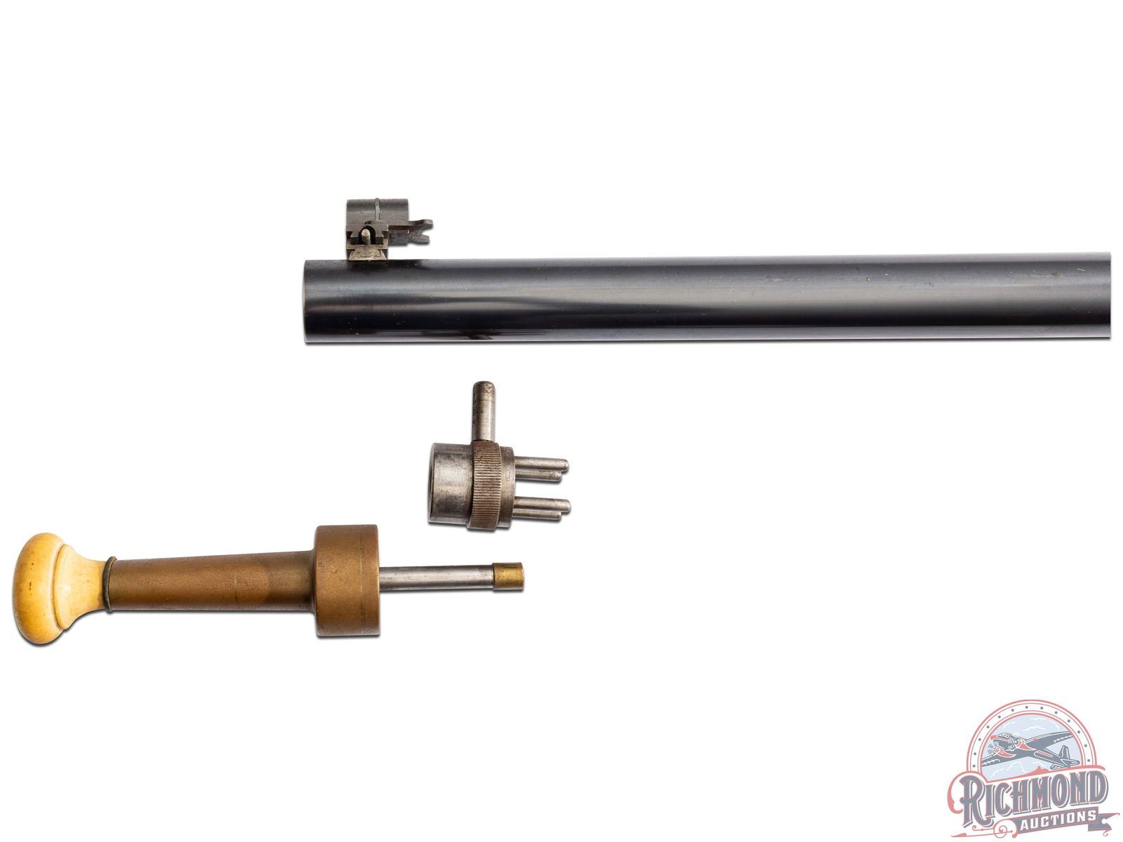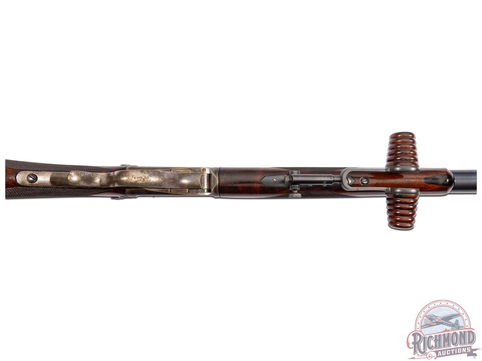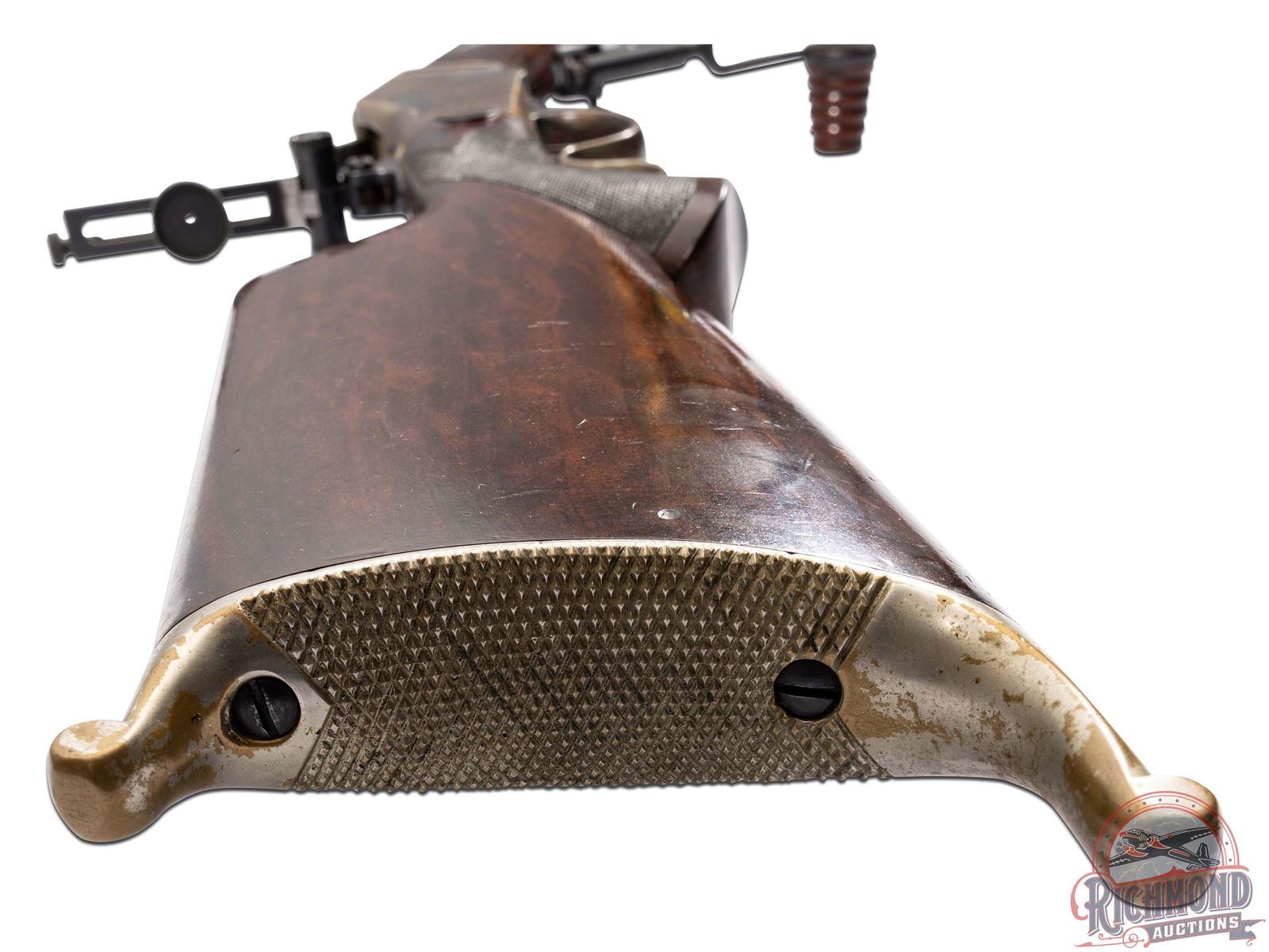 This rifle was originally manufactured by Winchester Repeating Arms Company in 32-40 caliber with a number 4 barrel. It has been re-barreled by Harry M. Pope at Hartford, Connecticut at an unknown date and rechambered to 39-55 caliber. Rifle's in-depth history is explained on page 376 of Warren Greatbatch's book, "H. M. Pope Hartford 1887-1901 Volume II". The rifle has a 32" round No. 3 weight barrel in 39-55 caliber marked "Rifled by H. M. Pope Hartford, Conn." with Wind gage front sight, no rear sight provision and a Soule tang sight serial numbered "54" . Barrel has unmarked Pope false muzzle and brass bullet starter with underside of barrel marked "16/94". Case-hardened flat spring Highwall action with close couple double set triggers and standard lever. Walnut checkered Schuetzen pistol grip stock with nickel plated Swiss butt plate. Butt stock appears to be work of A. O. Zischang. Standard Winchester checkered Deluxe splinter Schnabel forearm with Tuning Fork palm rest. Rifle comes with Cody Research stating original configuration. Rifle also comes with Pope grease pump, Pope mold, re and decapper, and bullet seater. J.T. Livengood Collection. CALIBER: 39-55. S/N: 74435. FFL STATUS: Antique.