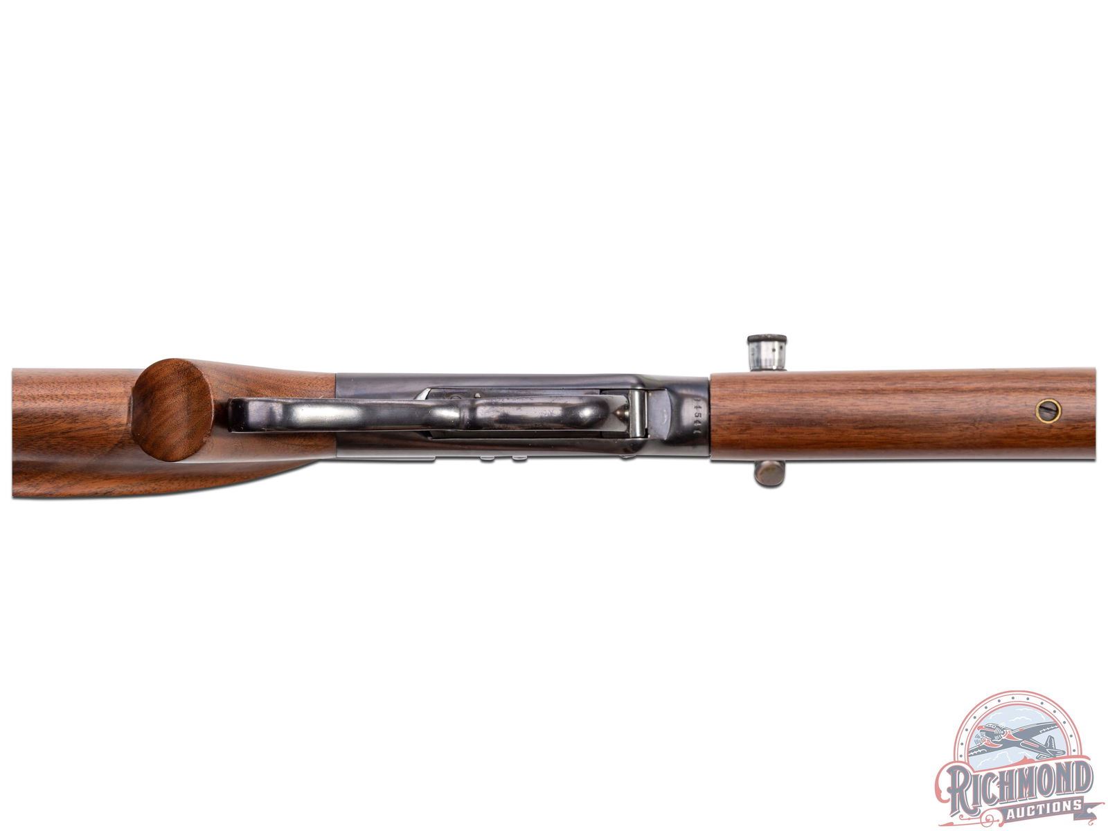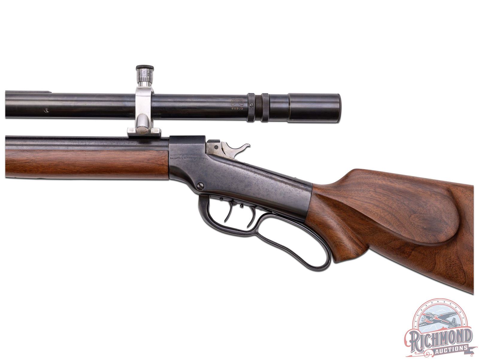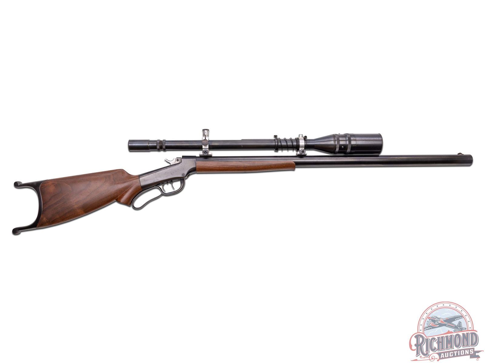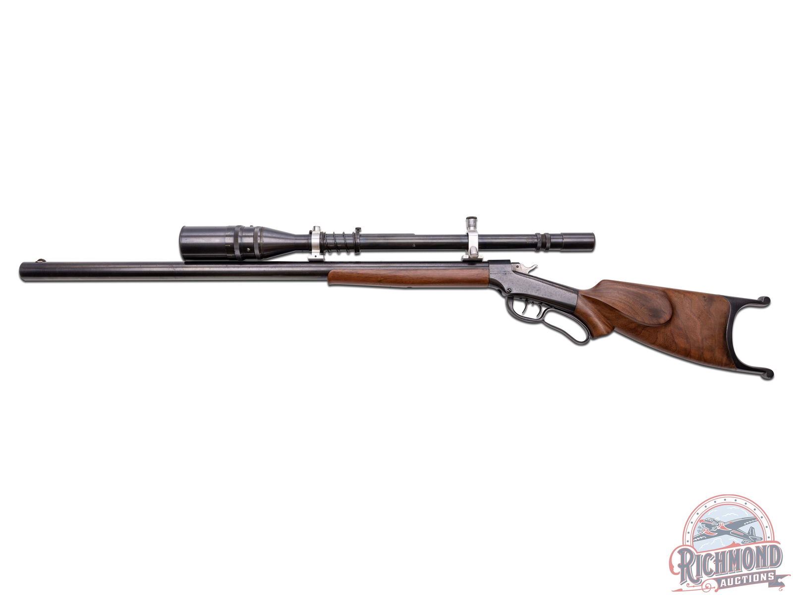 Originally made by Marlin circa 1890 and reworked by Arthur Hubalek circa 1900. Hubalek was known for building extremely accurate 22 Rimfire caliber target rifles. He worked in Brooklyn, New York from the early 1900's to the 1930's. 30-5/8" blued round target weight barrel measuring 1" across muzzle with sheared blade front sight and fitted with Posa mounts and 2" Unertl 24x target scope. Barrel is marked on top "A. Hubalek". Blued Ballard Union Hill action with Schuetzen double set triggers and loop finger lever. Walnut plain Schuetzen style butt stock with Schnabel plain walnut forearm. Scope comes with caps, recoil spring, and micrometer mounts. A top-of-the-line small bore rifle from the day. J.T. Livengood Collection. CALIBER: 22 LR. S/N: 84541. FFL STATUS: Antique.