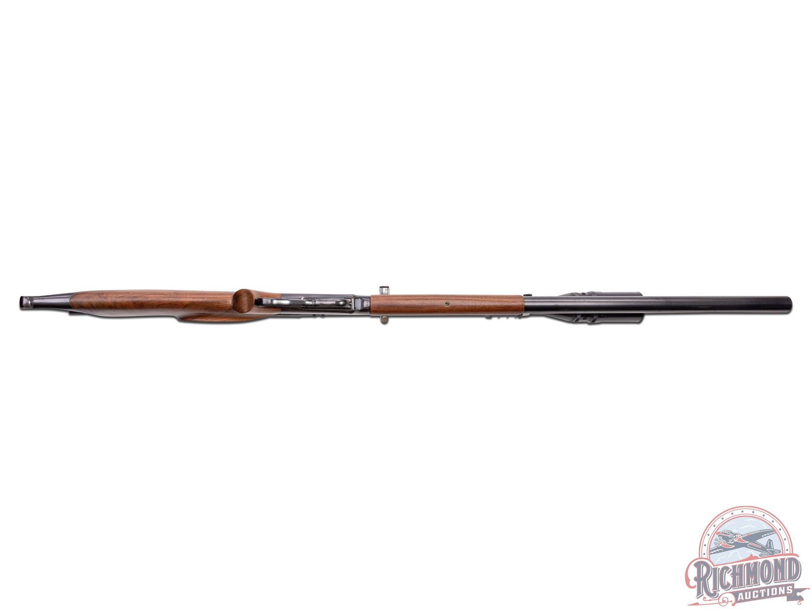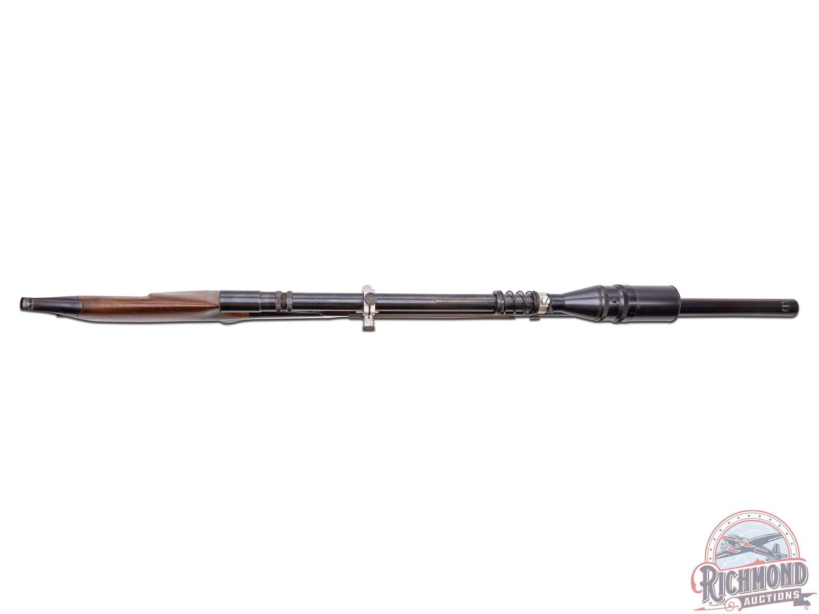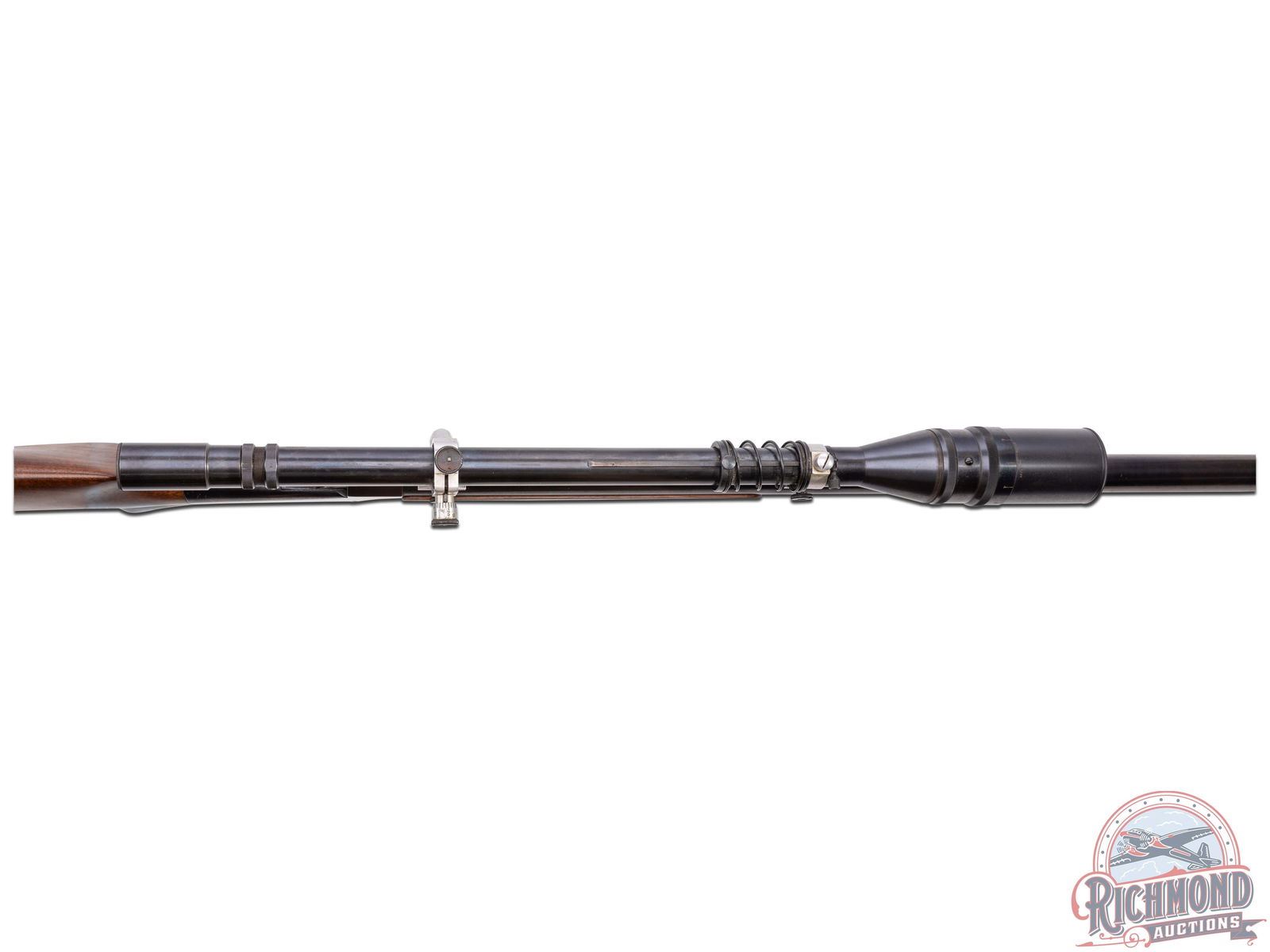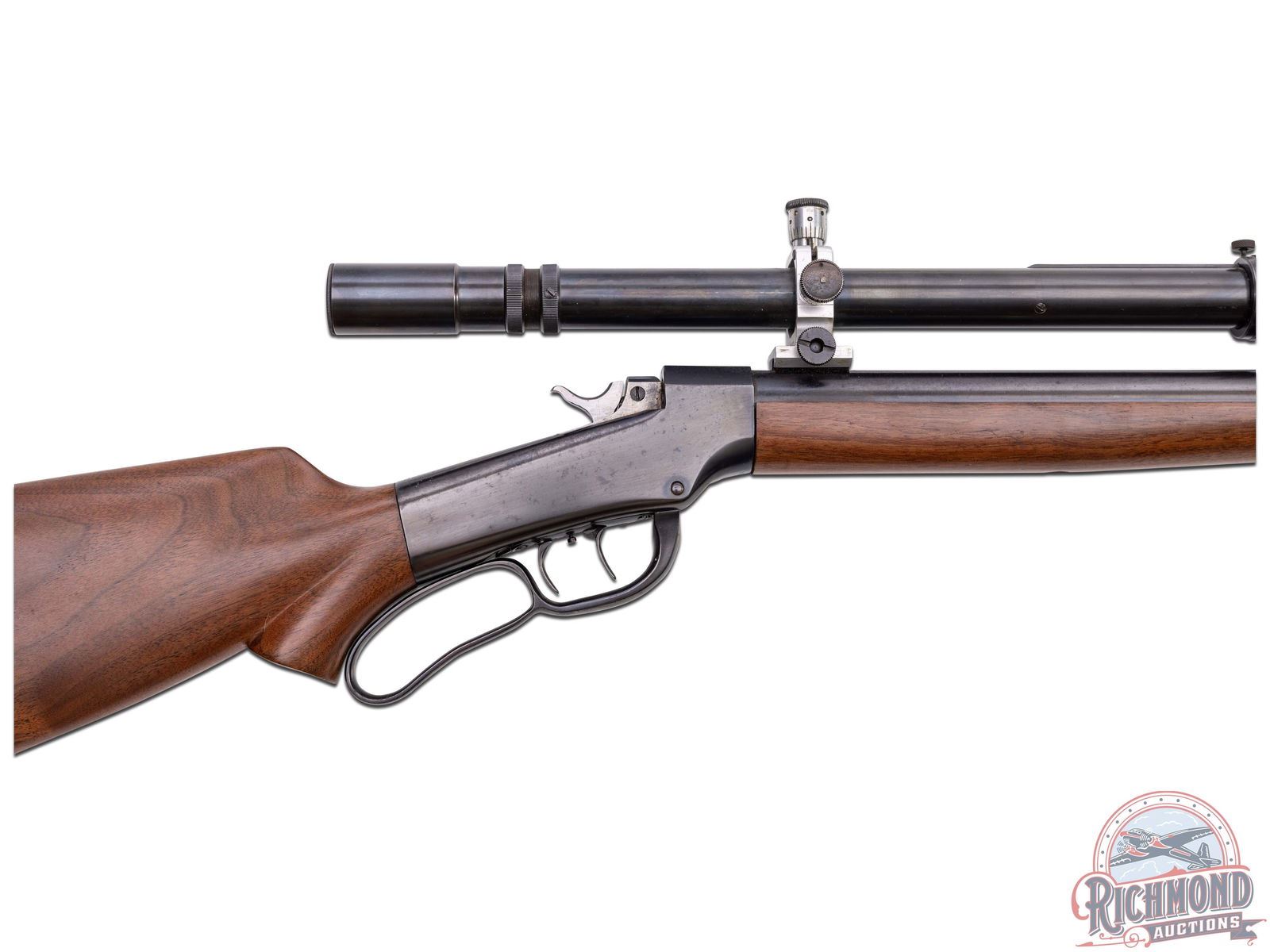 Originally made by Marlin circa 1890 and reworked by Arthur Hubalek circa 1900. Hubalek was known for building extremely accurate 22 Rimfire caliber target rifles. He worked in Brooklyn, New York from the early 1900's to the 1930's. 30-5/8" blued round target weight barrel measuring 1" across muzzle with sheared blade front sight and fitted with Posa mounts and 2" Unertl 24x target scope. Barrel is marked on top "A. Hubalek". Blued Ballard Union Hill action with Schuetzen double set triggers and loop finger lever. Walnut plain Schuetzen style butt stock with Schnabel plain walnut forearm. Scope comes with caps, recoil spring, and micrometer mounts. A top-of-the-line small bore rifle from the day. J.T. Livengood Collection. CALIBER: 22 LR. S/N: 84541. FFL STATUS: Antique.