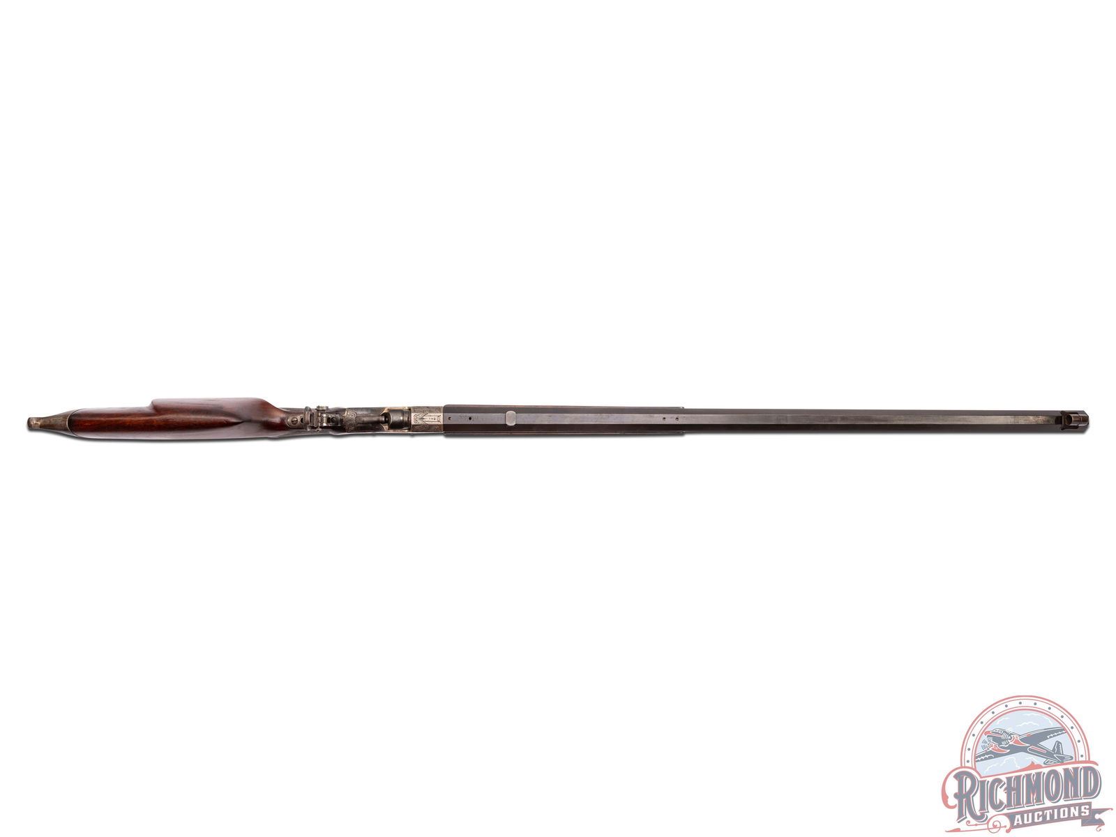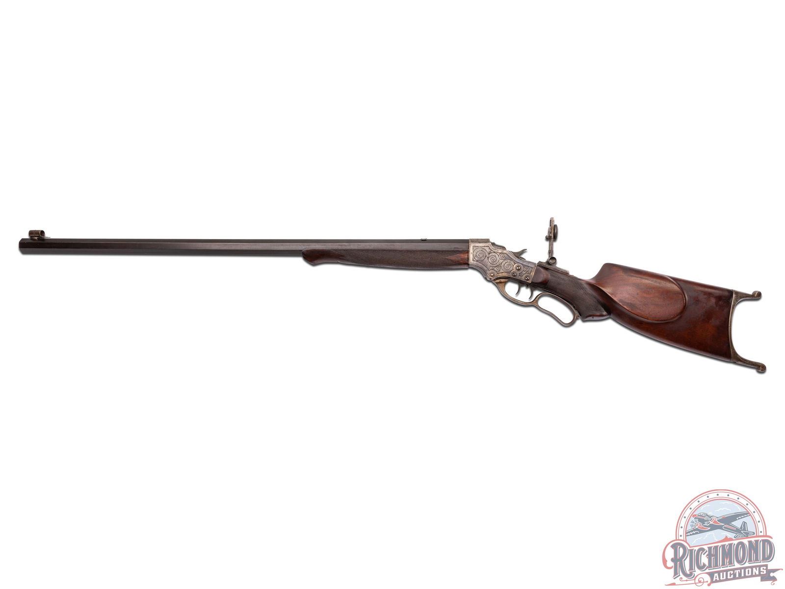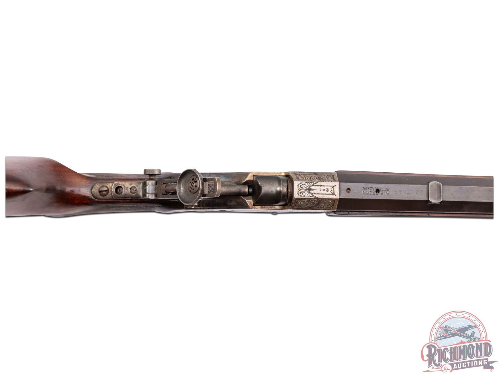 Interesting gun with gun starting out as a Stevens Ideal Walnut Hill No. 49. Rifle is fitted with a 30" blued octagon barrel in 22 long rifle caliber marked at breech "W.S. Brown/Pittsburgh, Pa." and the underside of barrel is stamped "Wm. G. Matthews". A William Matthews is listed in the Seller's book as a Gunsmith working in San Leandro, California. Did he fit the barrel or is this an unknown shooter/owner name? Barrel is fitted with Wind gage front sight with plugged rear sight provision and is drilled for scope mounting with Soule Vernier tang sight. Case-hardened 44-1/2 deep chisel floral engraved action with Schuetzen double set triggers and four finger loop. Walnut checkered splinter Schnabel forearm drilled for palm rest. J.T. Livengood Collection. CALIBER: 22 LR. S/N: 709. FFL STATUS: Curio & Relic.