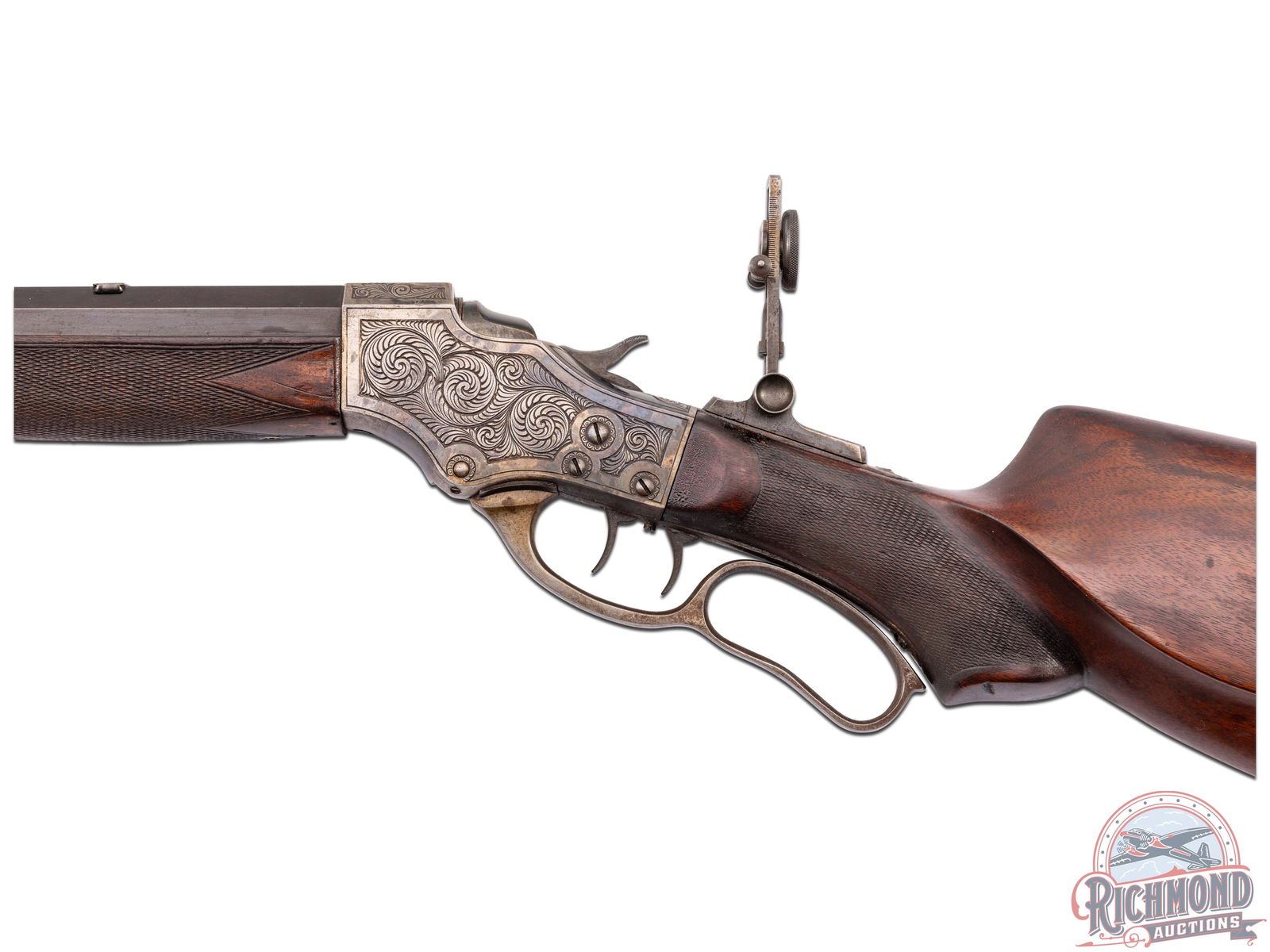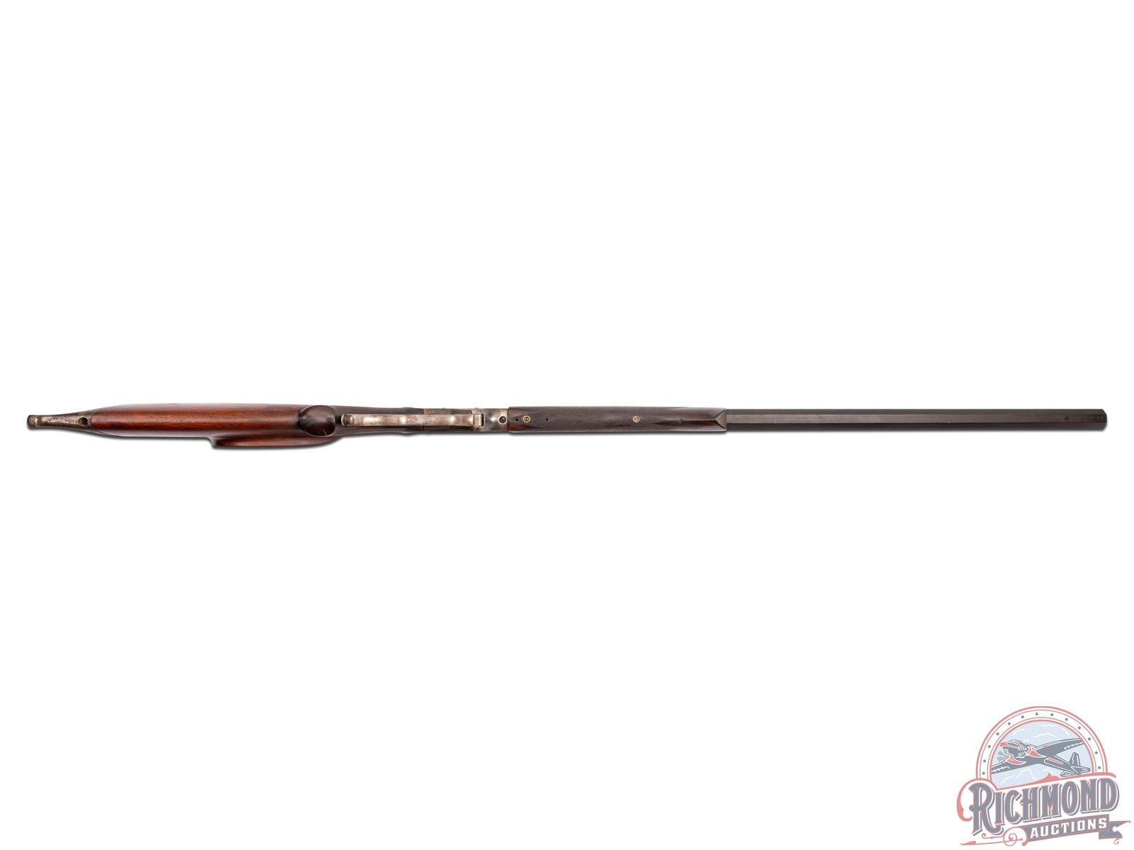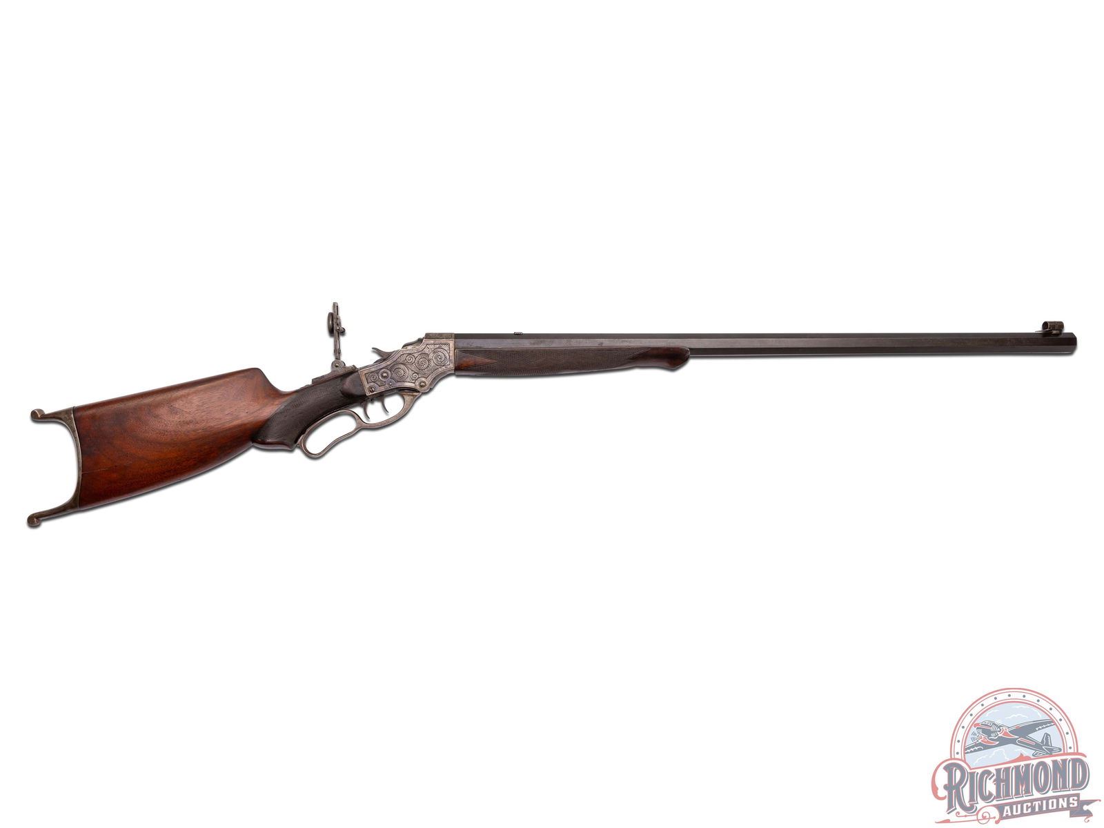 Interesting gun with gun starting out as a Stevens Ideal Walnut Hill No. 49. Rifle is fitted with a 30" blued octagon barrel in 22 long rifle caliber marked at breech "W.S. Brown/Pittsburgh, Pa." and the underside of barrel is stamped "Wm. G. Matthews". A William Matthews is listed in the Seller's book as a Gunsmith working in San Leandro, California. Did he fit the barrel or is this an unknown shooter/owner name? Barrel is fitted with Wind gage front sight with plugged rear sight provision and is drilled for scope mounting with Soule Vernier tang sight. Case-hardened 44-1/2 deep chisel floral engraved action with Schuetzen double set triggers and four finger loop. Walnut checkered splinter Schnabel forearm drilled for palm rest. J.T. Livengood Collection. CALIBER: 22 LR. S/N: 709. FFL STATUS: Curio & Relic.