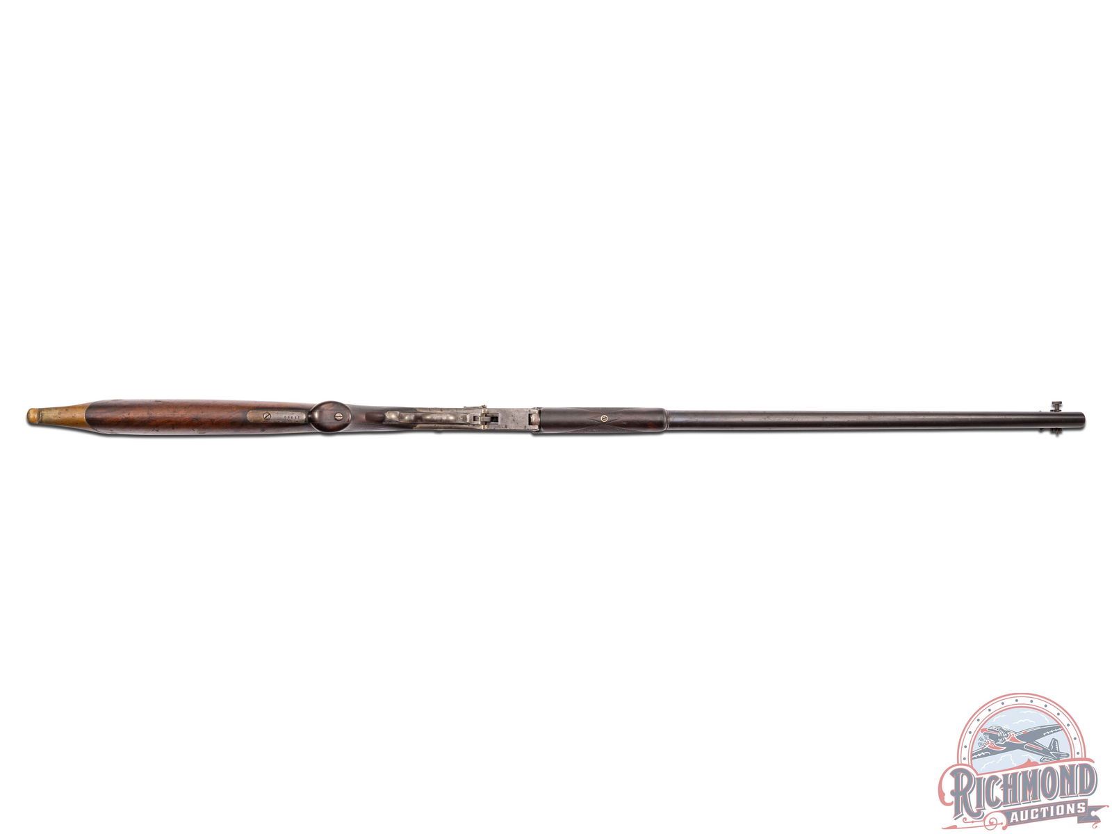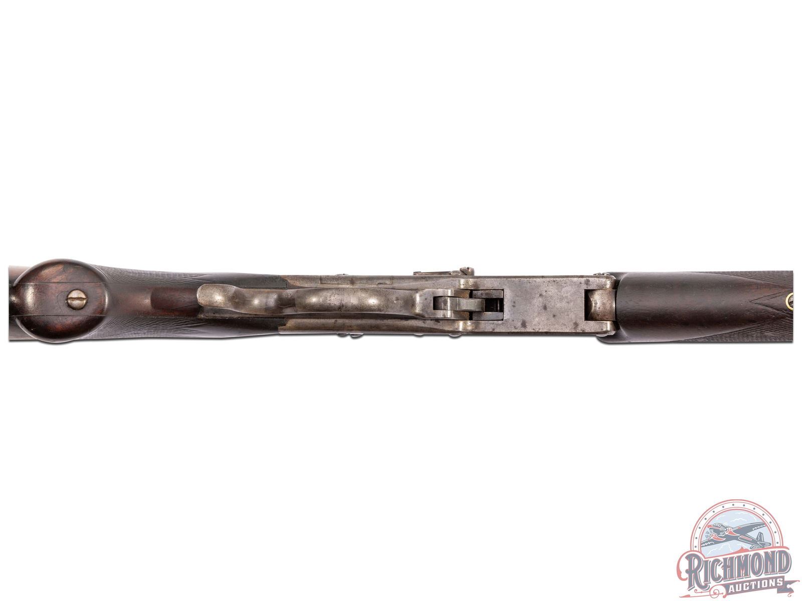 Made by Massachusetts Arms Company under Edward Maynard Patents circa 1882. 28" blued half octagon rifled barrel in 38-50 caliber with Wind gauge front sight and plugged rear sight Vernier tang peep sight. Second barrel is a 28" blued round 20 gauge shotgun barrel with lever case-hardened action marked "1882" with a Maynard Patents marking. Has a central hammer and plain single trigger. Figured walnut checkered pistol grip stock with brass Swiss butt plate and matching checkered splinter forearm. J.T. Livengood Collection. CALIBER: 38-50/20G. S/N: 13860. FFL STATUS: Antique.
