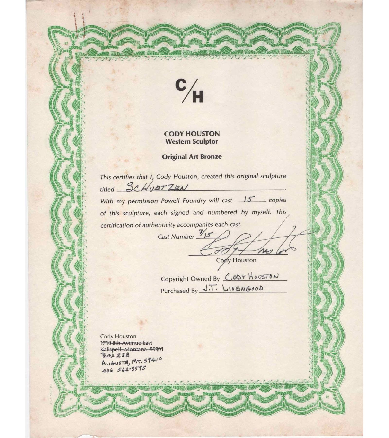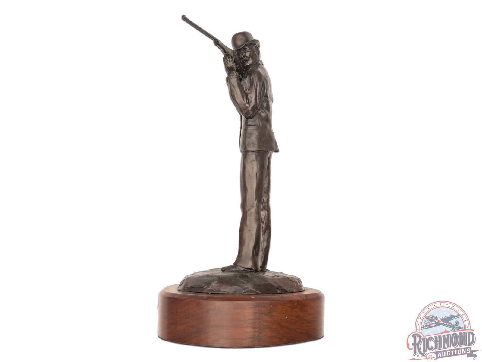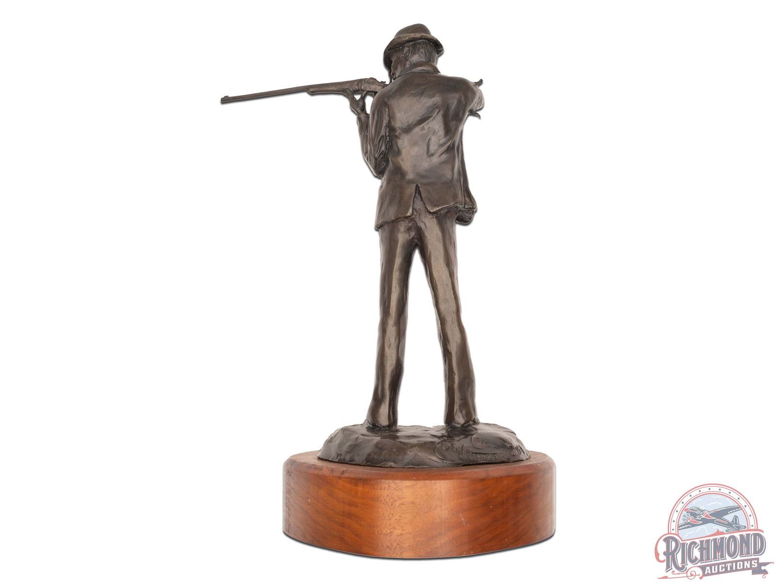 A beautiful depiction of a gentleman focusing on a shot using a Schuetzen rifle. Tilted "Schuetzen", this particular piece is rarely seen on the market. This bronze sculpture by Montana artist Cody Houston, is signed and numbered 7 of 15. Dated 1978. Mounted on a walnut wood base with brass name plate. Measures 12" tall and 8-1/2" at the widest point. Includes hand-written letter from the artist, Cody Houston to the owner, original receipt, and Certification of Authenticity dated 1978. J.T. Livengood Collection.