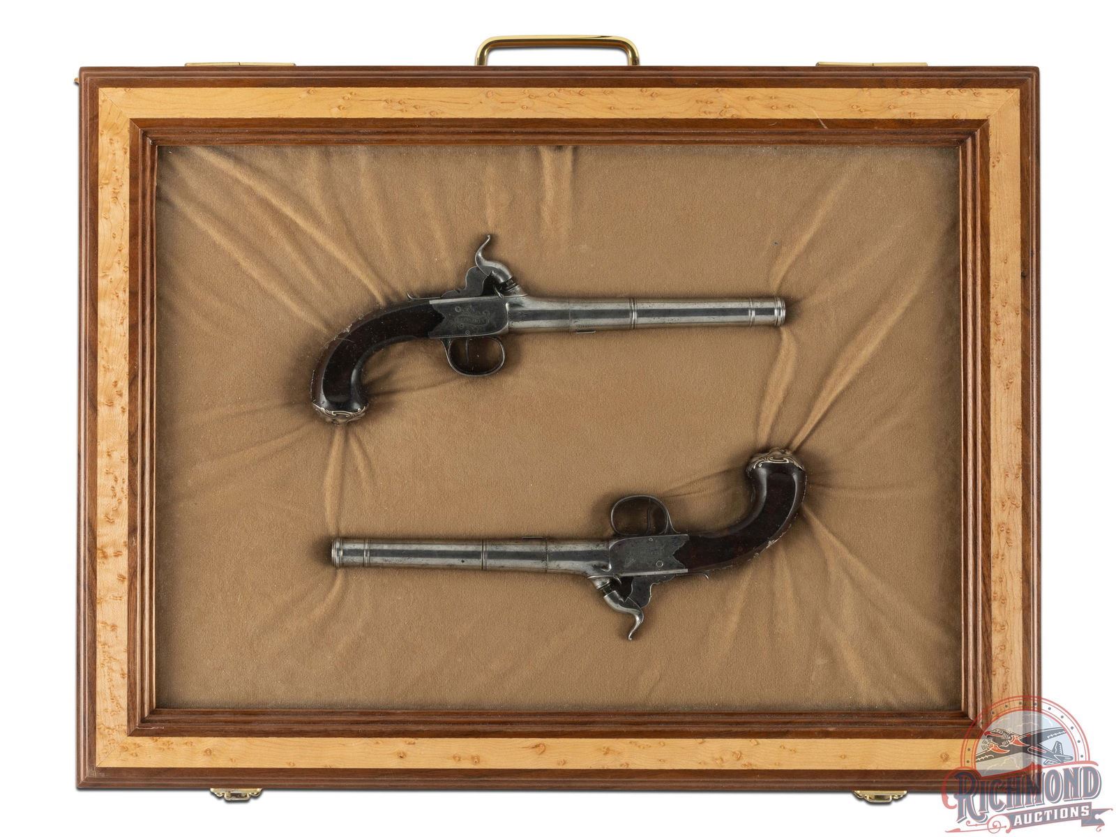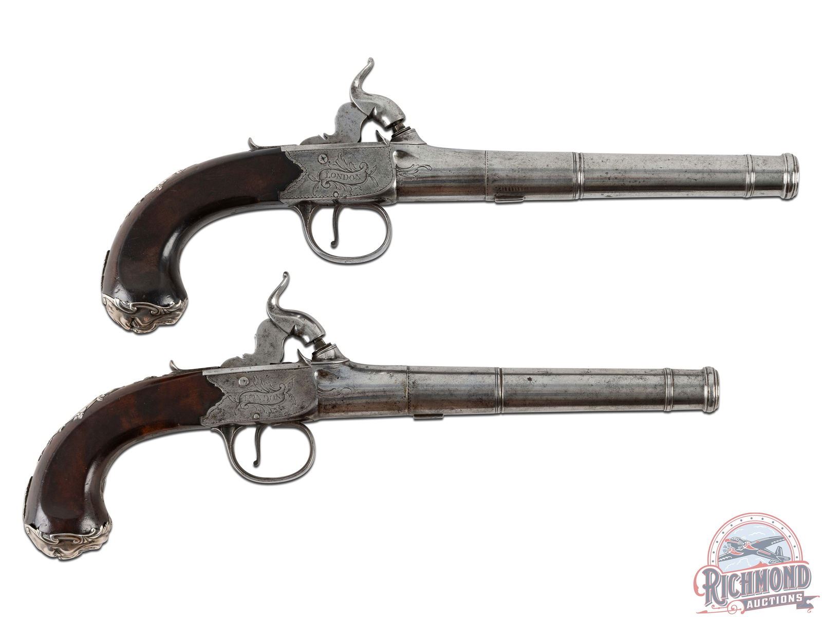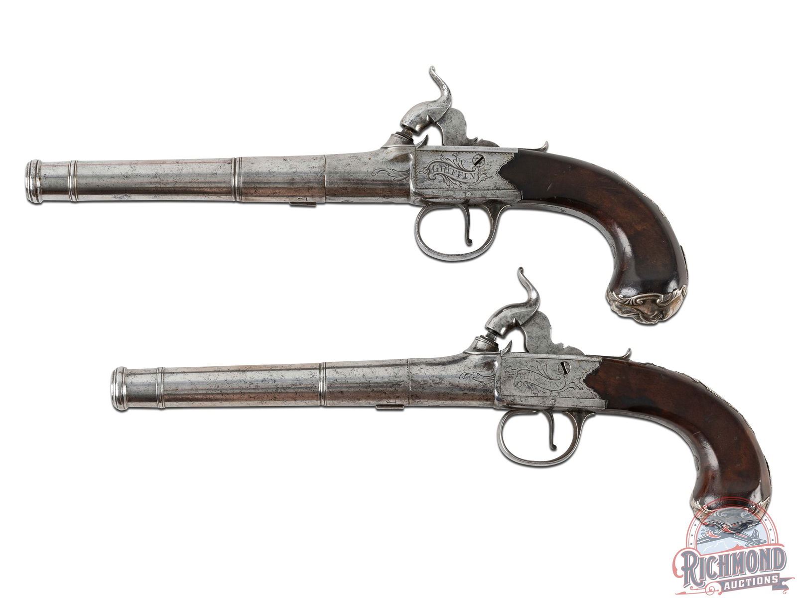 Lot 150 Antique Pair of Joseph Griffin Converted Queen Anne Silver Mounted Pistols with Display Case