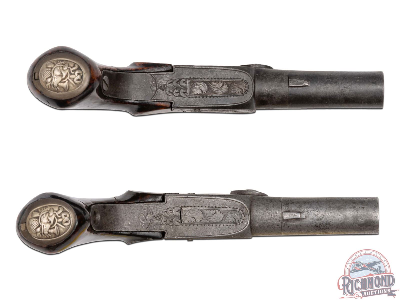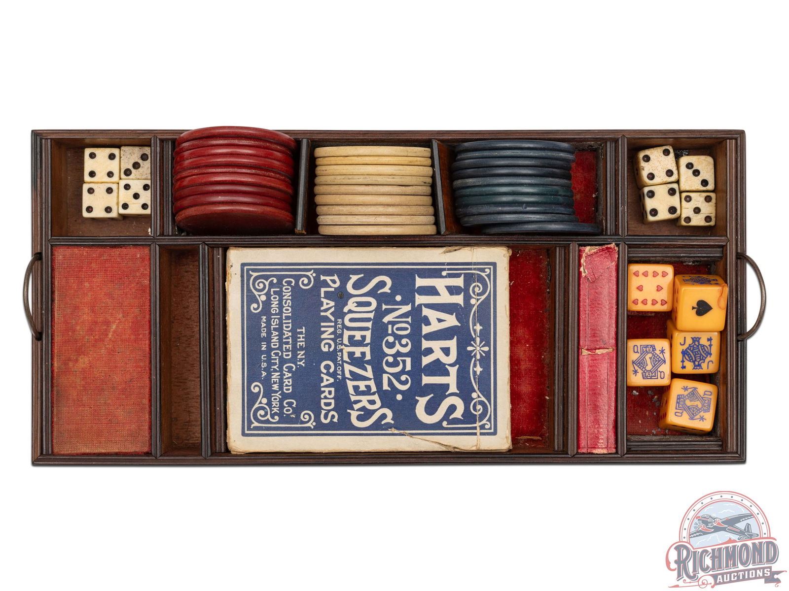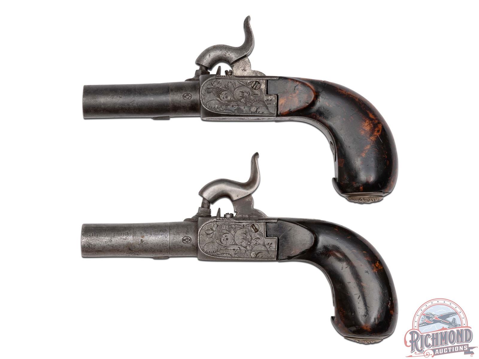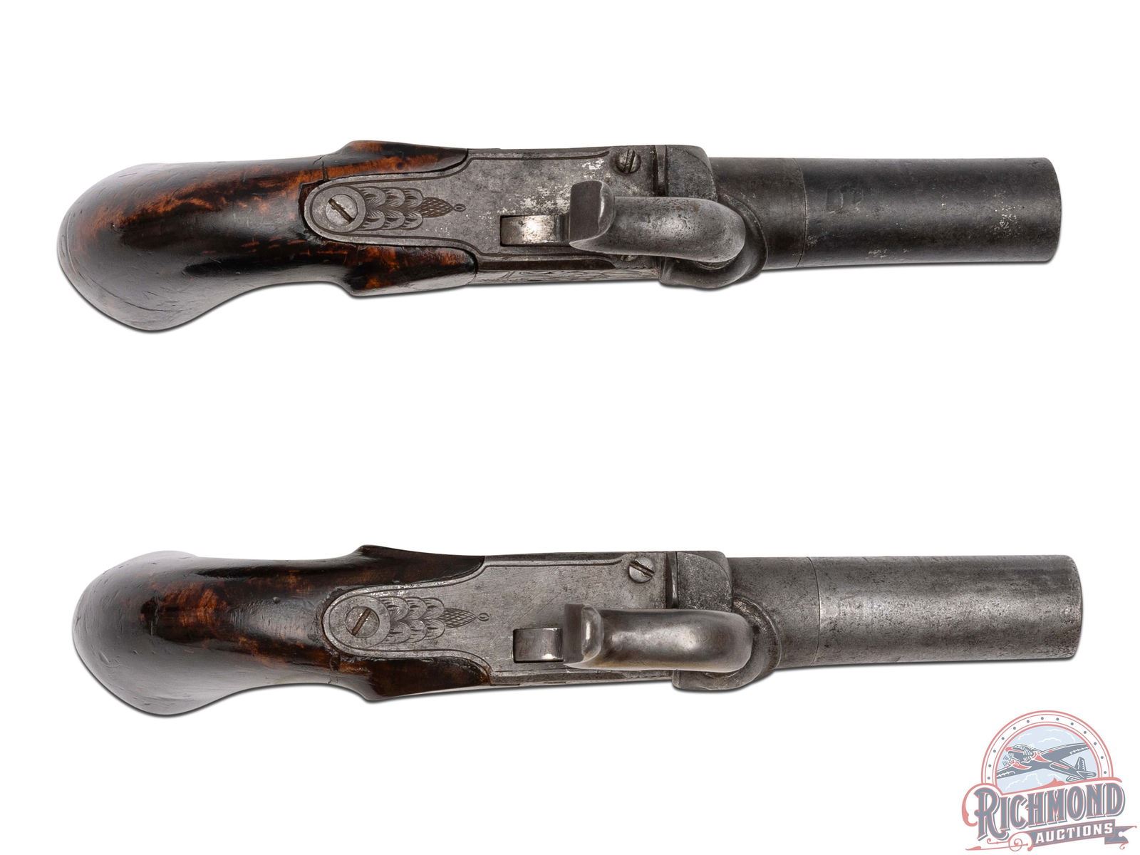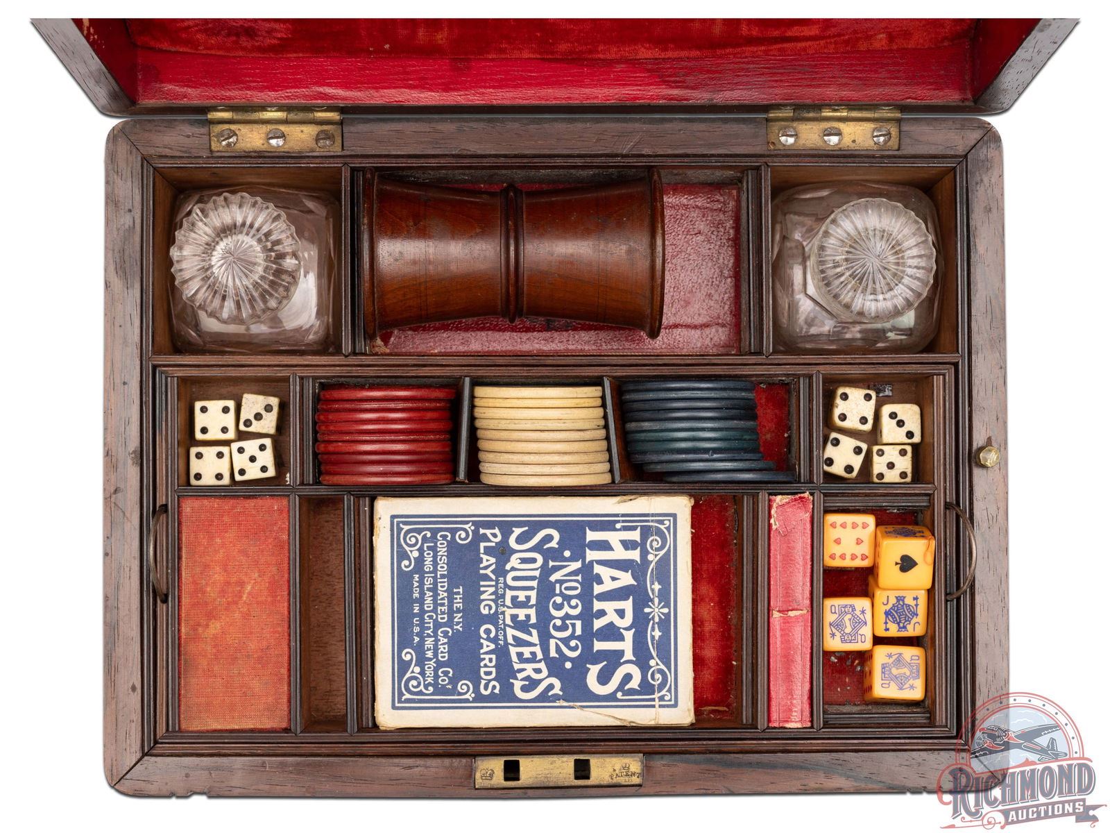 Professional Gambler's Kit from the 1870's assembled by unknown maker. When looking at this set it puts one in the mind of something Doc Holiday would have used as he traveled from town to town in the Old West practicing his trade. Kit is contained in a walnut felt lined box measuring 10" x 7-1/2" x 6" with silver key hole escutcheon and silver lid banner plate for owner's name. Upon opening case you see all the wares of the trade including, 3 styles of dice, a lathe turned wooden dice cup, 2 glass liquor decanters, red, blue and white ivory Poker chips and a pack of Hart's "Squeezer" No. 352, 1870's vintage playing cards. When you remove the gaming items tray you expose two Belgian "Screw" barrel percussion pistols with 50 caliber smoothbore chambers with percussion floral engraved case-hardened actions and matching mahogany grips and hidden triggers. With the guns is an empty vintage F. Joyce & Co. percussion cap tin. When the case is open there is a brass knob when pulled a spring loaded draw comes out containing a bone handled straight razor, and monogrammed cigar case, wire rimmed glasses in leather case and two "WIZARD" sleeve card holders for use by the nefarious card player. CALIBER: 50. FFL STATUS: Antique.