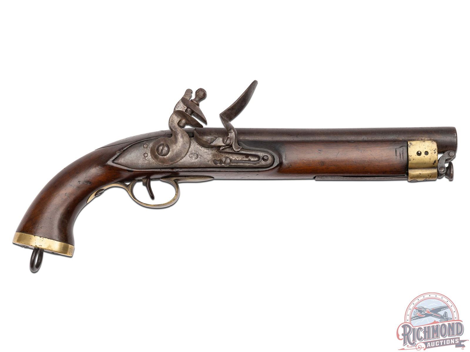 Made in Liege, Belgium during the Napoleonic Period circa 1815 by an undetermined gunsmith. This pistol was built for use by heavy cavalry units during this time period and up until the 1830's. Pistol has 9" round 69 caliber smoothbore barrel with no sights and attached captured steel ramrod. Large rounded flintlock with deep stamped oval illegible maker's mark with single trigger control. Walnut stock with brass hardware and lanyard ring in butt. A great piece of history. CALIBER: 69. FFL STATUS: Antique.