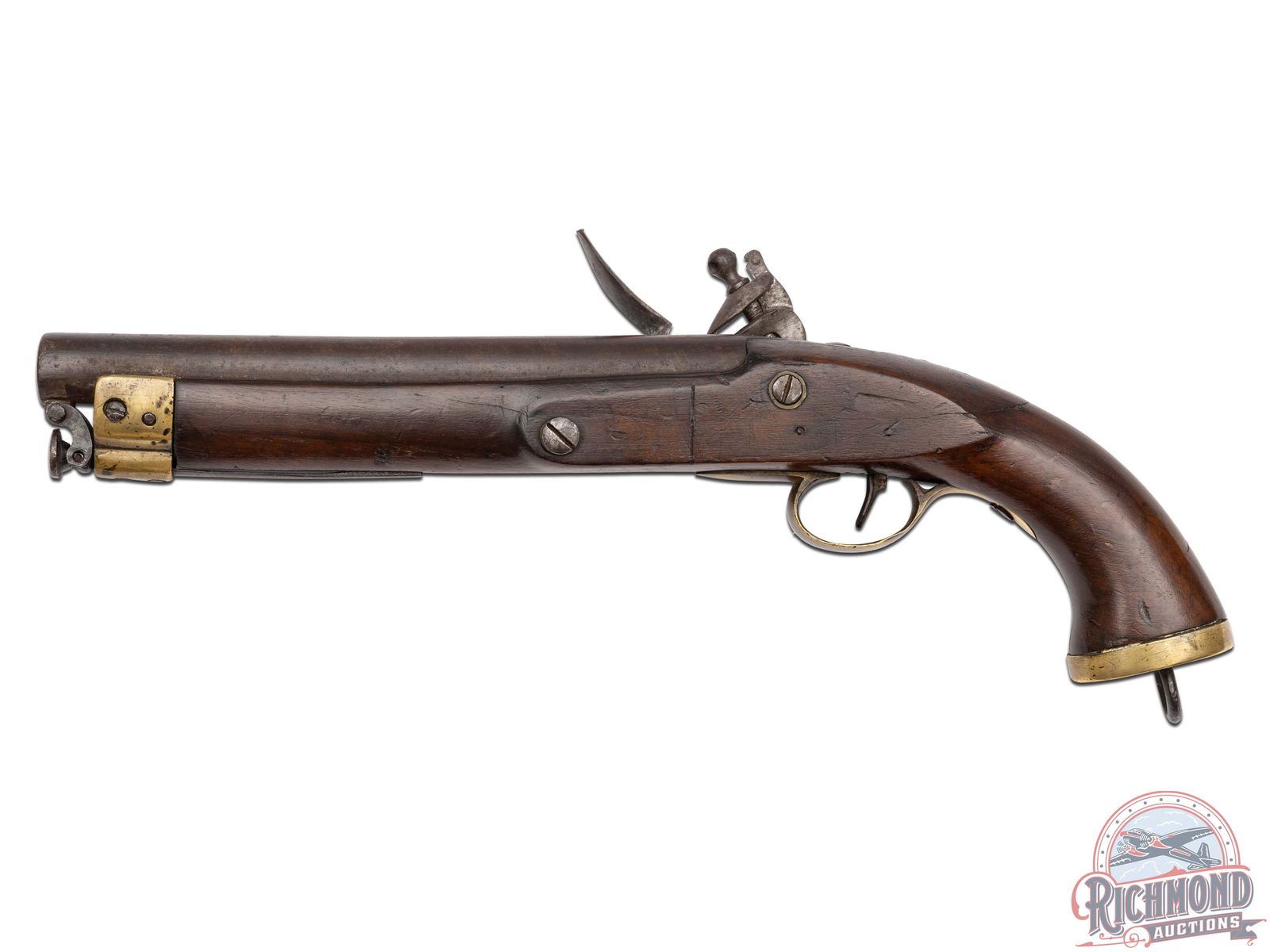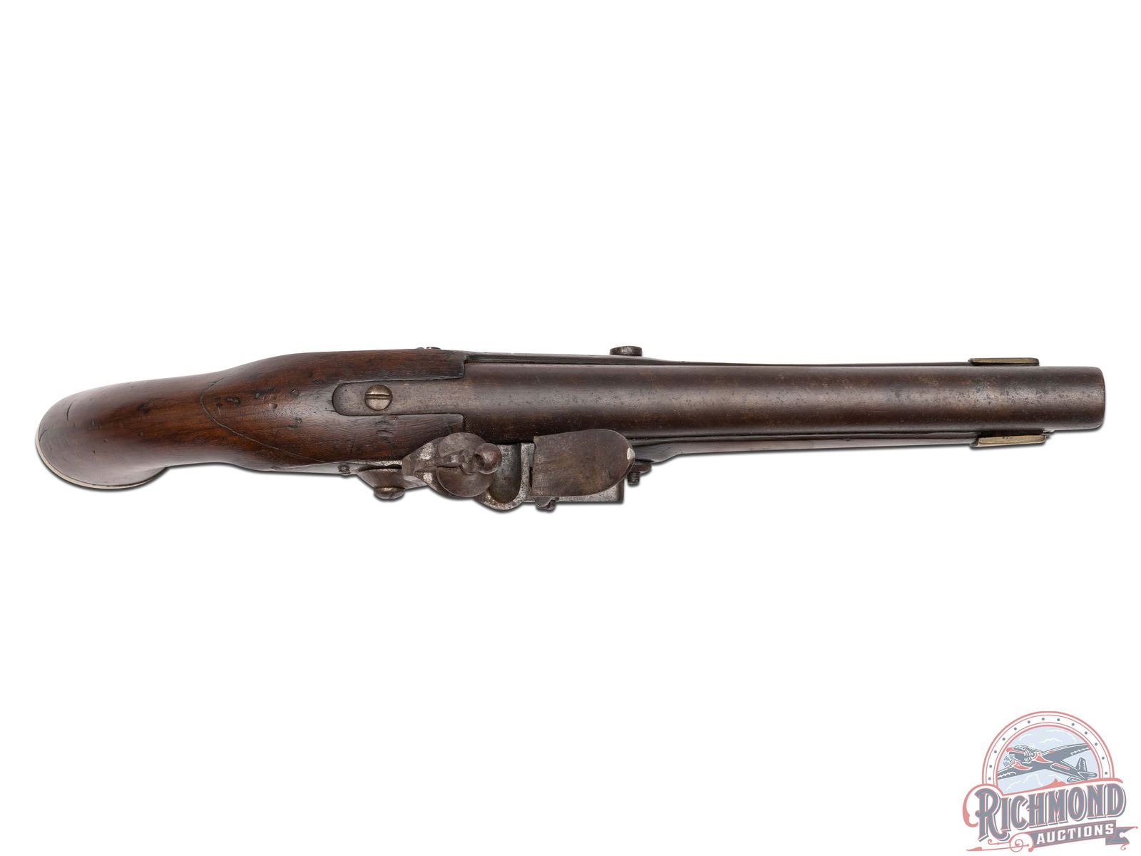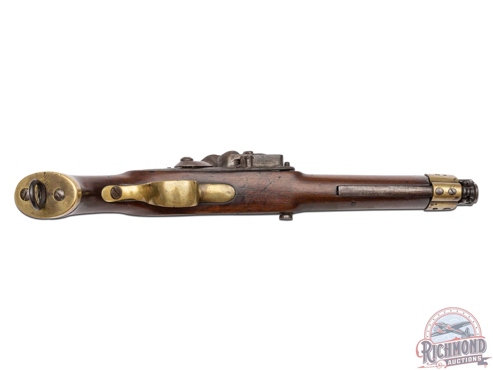 Overall good with metal fading to a brown patina with light oxidation. Brass appears to unclean and exhibits a natural golden patina from handling. Stock has traces of original finish with a period repaired crack in wrist. Dark pitted bore with crisp functioning mechanics.