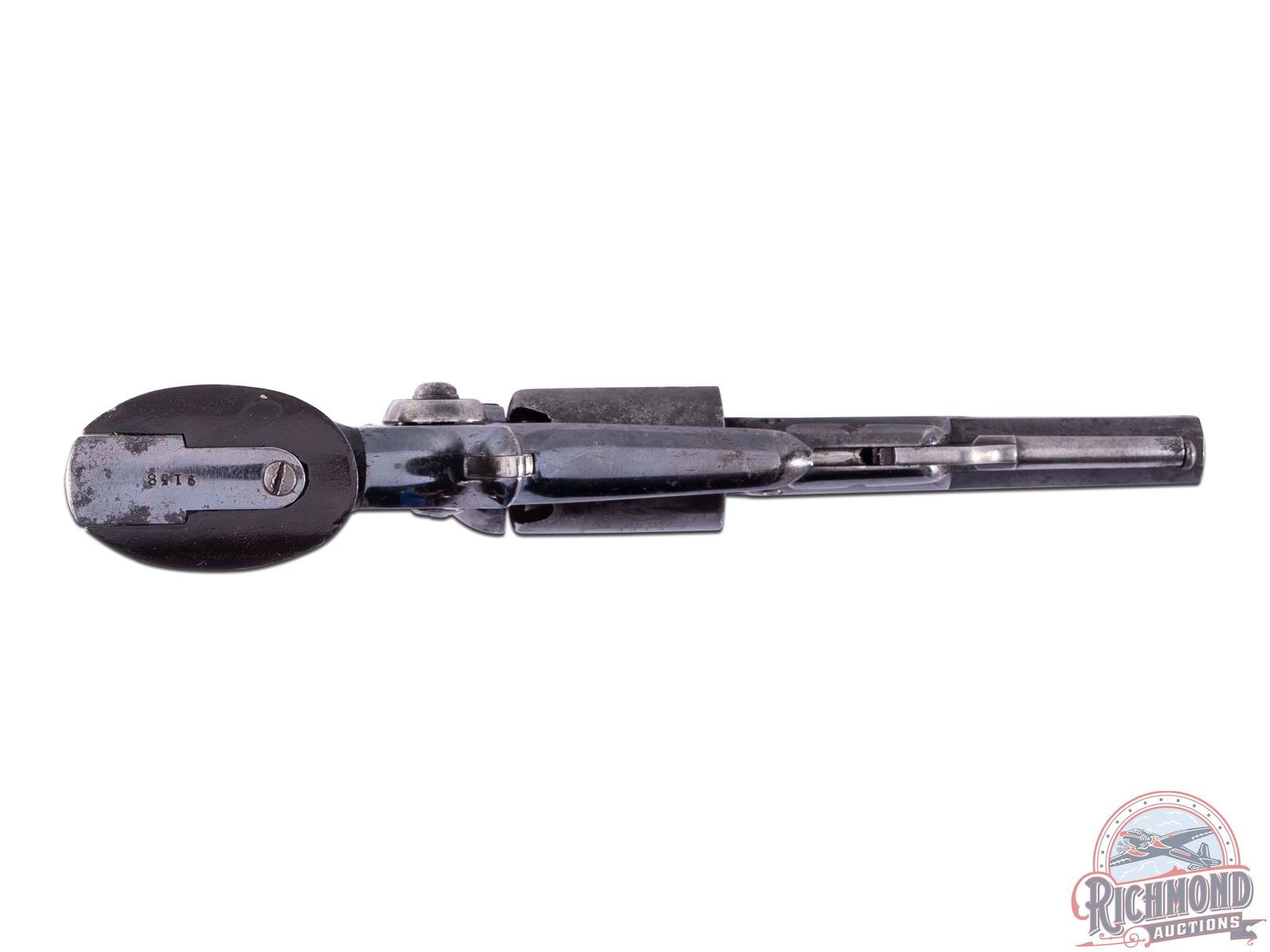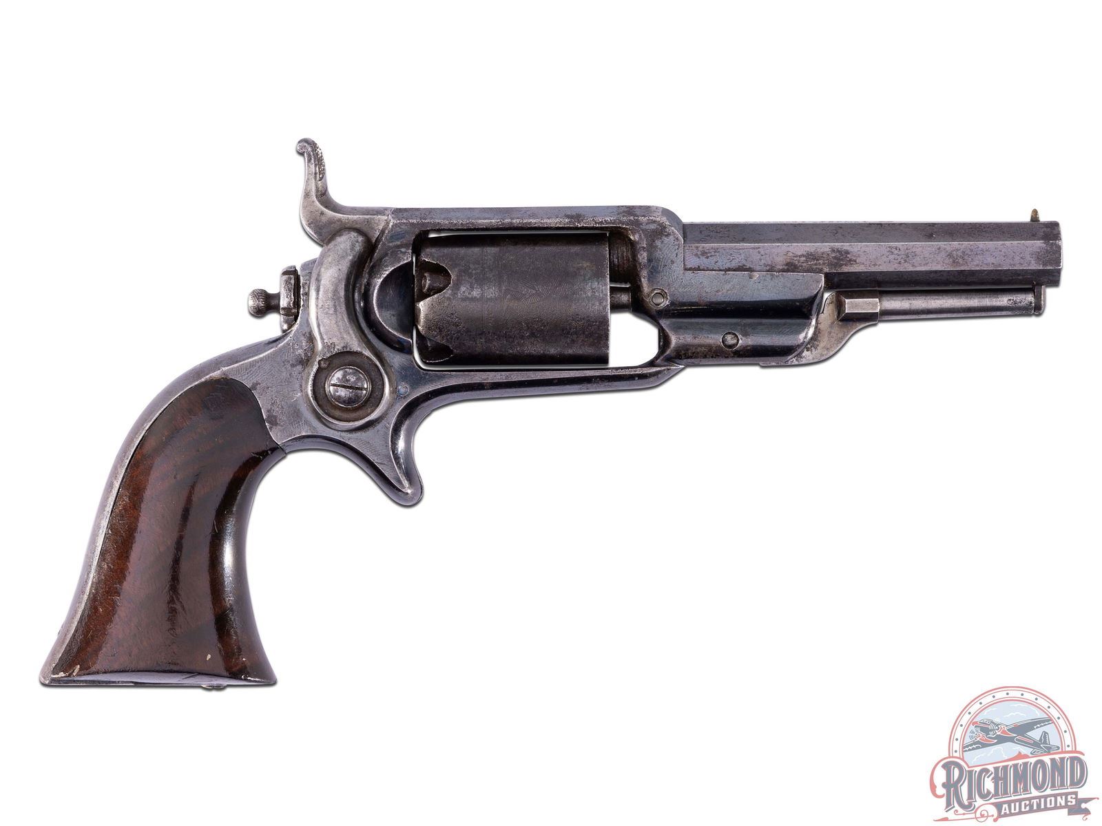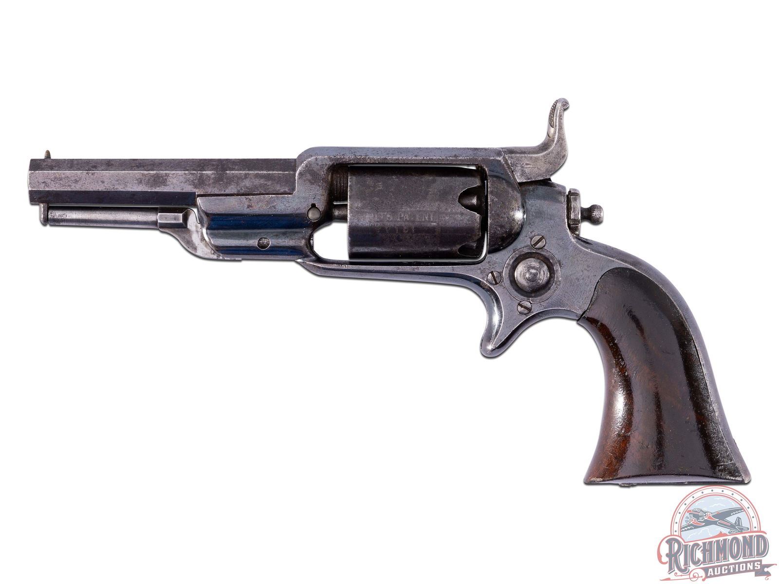 Manufactured in 1856. Colt 1855 Side hammer, more commonly known as the "Root Revolver". This Model 2 variant features a 3-1/2" octagon barrel with integrated grooved rear sight and brass post front sight. Top of the barrel is stamped with the "pointing hand", "COLT'S PT. ADDRESS COL. COLT / 1855 + HARTFORD, CT. U.S.A. +". Blued finished with one piece walnut wood grips. Five shot cylinder chambered for 28 caliber features a roll stamped Indian and Cabin scene and Colt's Patent. Blue finish with spur trigger and 90 degree hammer. Matching serial number on bottom of barrel, cylinder and base of grip. CALIBER: 28 Cal. S/N: 9158. FFL STATUS: Antique.