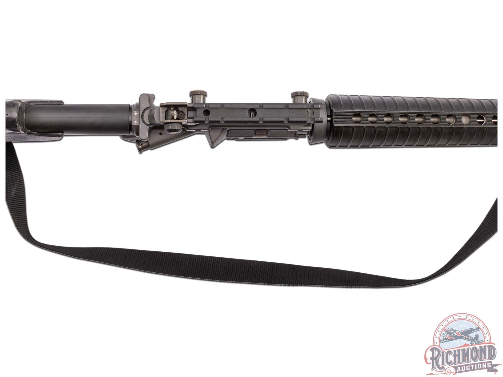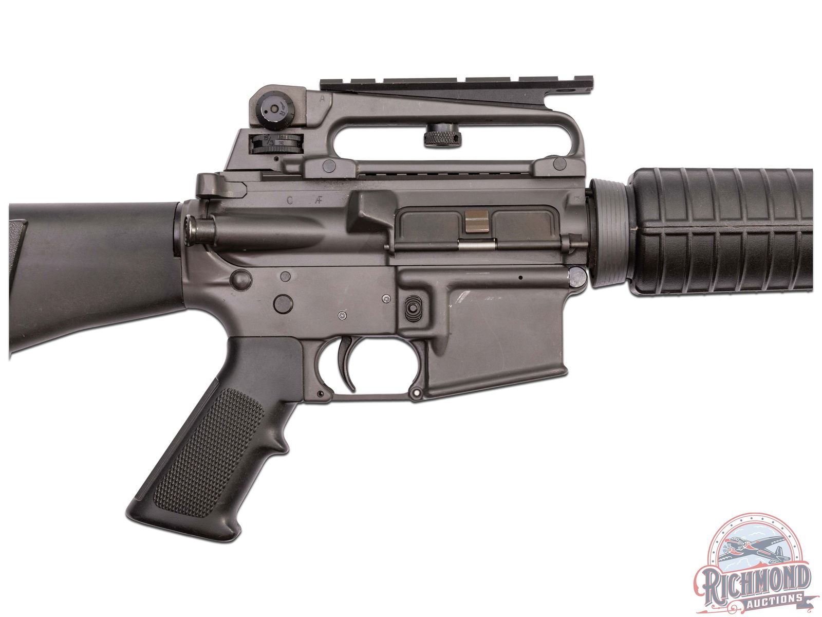 Manufactured in 1988, pre-ban HBAR model. HBAR, stands for heavy barrel automatic rifle. Features a 20" C MP barrel with 1/9 twist rate, front post sight and muzzle brake. M16A1 style 12" handguard rail. Receiver is a matte gray with all standard Colt markings and manual safety switch. Fitted with an AR carry handle with adjustable two-aperture flip peep sight and scope rail. Black checkered synthetic pistol grip and factory M16 style stock with trap door butt plate and rubber cheek riser. Includes an adjustable nylon sling. (NOT legal in All States) LOP: 13-3/4". CALIBER: 223 REM / 556 NATO. S/N: CH014158. FFL STATUS: Modern.