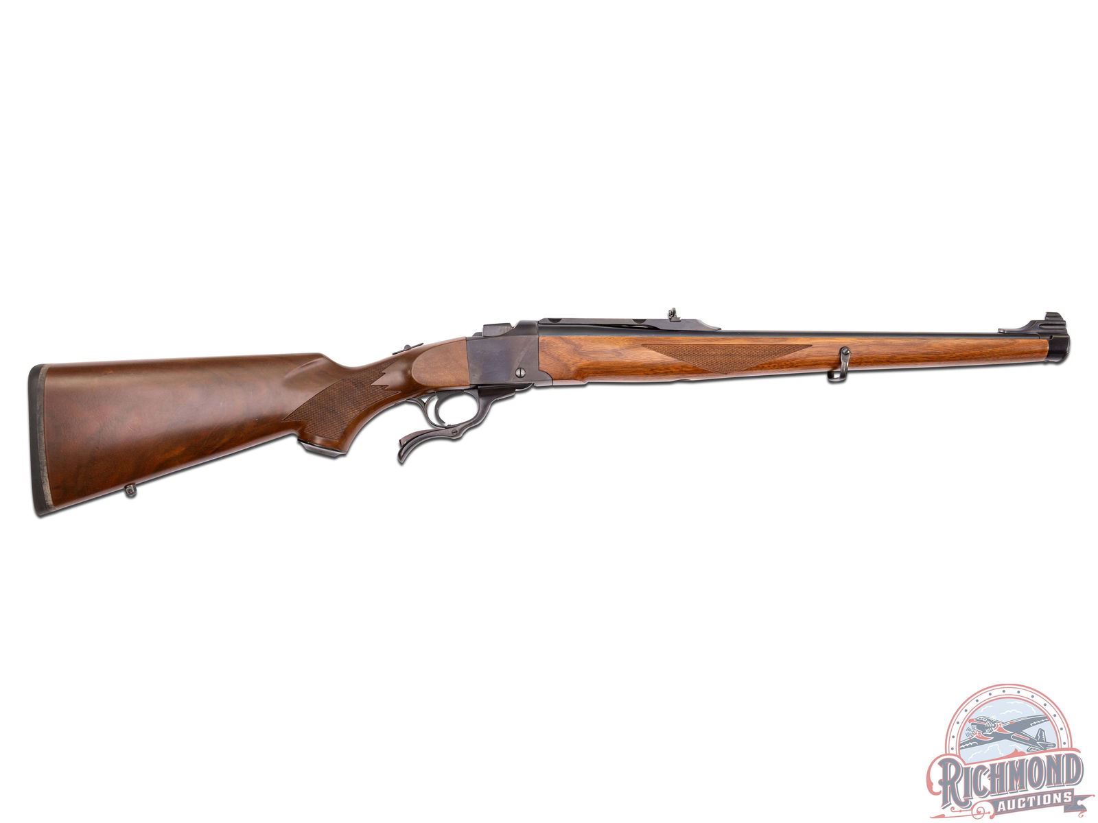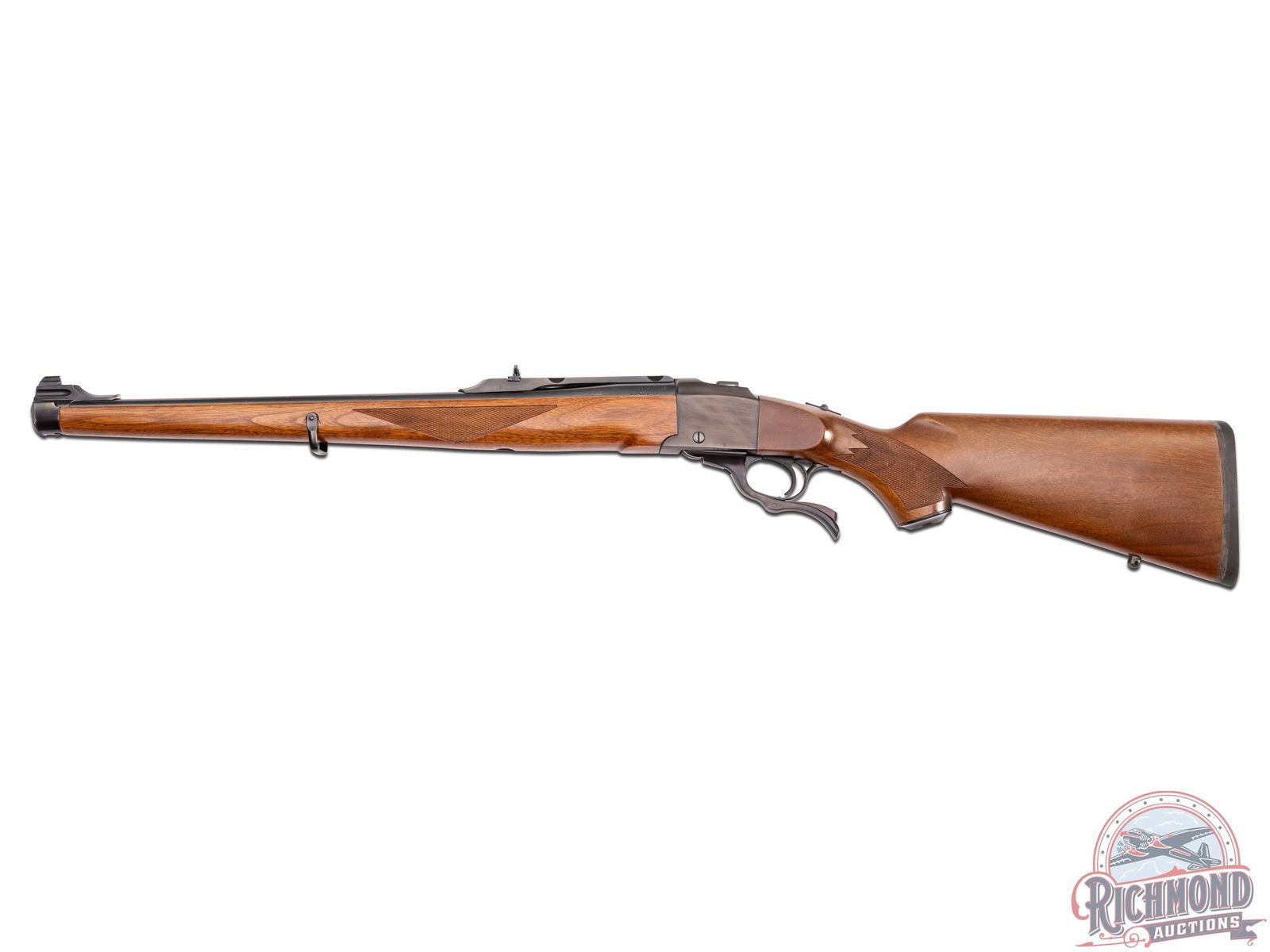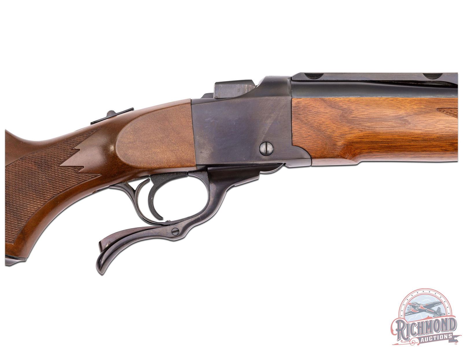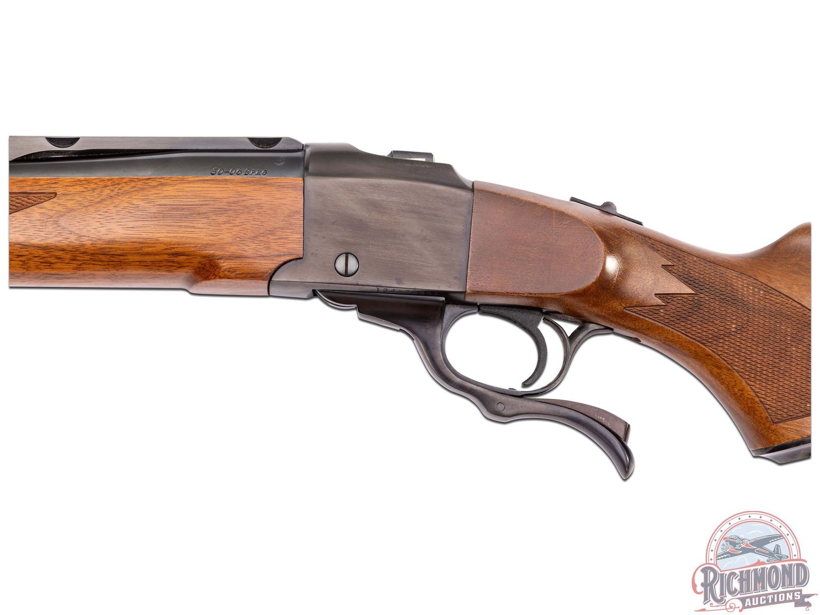 Manufactured in 2009 in the International 1-RSI configuration. Features a carbine 20" blued barrel with front blade and brass bead sight and flip-up rear notch sight with white diamond inset on factory quarter rib. Two line Ruger address stamped on the barrel. Blued receiver with a falling block breech action with artillery-style breechblock and under-lever. Tang mounted safety lever. Nice Mannlicher style walnut stock and full barrel length forearm, both with checkering. Fitted with a sling bolts and front ring, factory black lined red rubber recoil pad and factory metal pistol grip cap with gold tone Ruger medallion. LOP: 13-1/2". CALIBER: 30-06 SPRG. S/N: 134-25851. FFL STATUS: Modern.