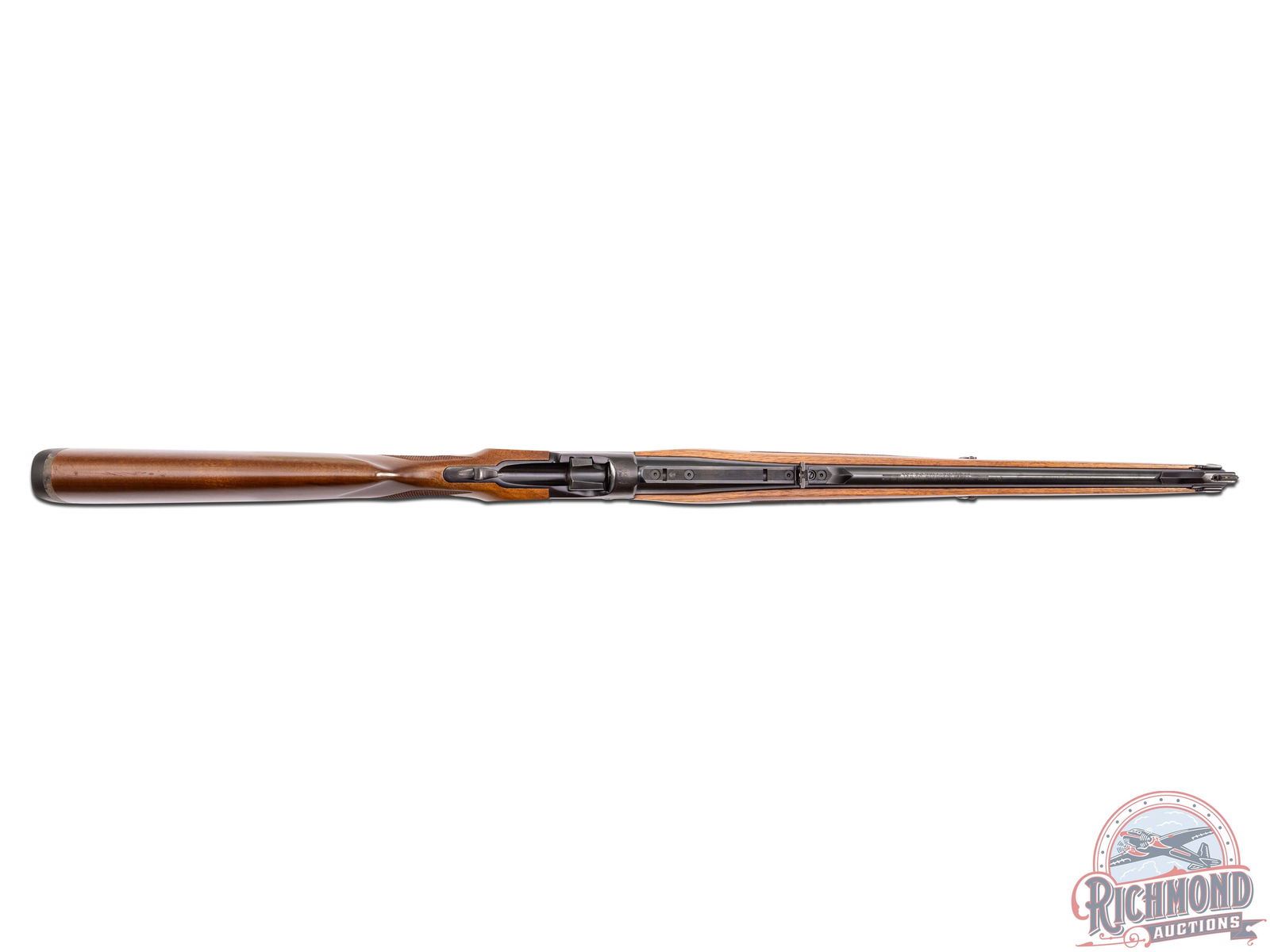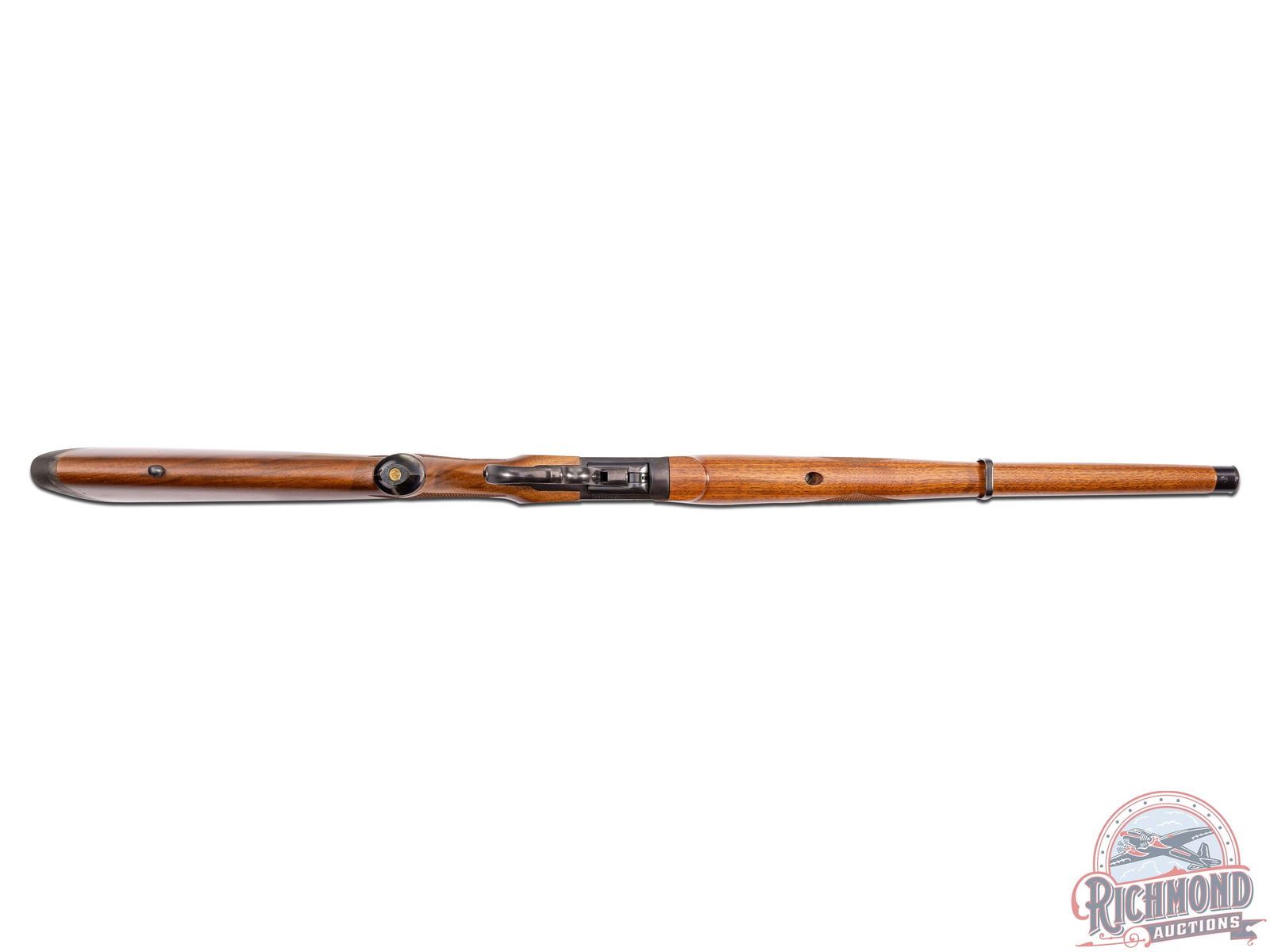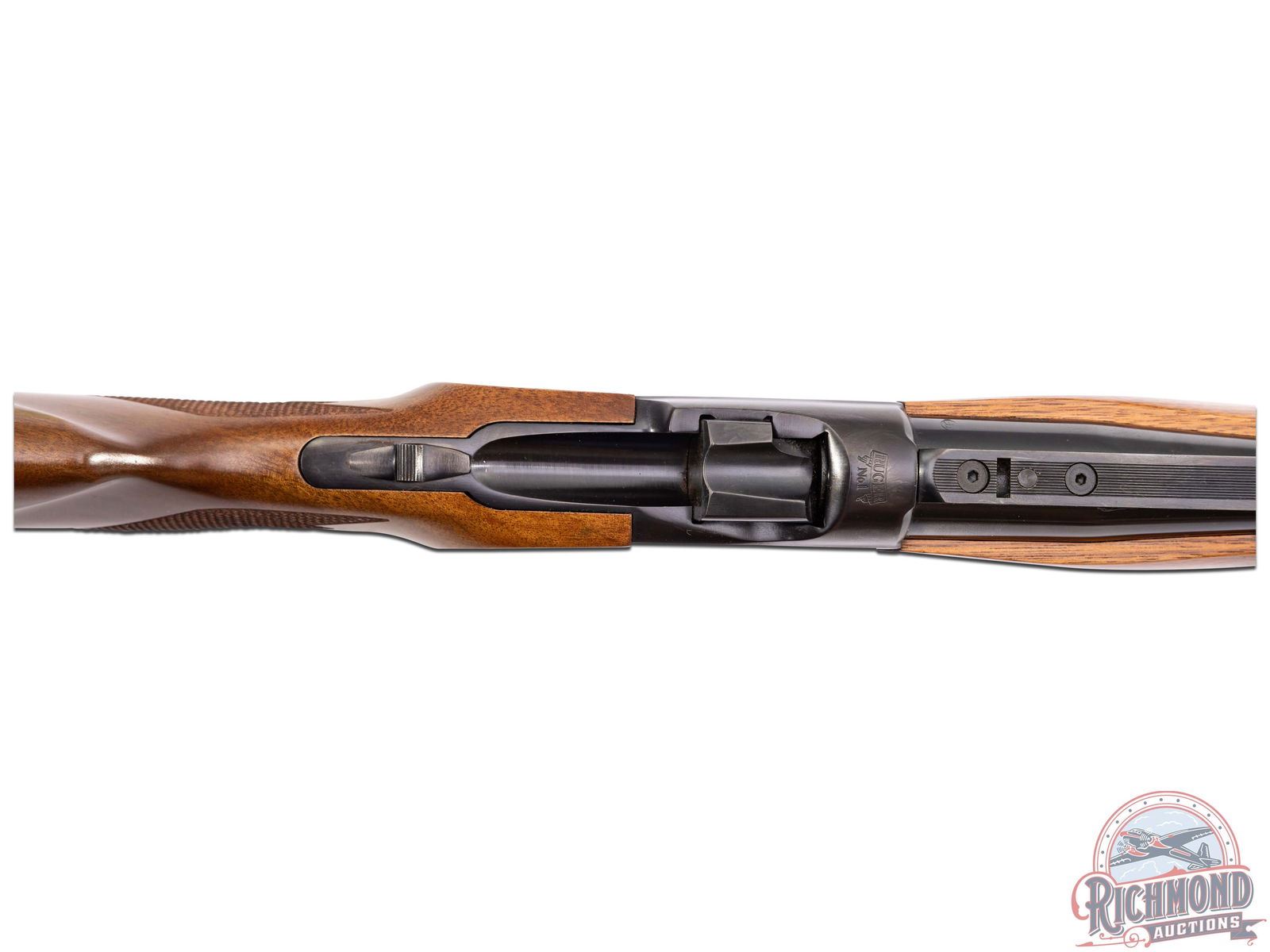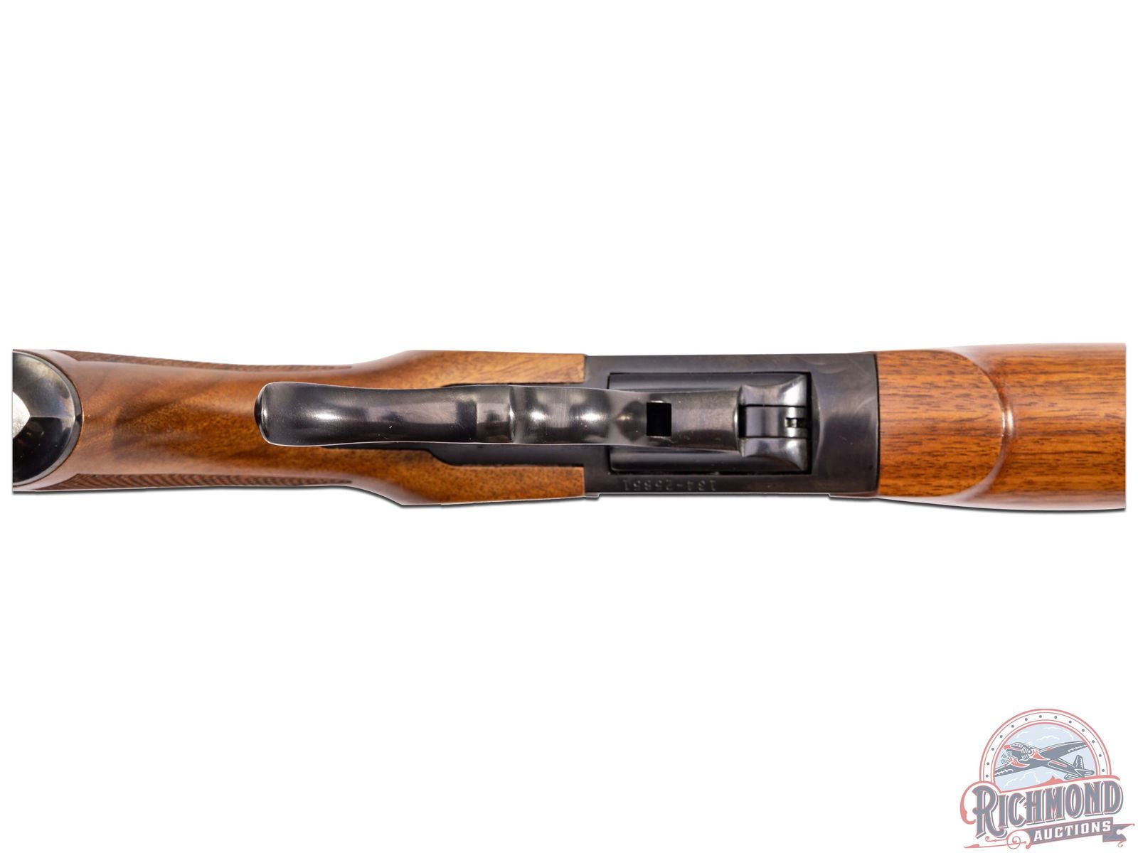 Manufactured in 2009 in the International 1-RSI configuration. Features a carbine 20" blued barrel with front blade and brass bead sight and flip-up rear notch sight with white diamond inset on factory quarter rib. Two line Ruger address stamped on the barrel. Blued receiver with a falling block breech action with artillery-style breechblock and under-lever. Tang mounted safety lever. Nice Mannlicher style walnut stock and full barrel length forearm, both with checkering. Fitted with a sling bolts and front ring, factory black lined red rubber recoil pad and factory metal pistol grip cap with gold tone Ruger medallion. LOP: 13-1/2". CALIBER: 30-06 SPRG. S/N: 134-25851. FFL STATUS: Modern.